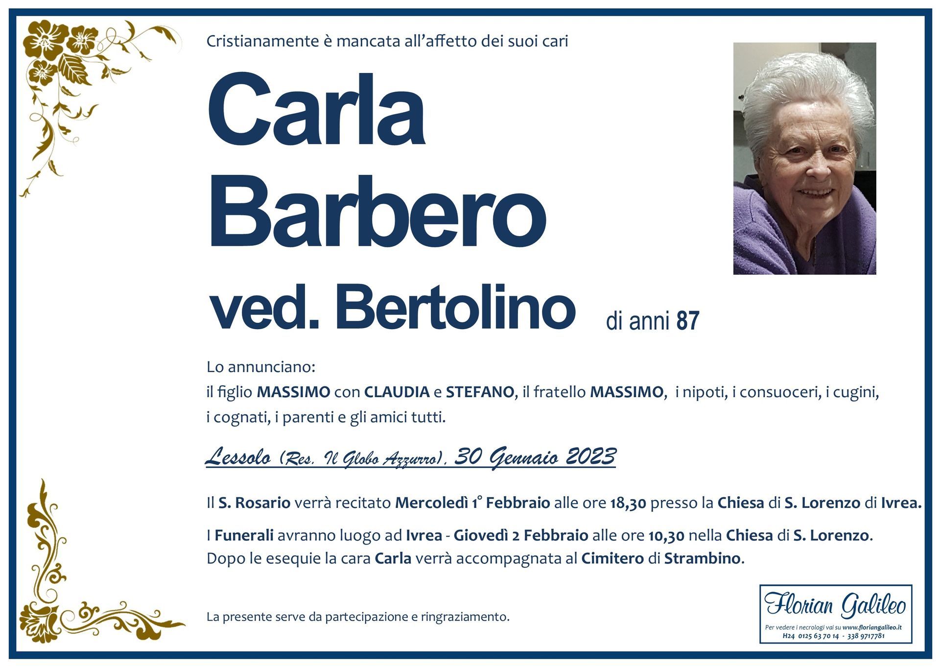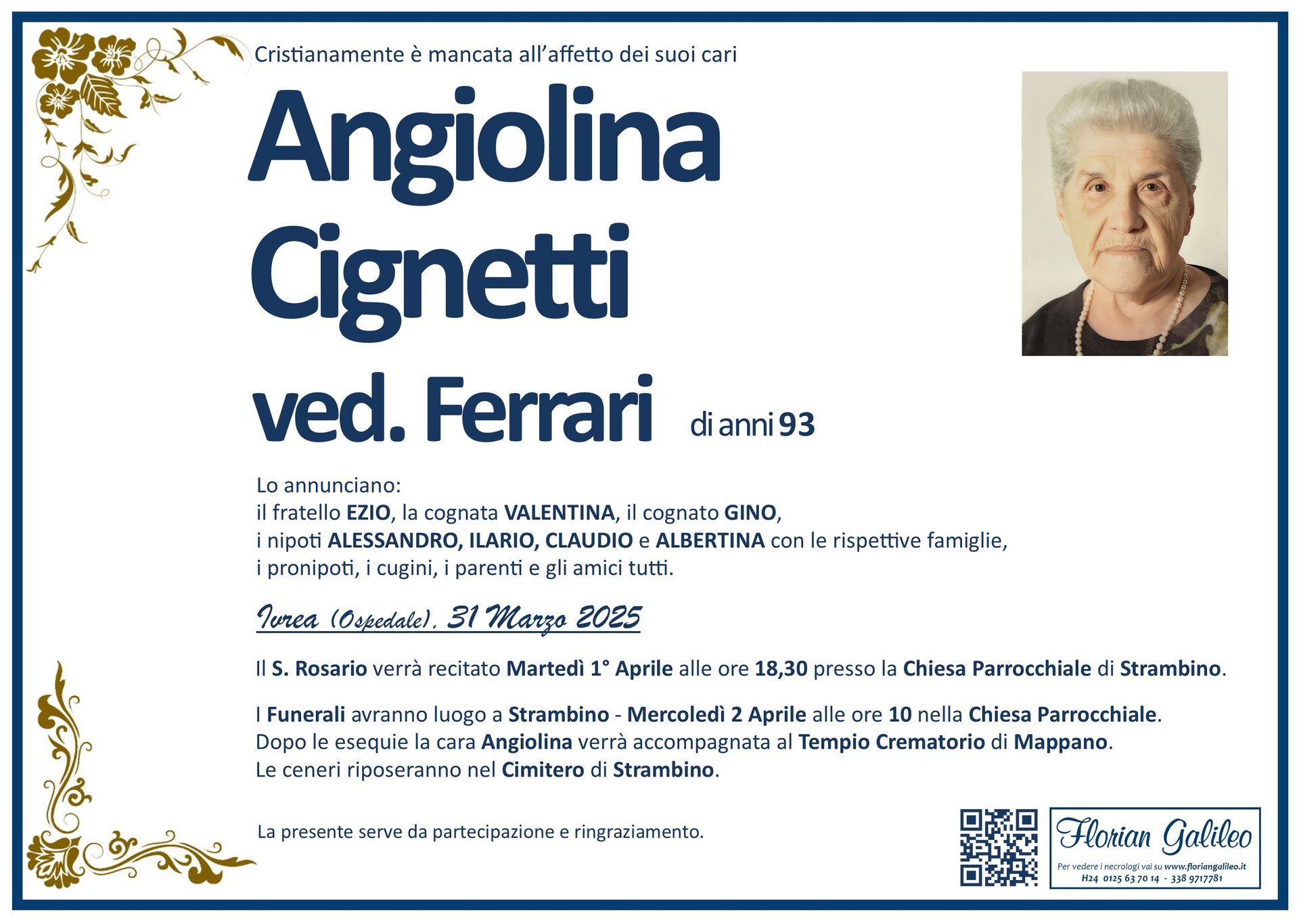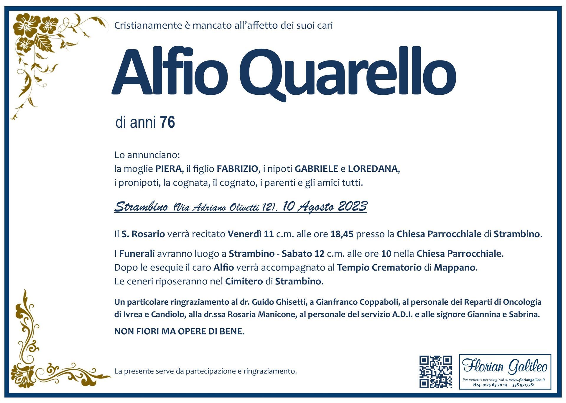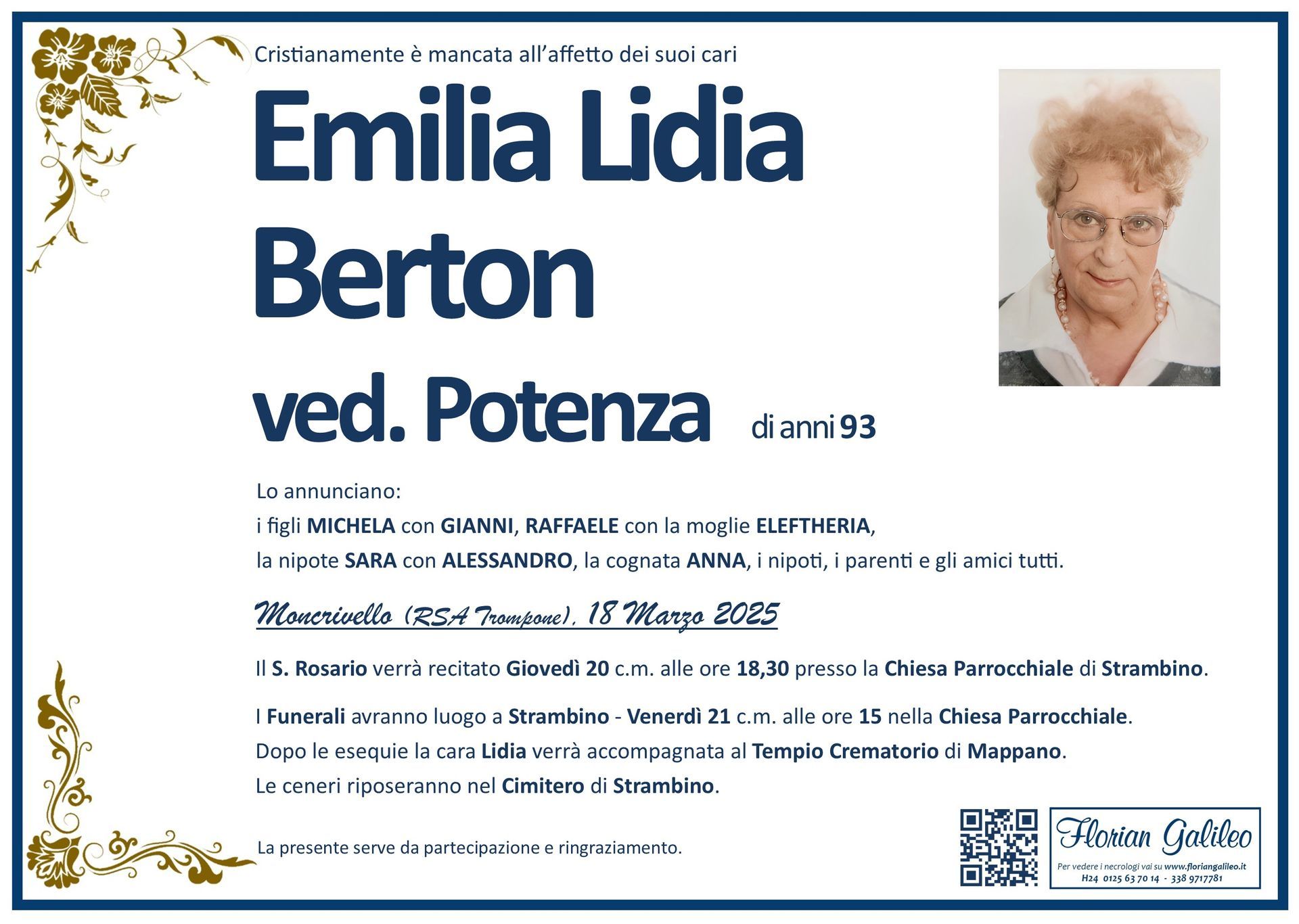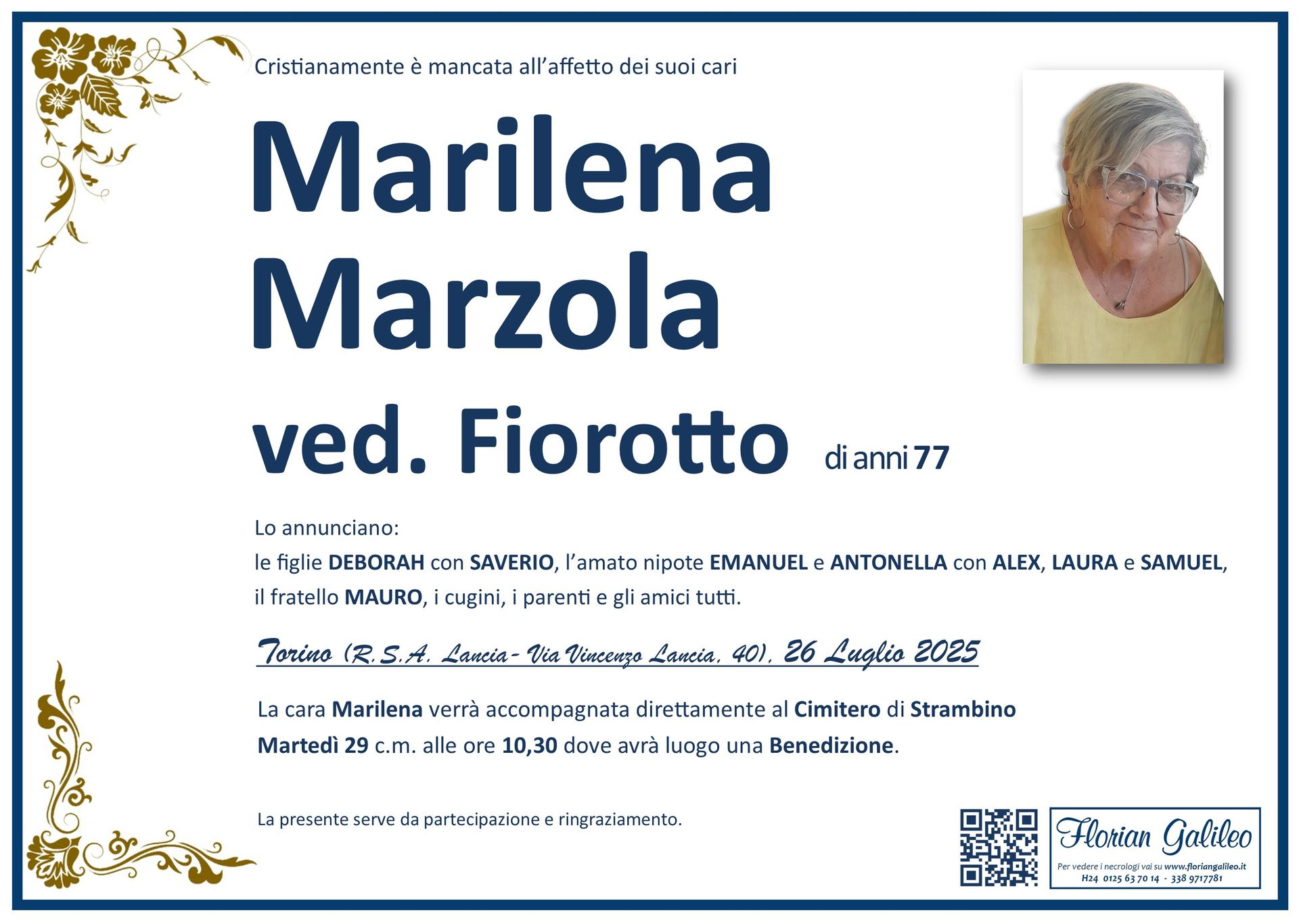 La Florian Galileo, ditta di Onoranze funebri di Strambino, Ivrea e dintorni ha creato questa pagina per rendere visibili anche on line le epigrafi dei cari defunti e per dare,