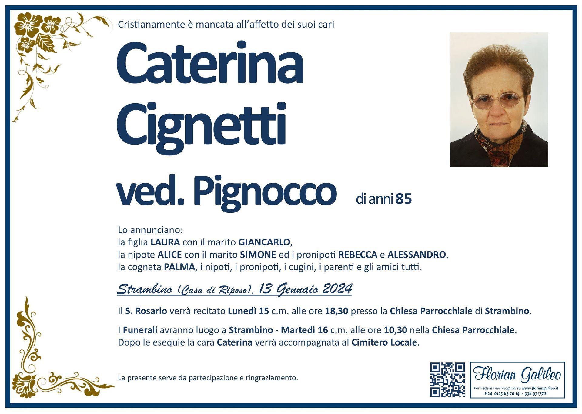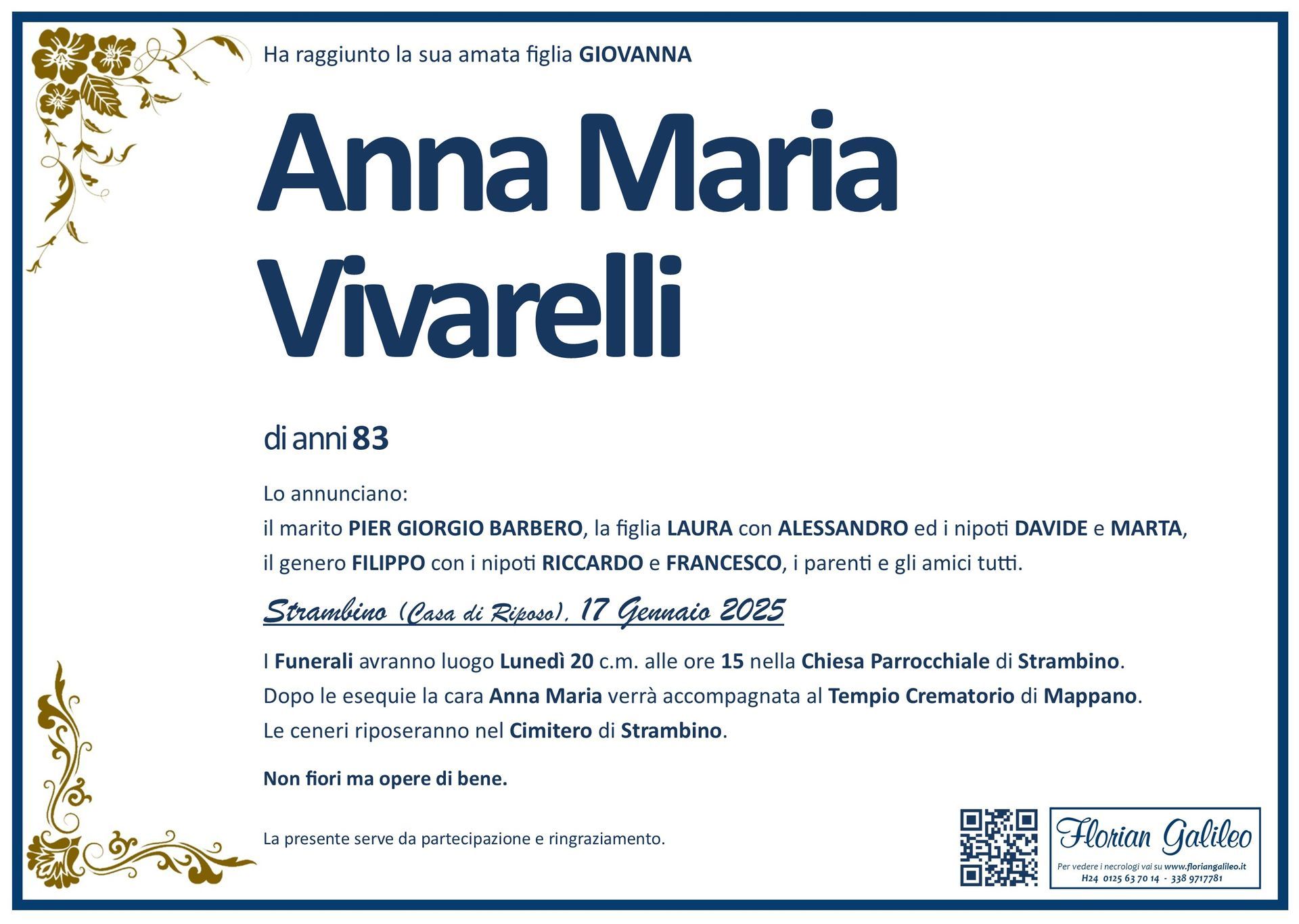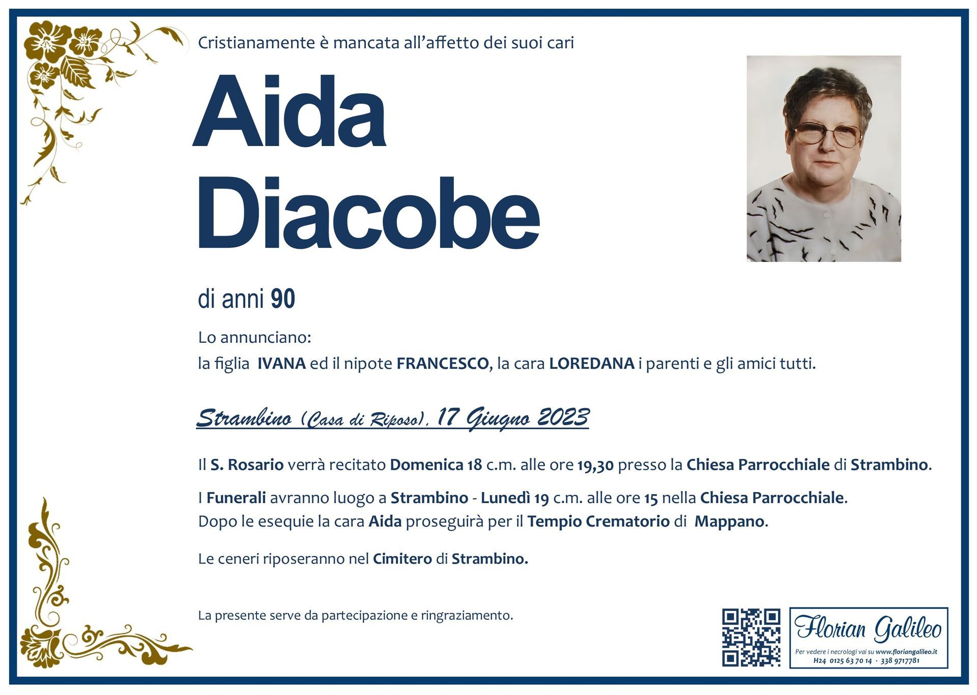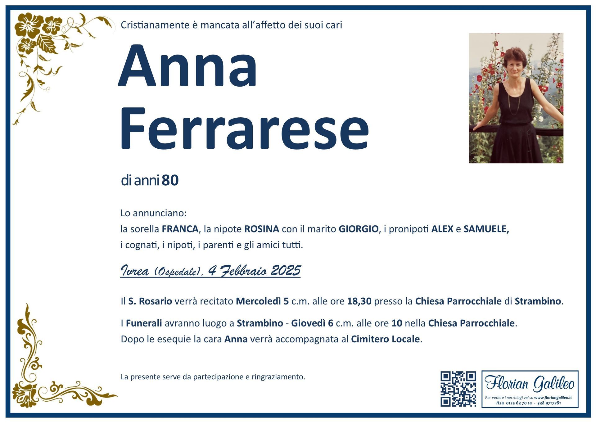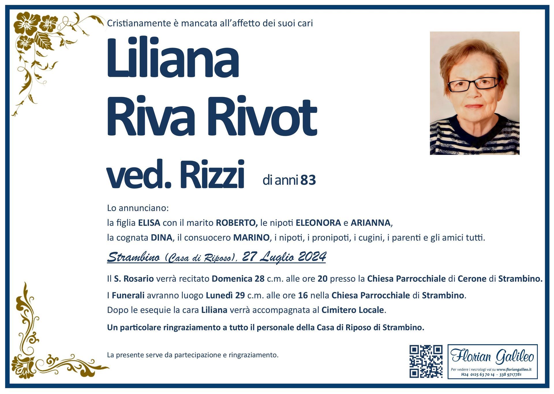 La Florian Galileo, ditta di Onoranze funebri di Strambino, Ivrea e dintorni ha creato questa pagina per rendere visibili anche on line le epigrafi dei cari defunti e per dare,