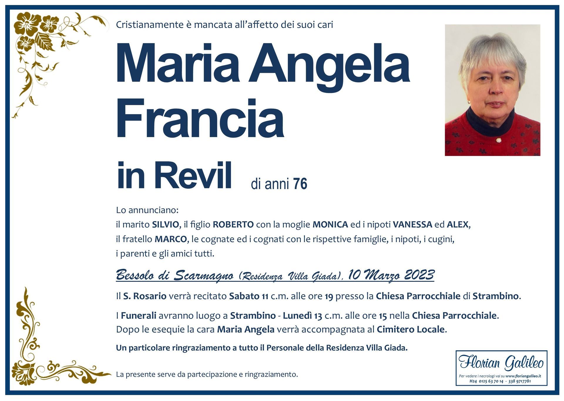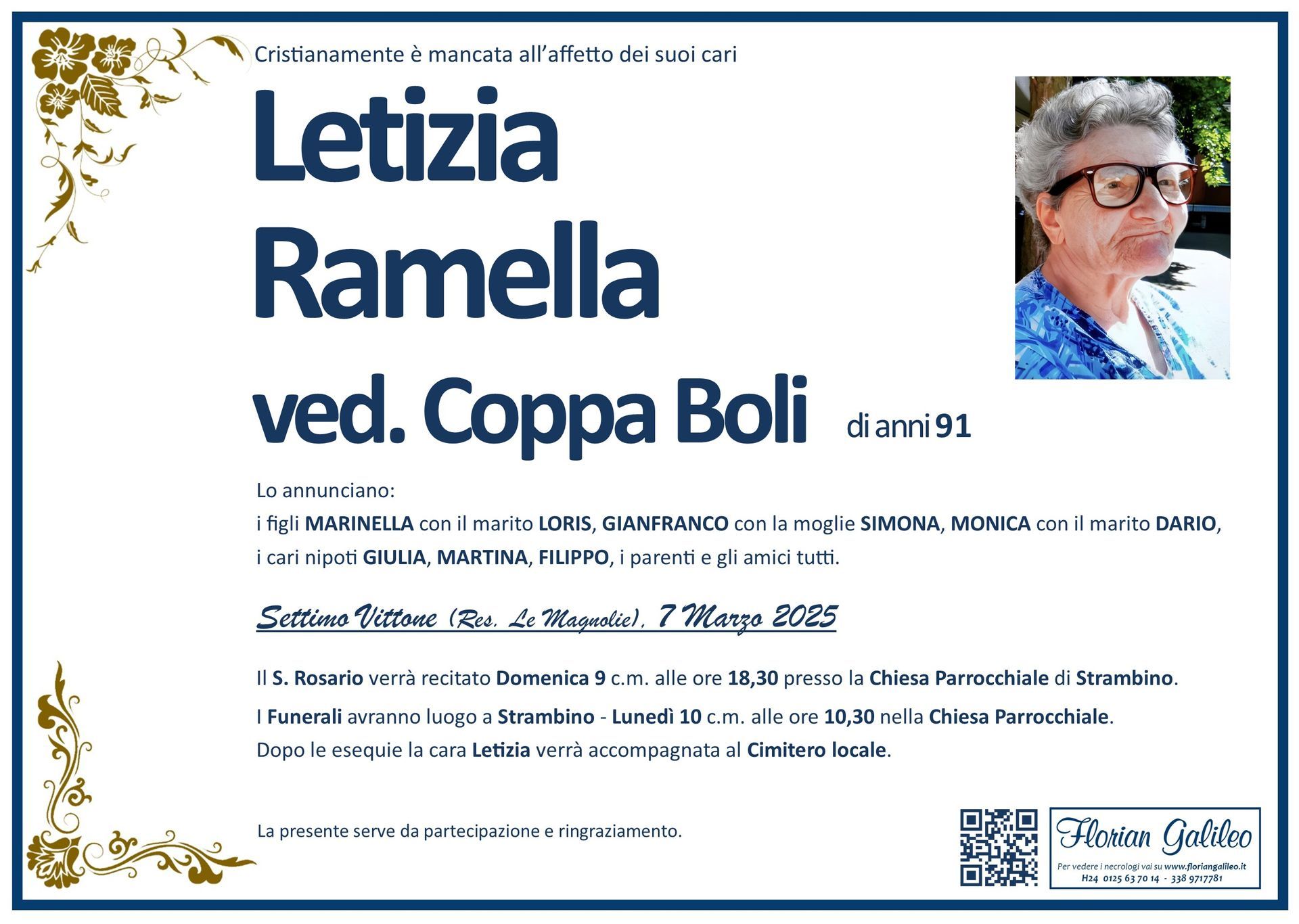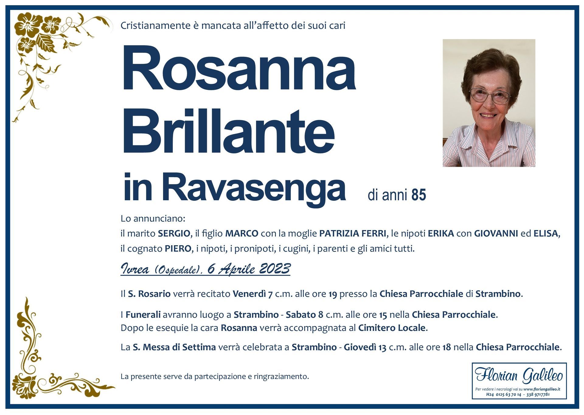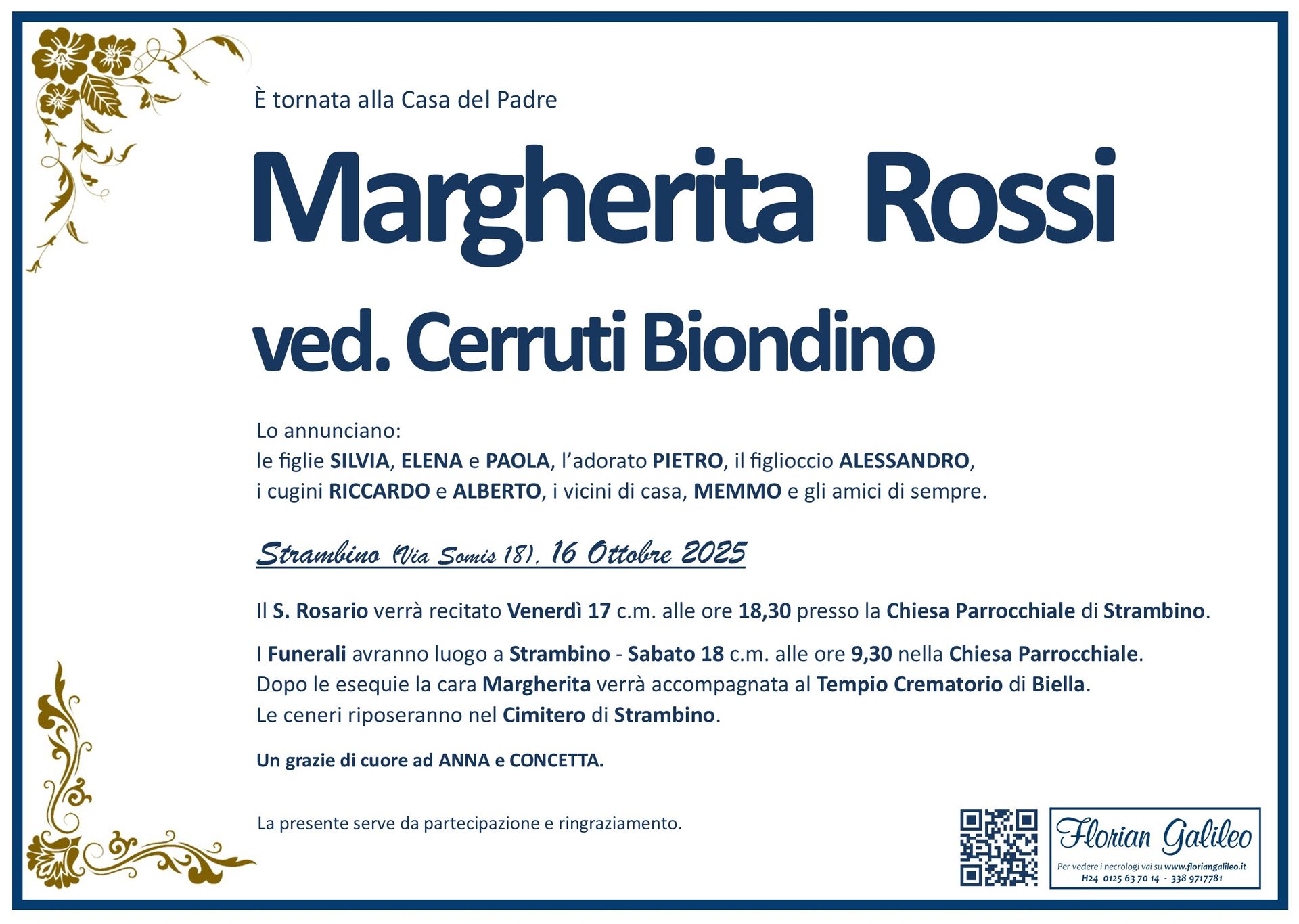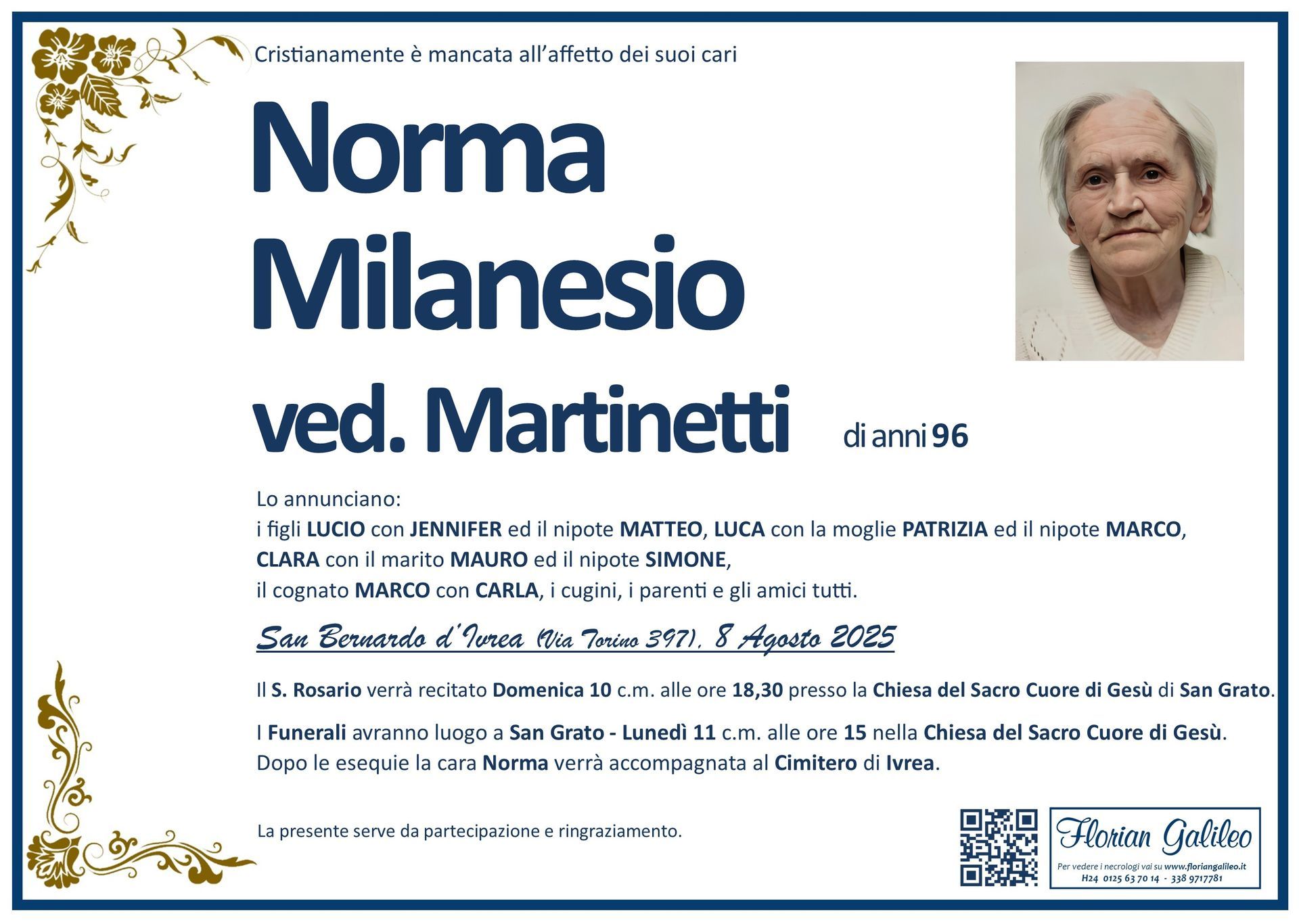 La Florian Galileo, ditta di Onoranze funebri di Strambino, Ivrea e dintorni ha creato questa pagina per rendere visibili anche on line le epigrafi dei cari defunti e per dare,