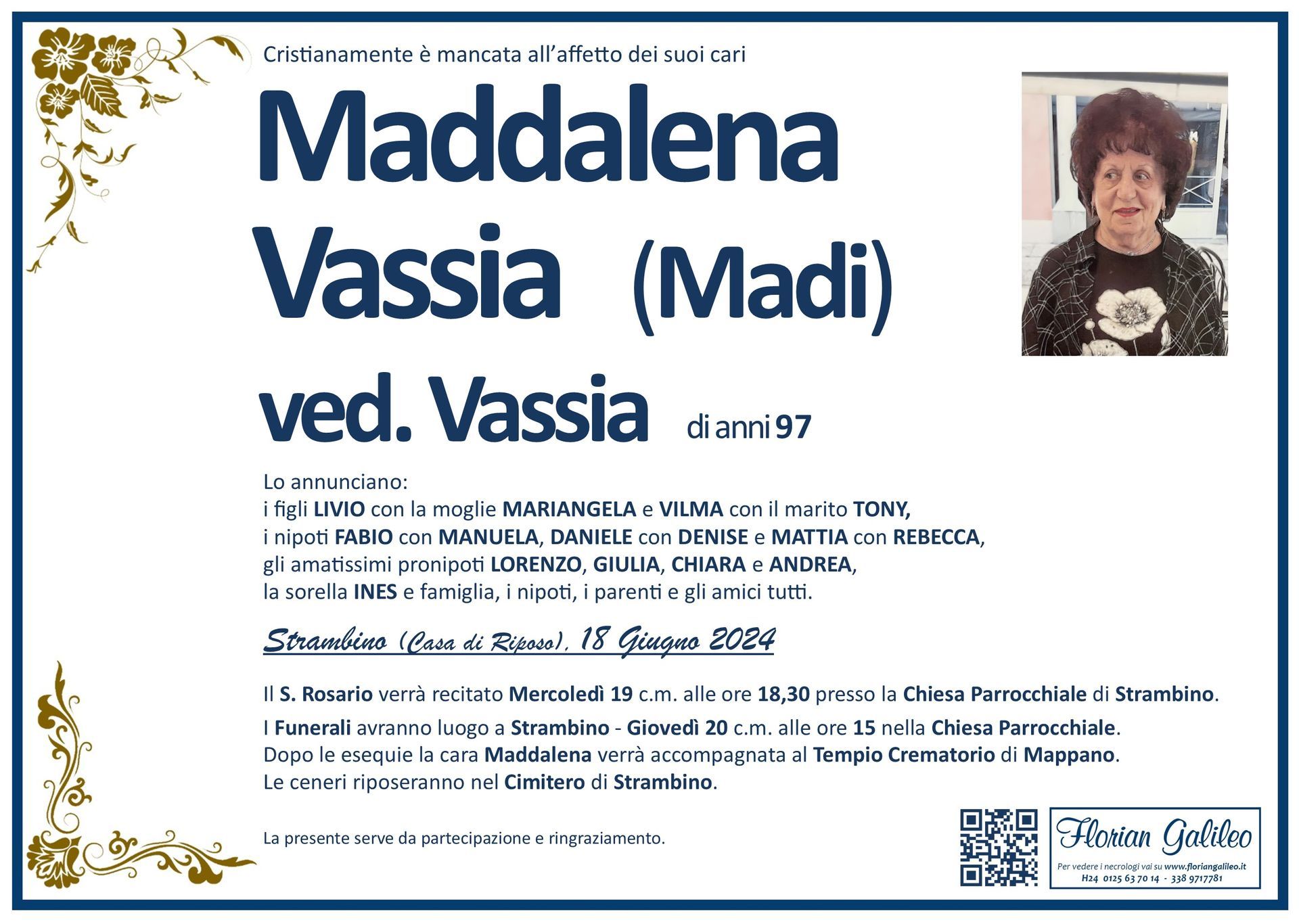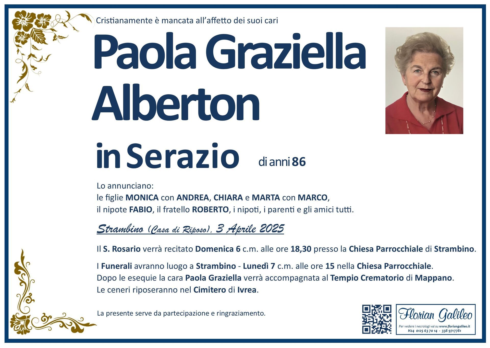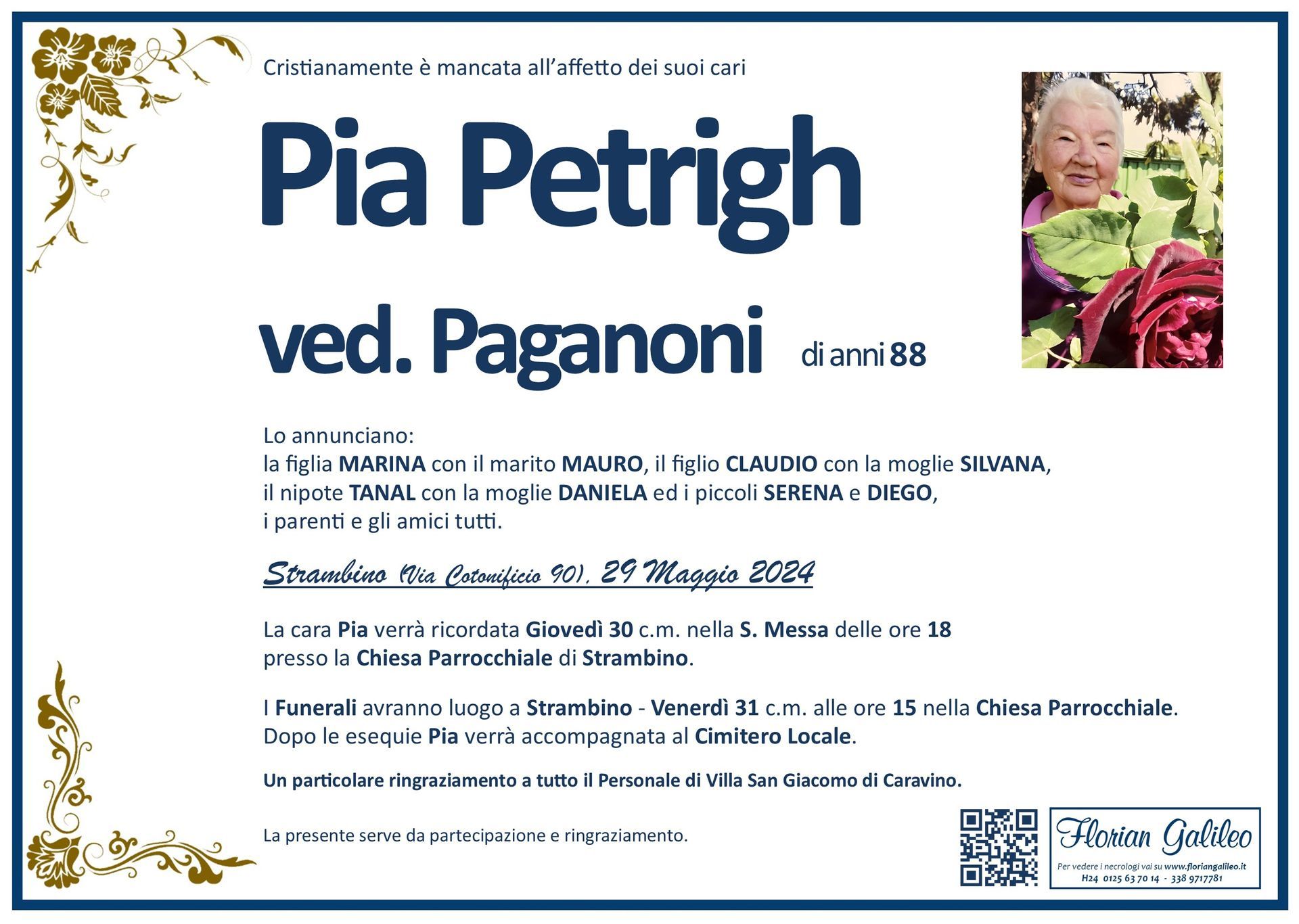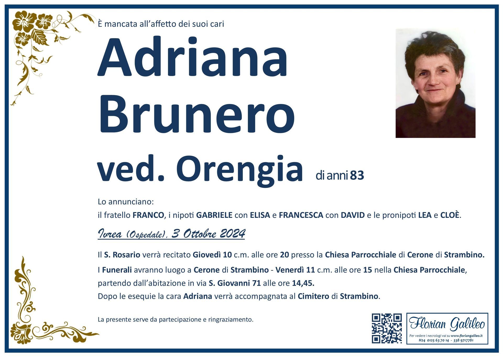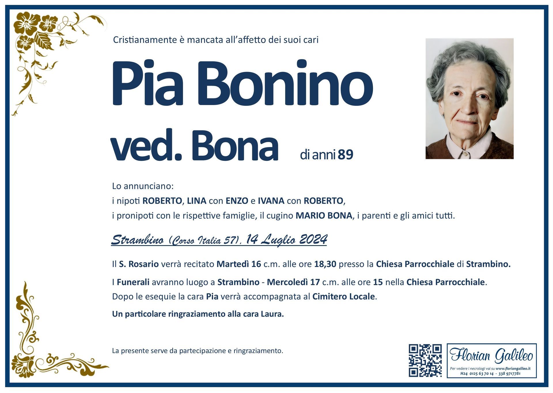 La Florian Galileo, ditta di Onoranze funebri di Strambino, Ivrea e dintorni ha creato questa pagina per rendere visibili anche on line le epigrafi dei cari defunti e per dare,