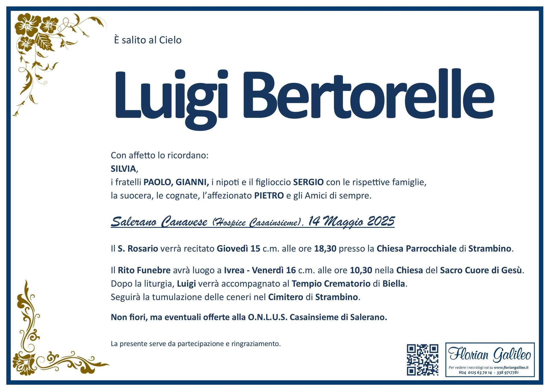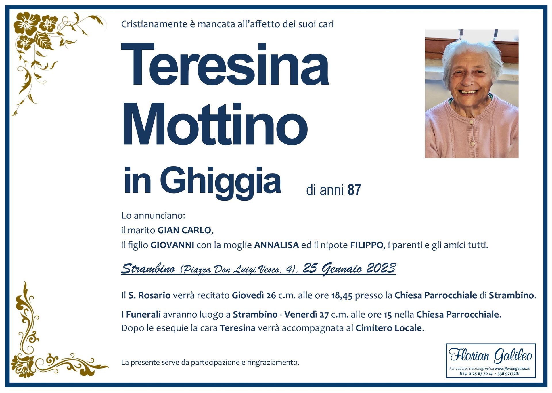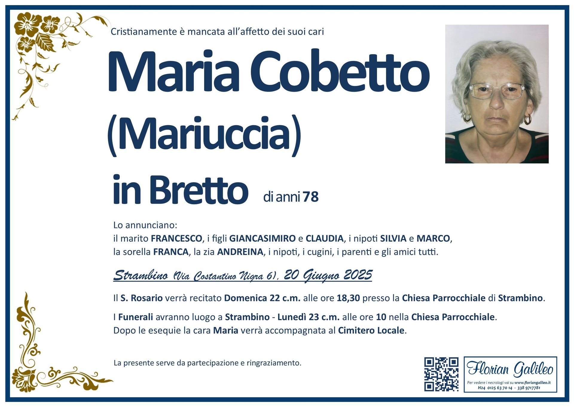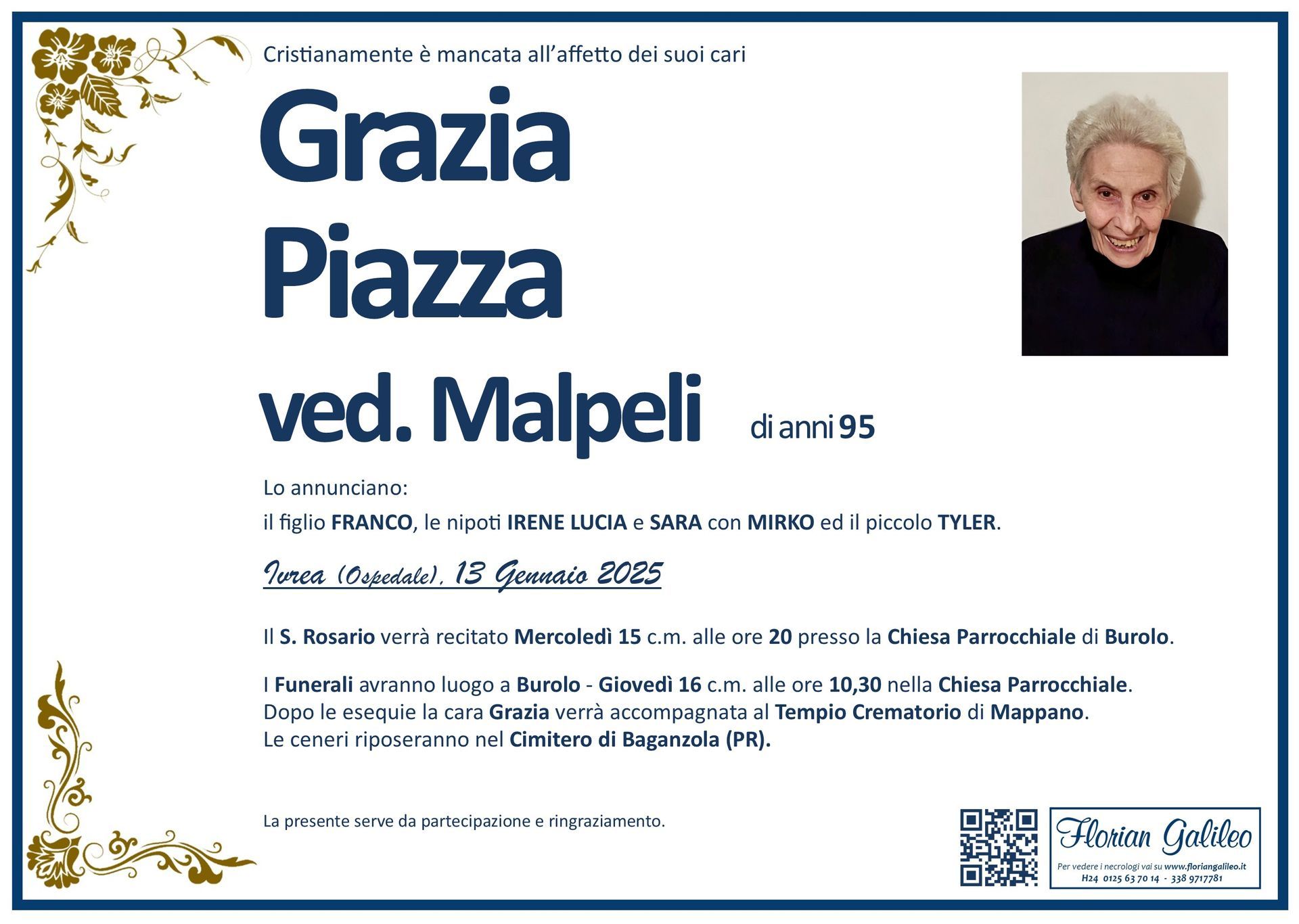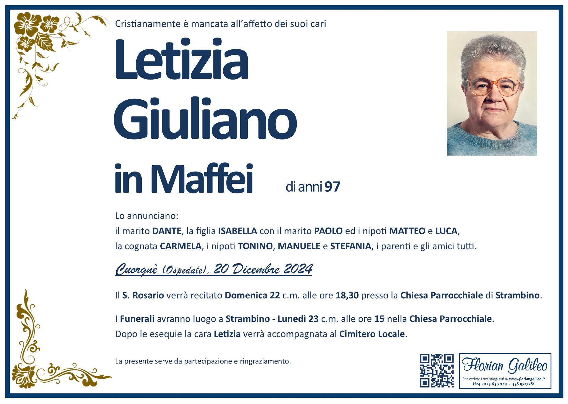 La Florian Galileo, ditta di Onoranze funebri di Strambino, Ivrea e dintorni ha creato questa pagina per rendere visibili anche on line le epigrafi dei cari defunti e per dare,