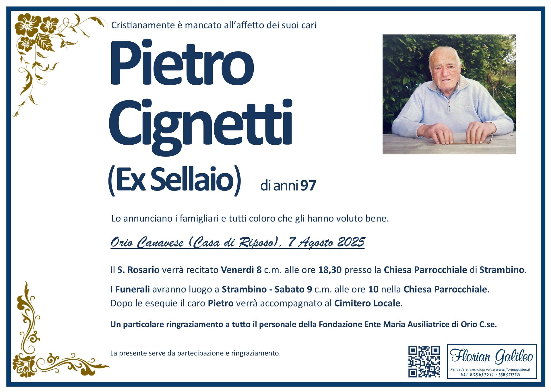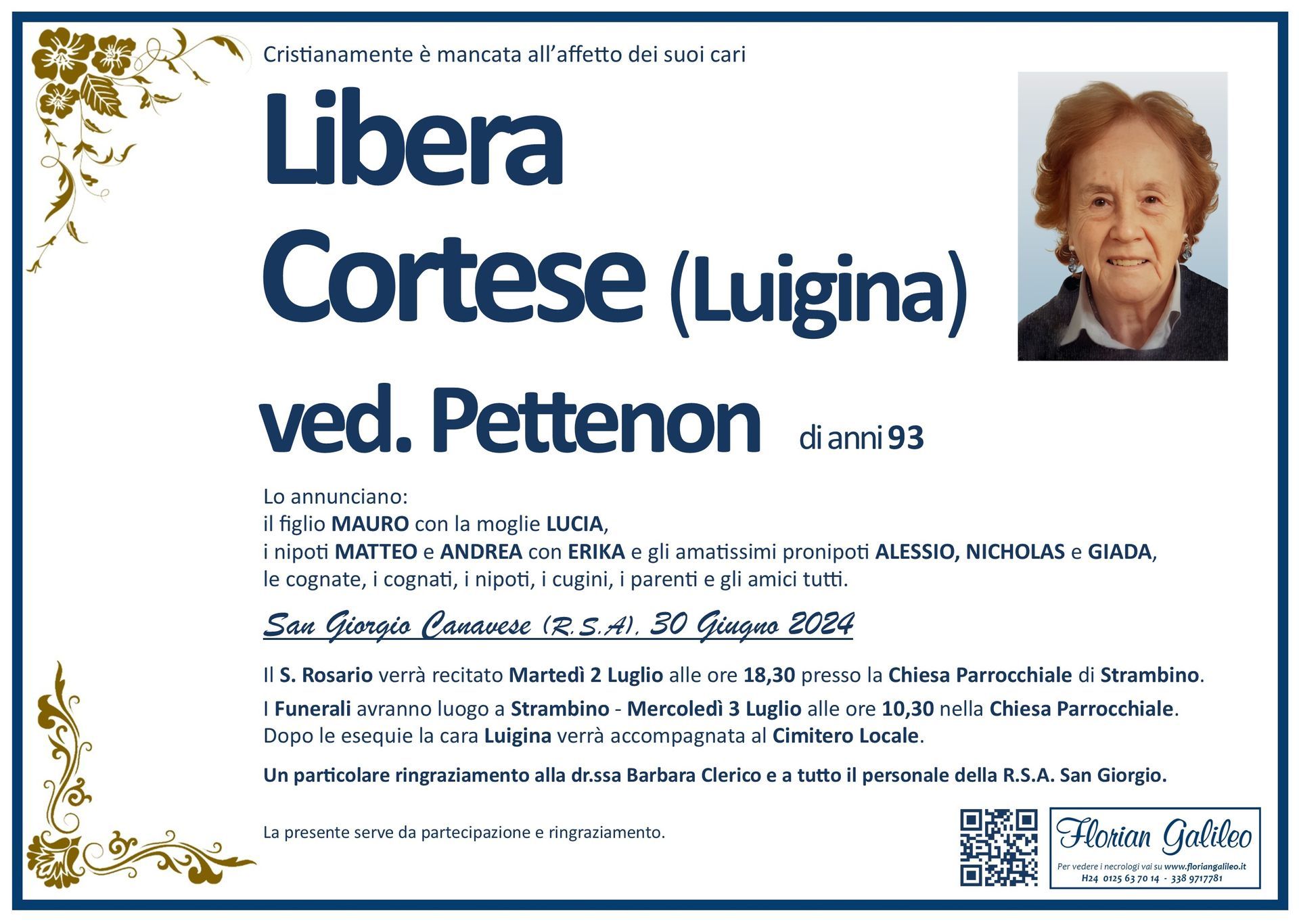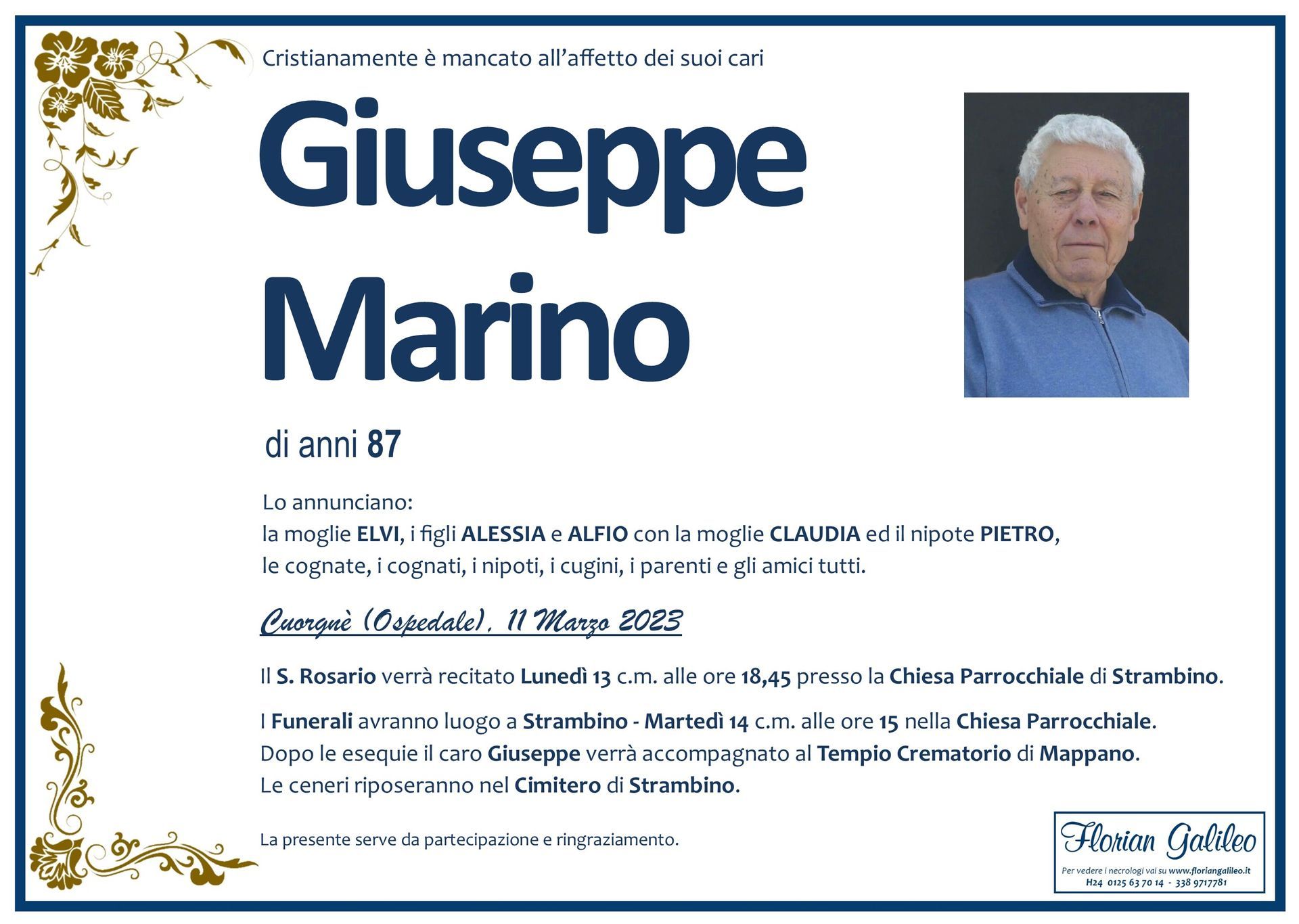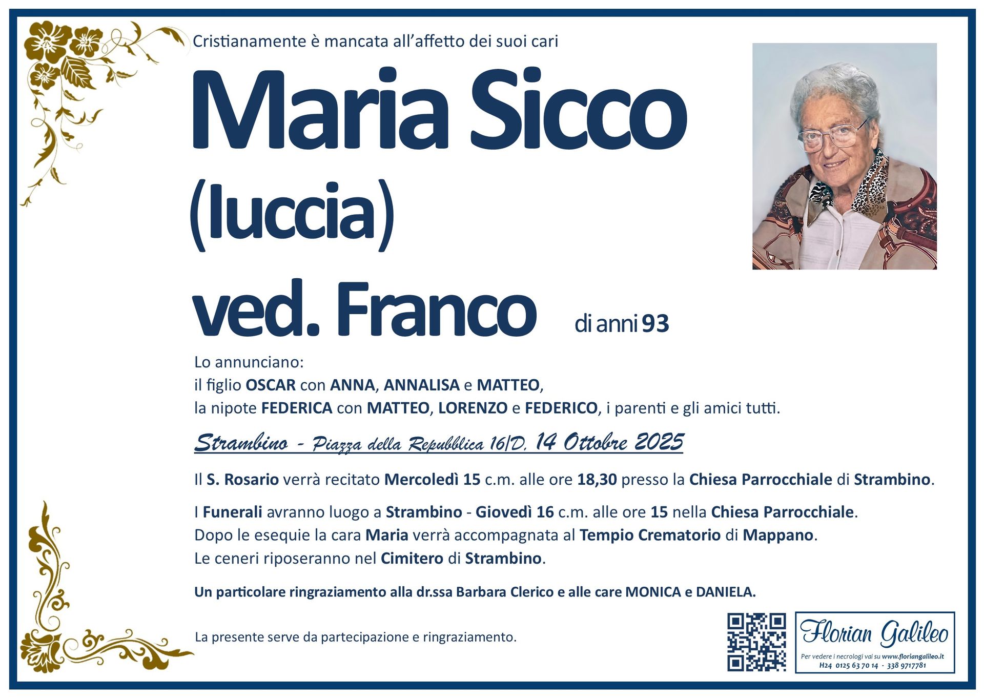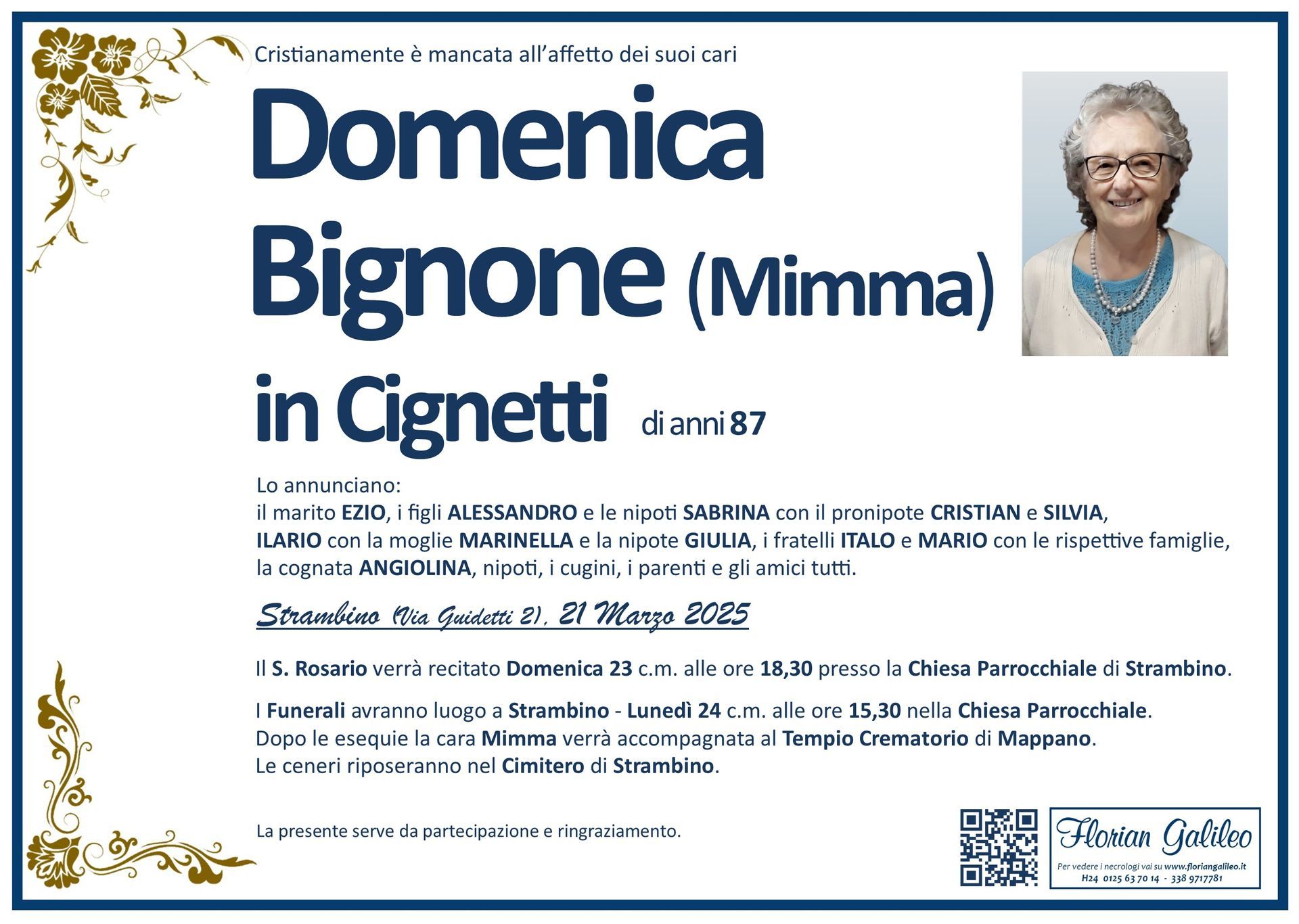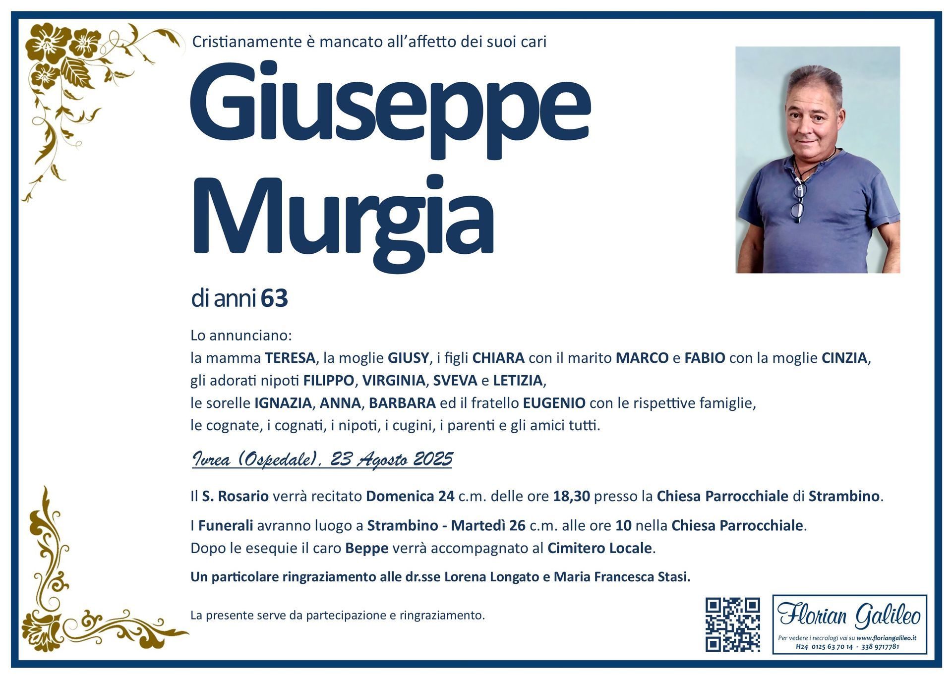 La Florian Galileo, ditta di Onoranze funebri di Strambino, Ivrea e dintorni ha creato questa pagina per rendere visibili anche on line le epigrafi dei cari defunti e per dare,