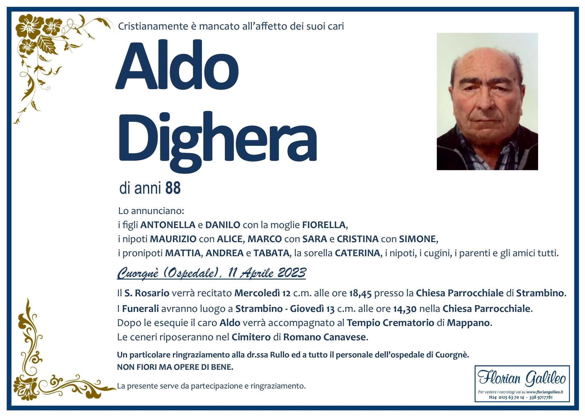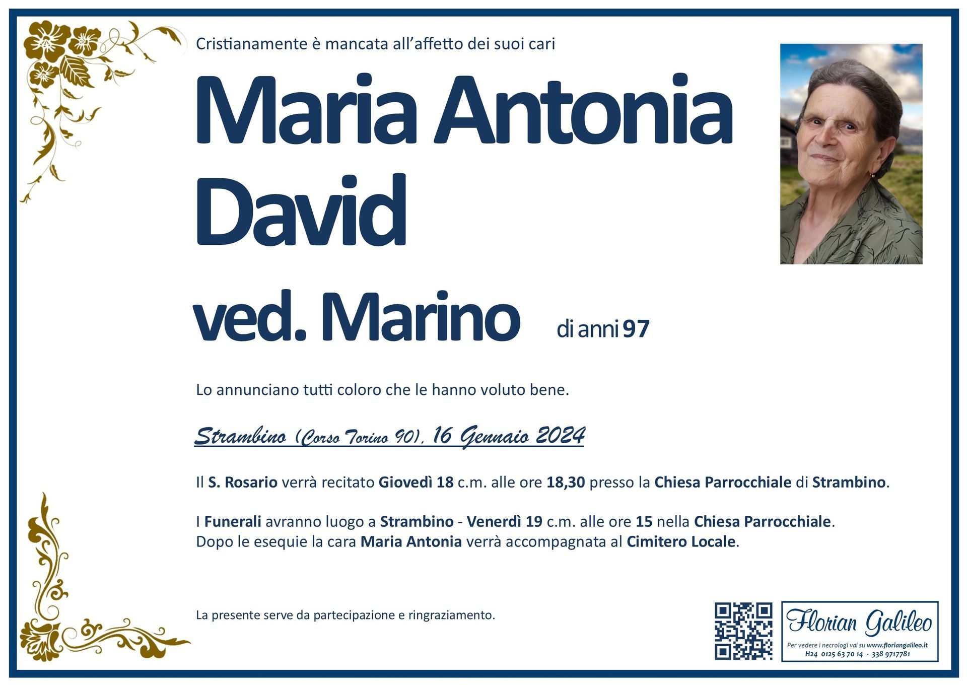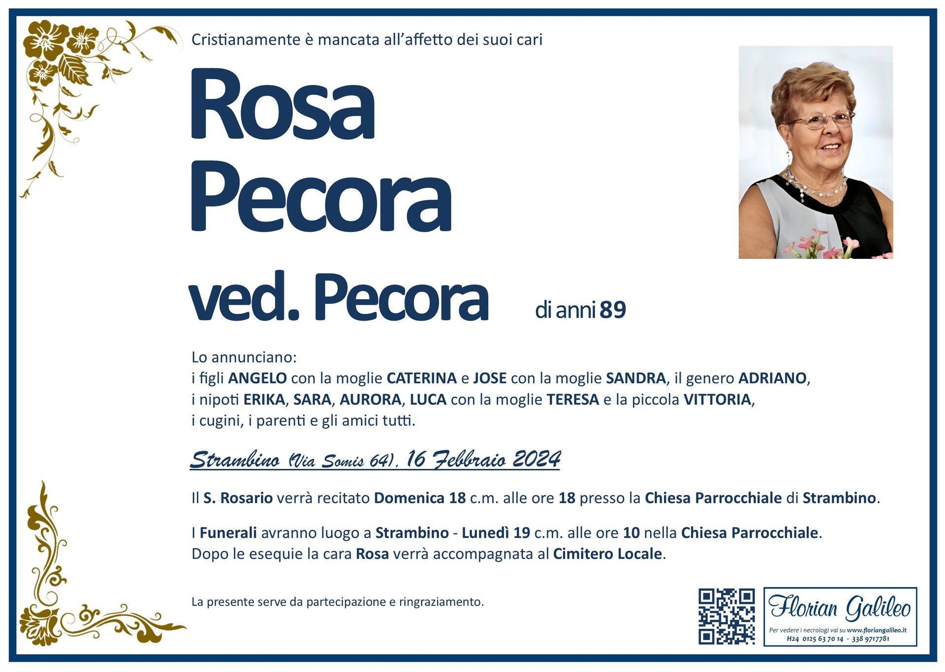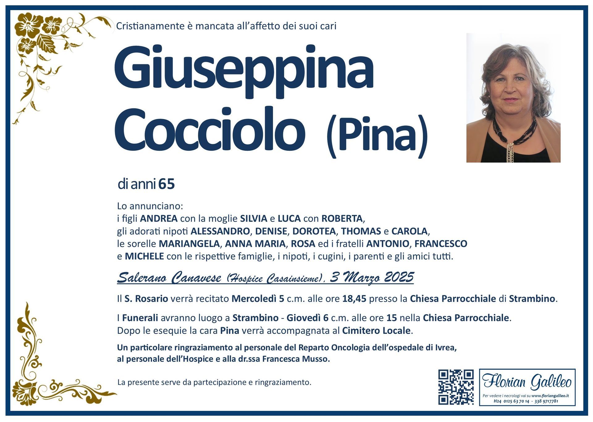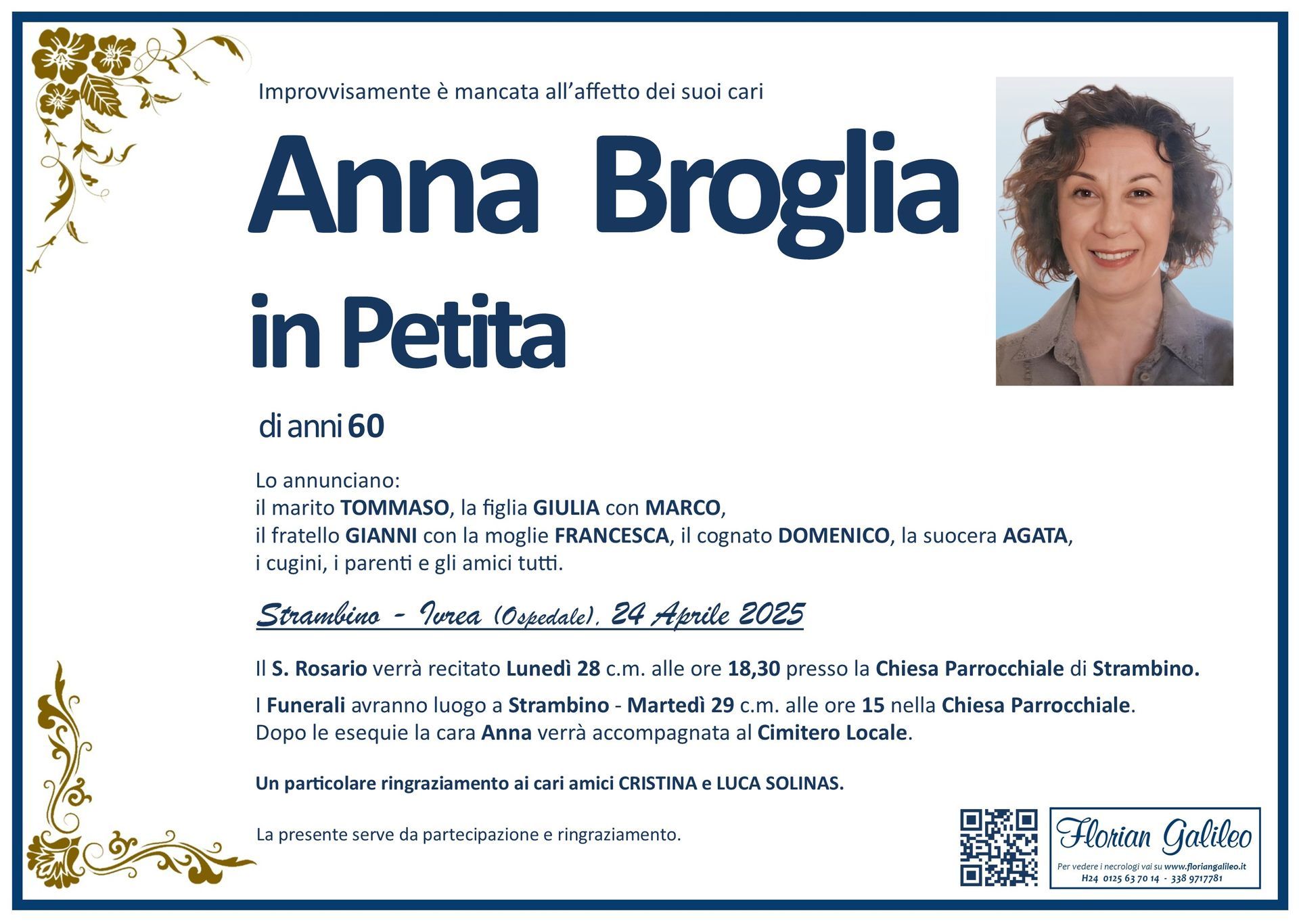 La Florian Galileo, ditta di Onoranze funebri di Strambino, Ivrea e dintorni ha creato questa pagina per rendere visibili anche on line le epigrafi dei cari defunti e per dare,