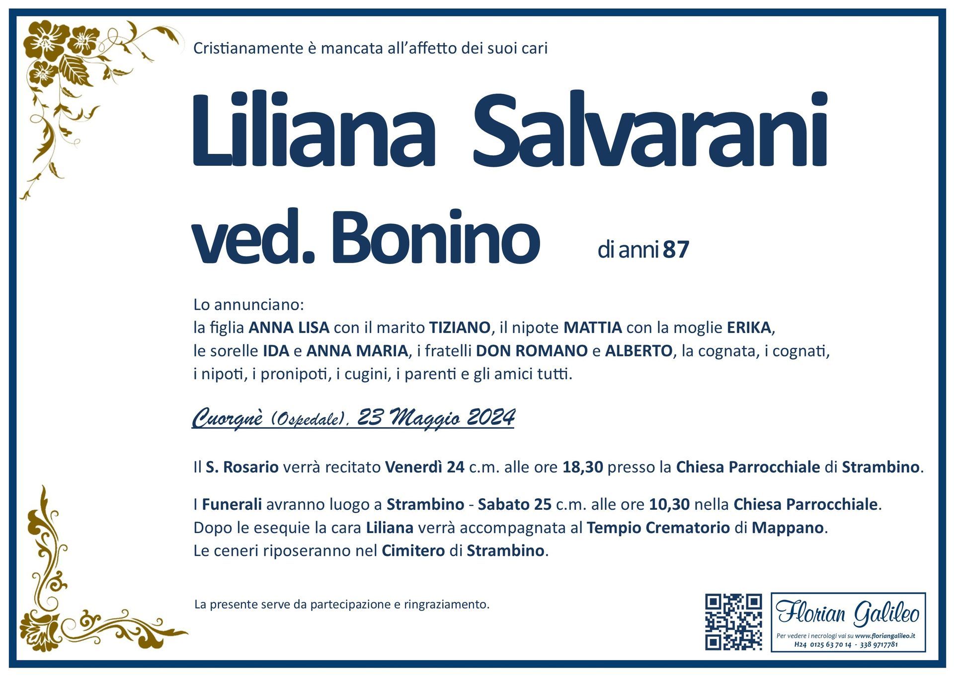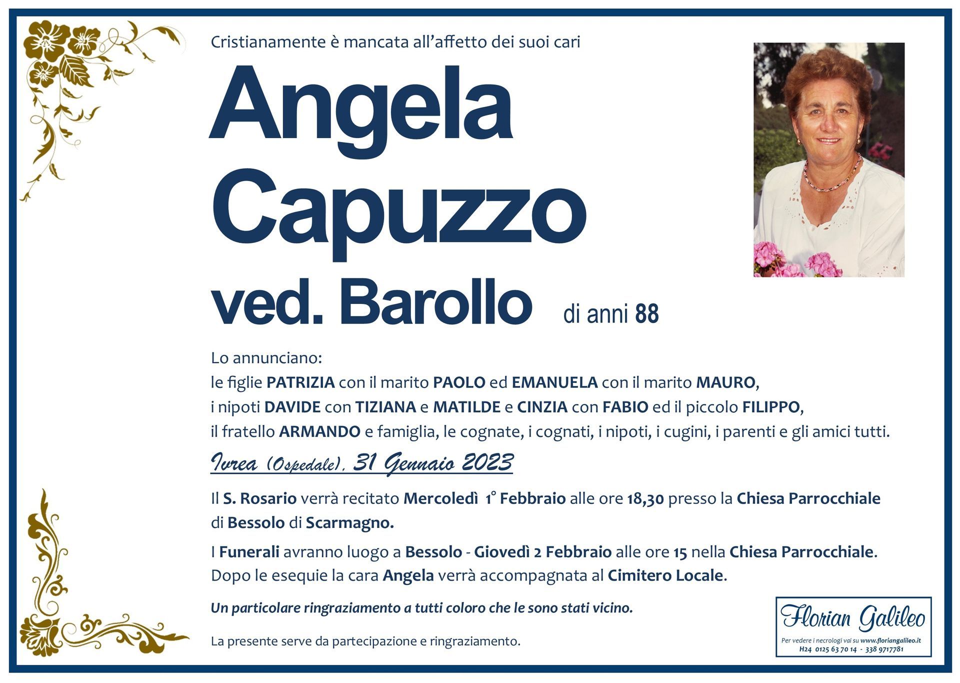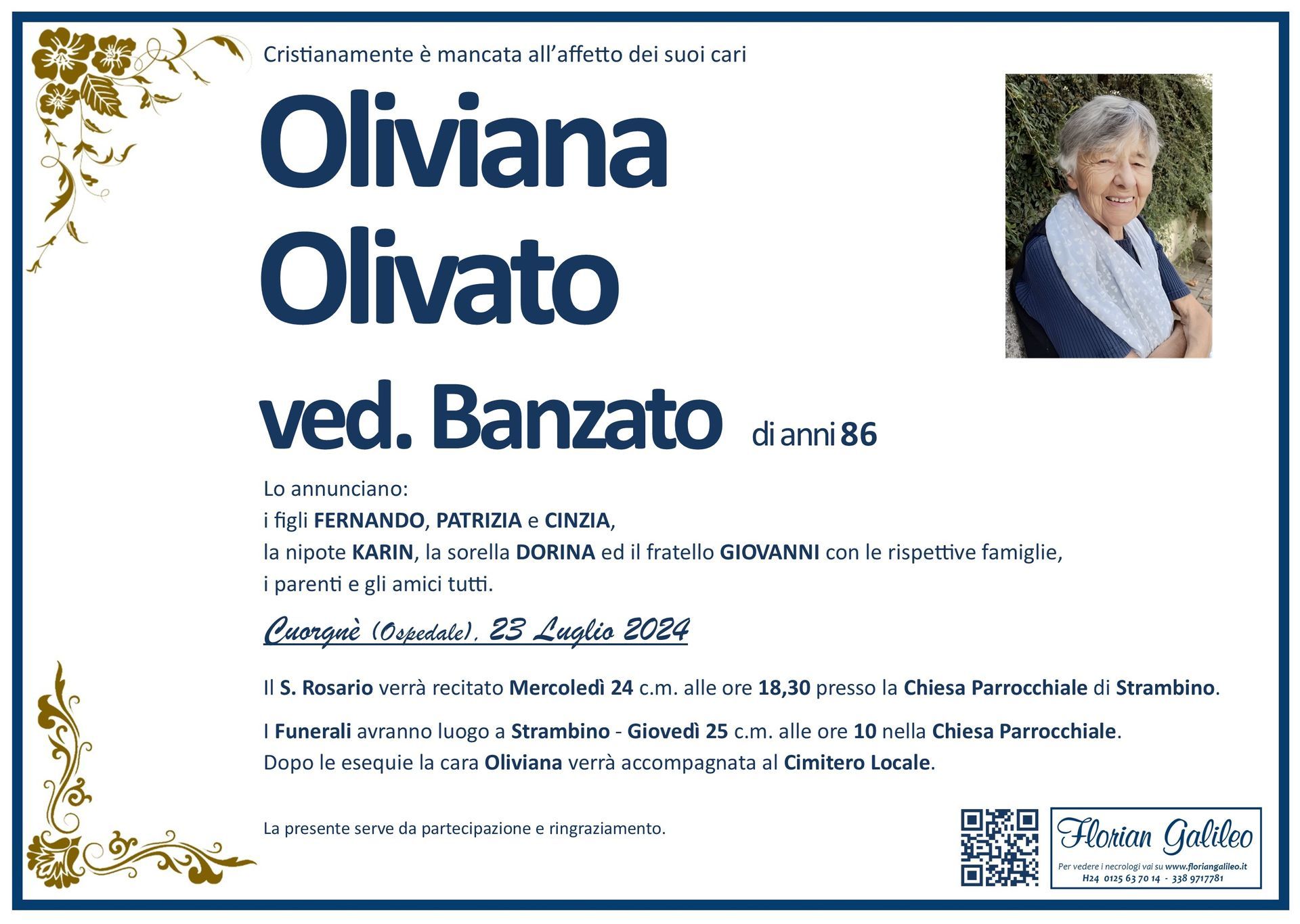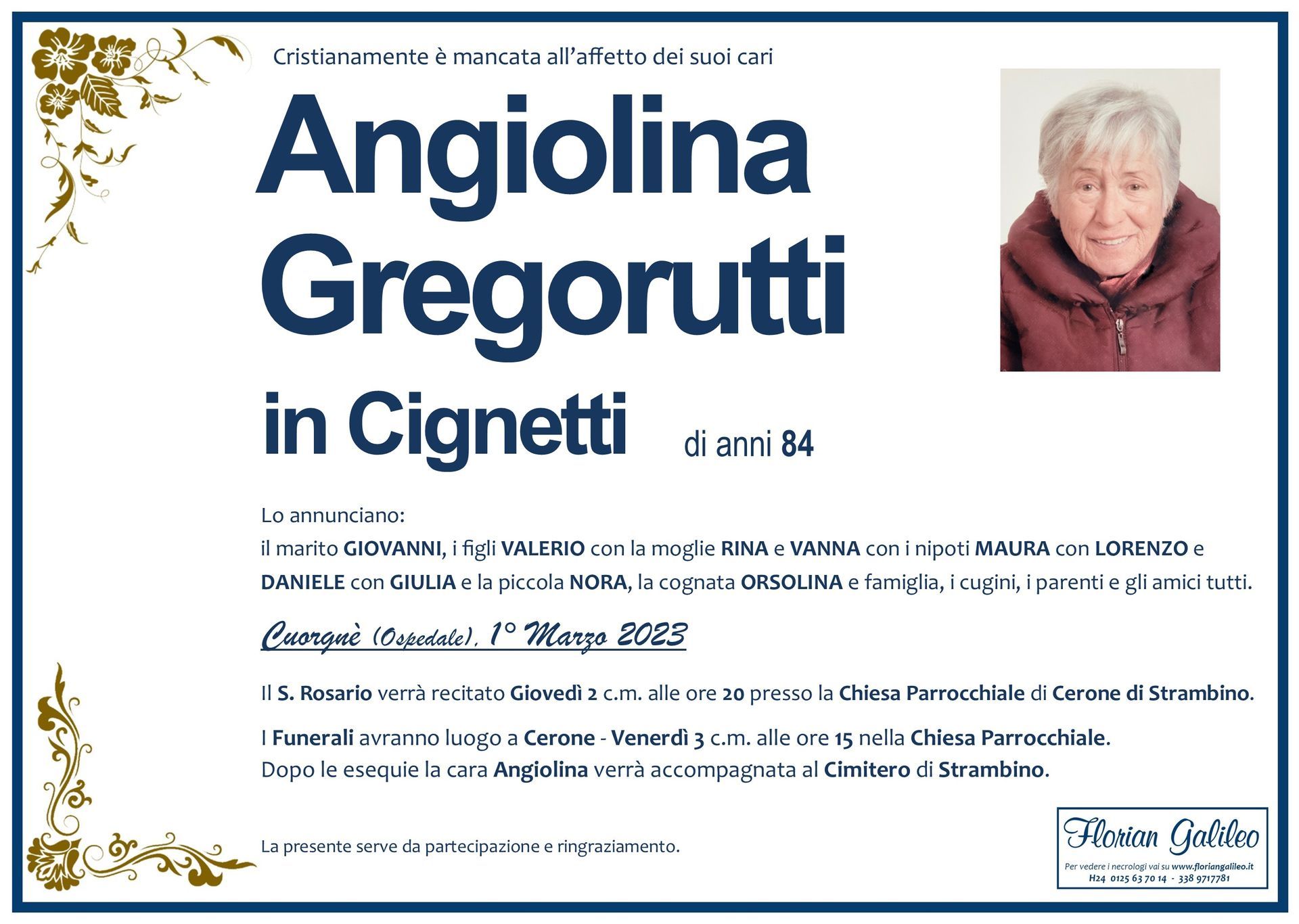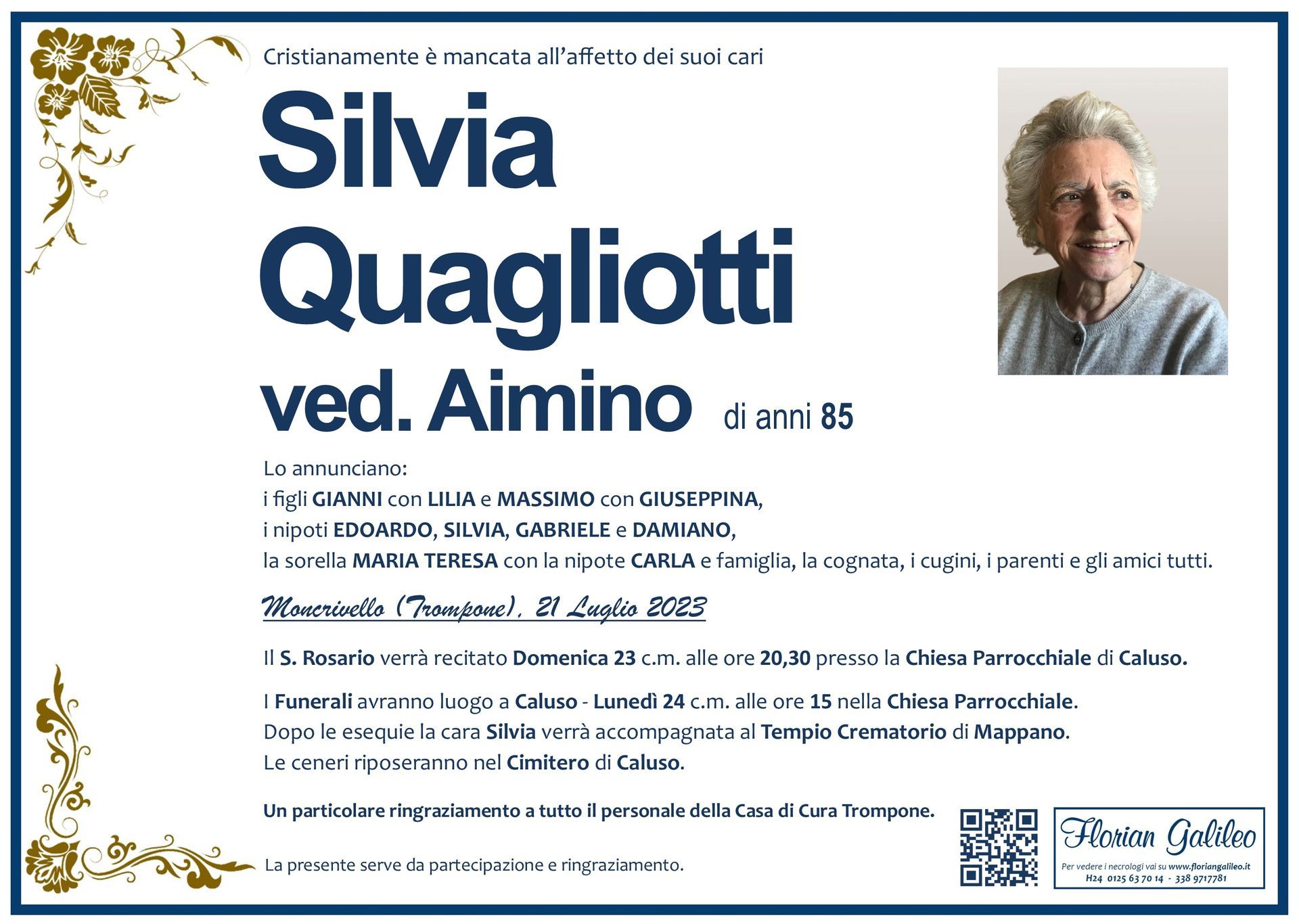 La Florian Galileo, ditta di Onoranze funebri di Strambino, Ivrea e dintorni ha creato questa pagina per rendere visibili anche on line le epigrafi dei cari defunti e per dare,