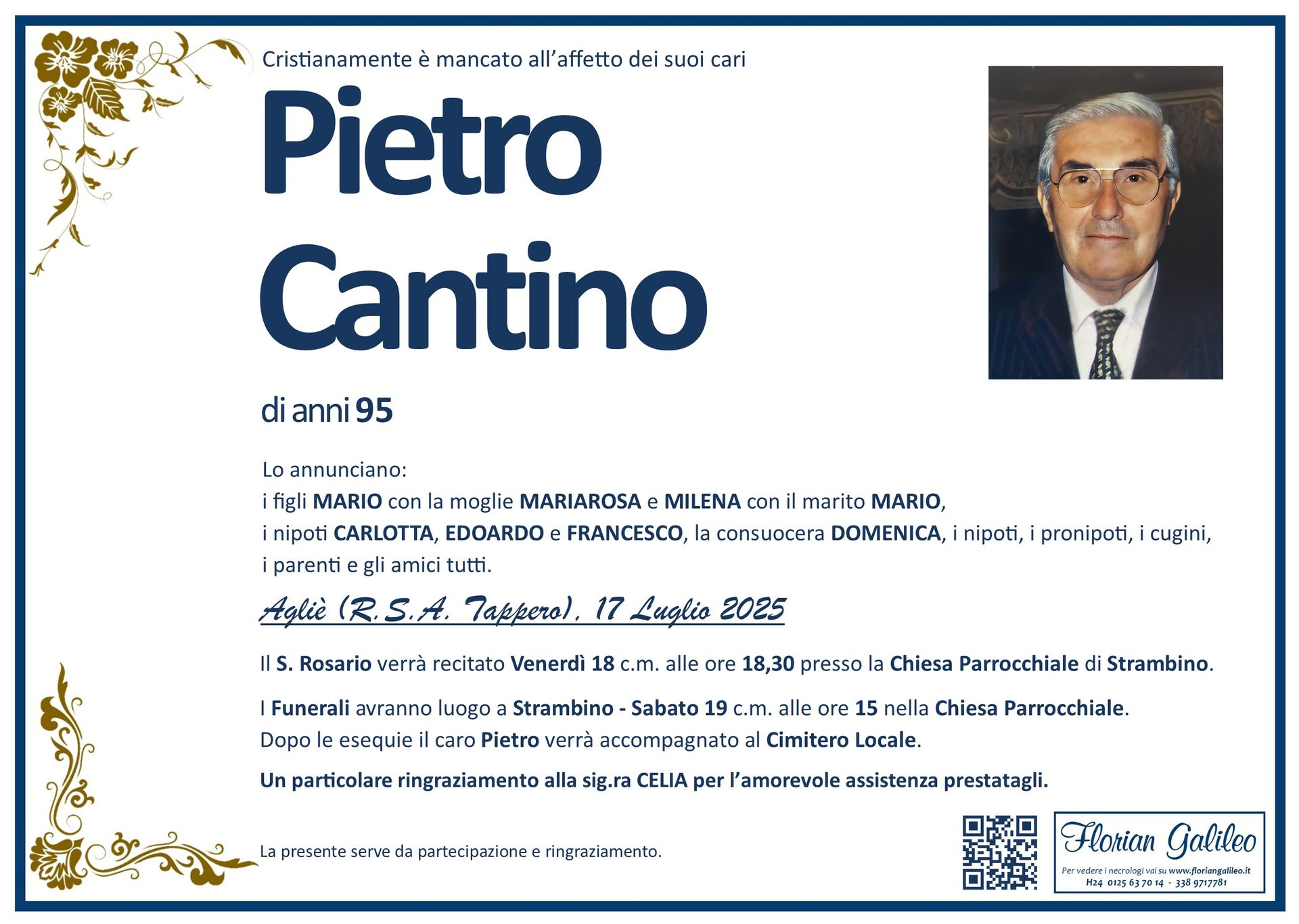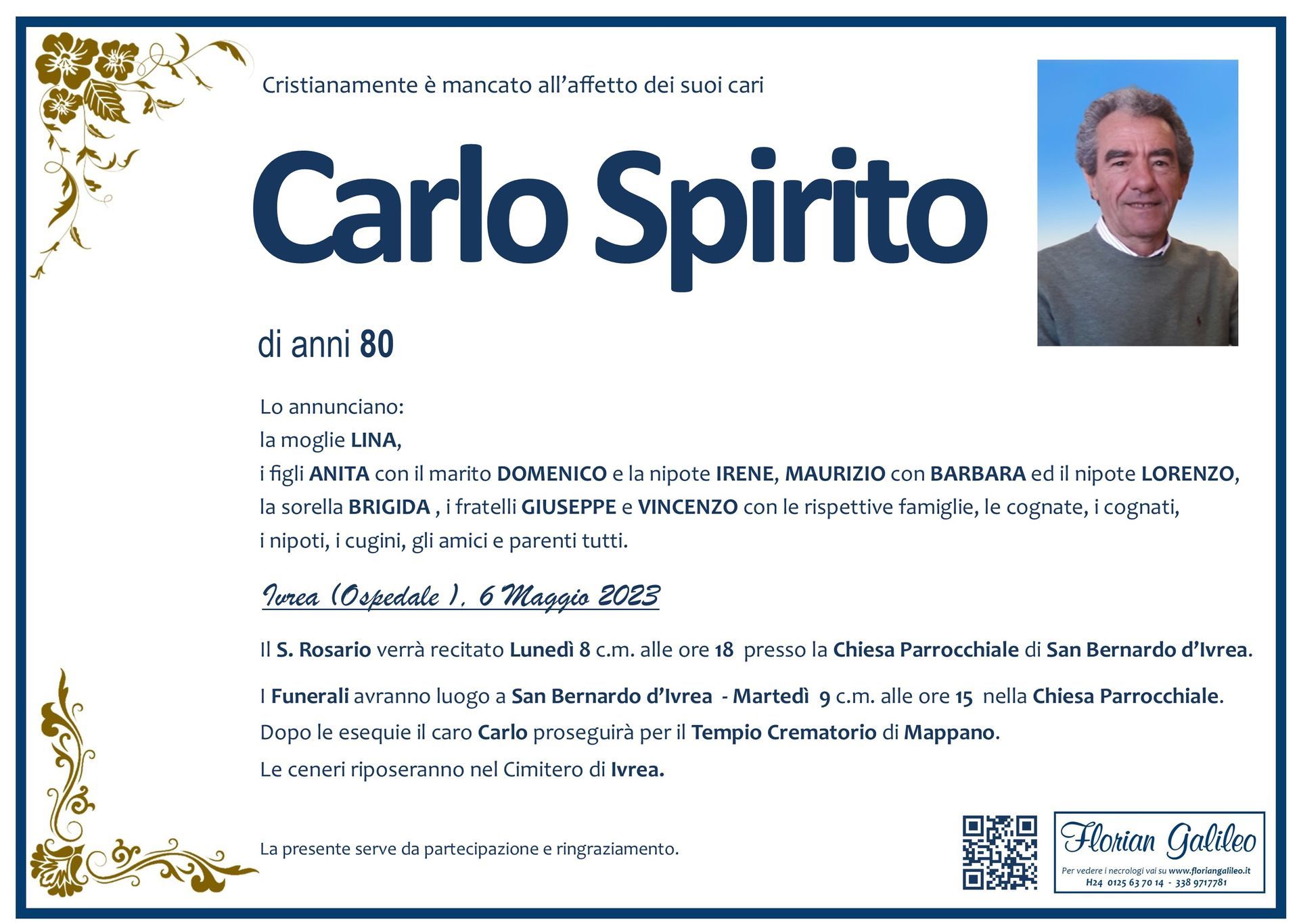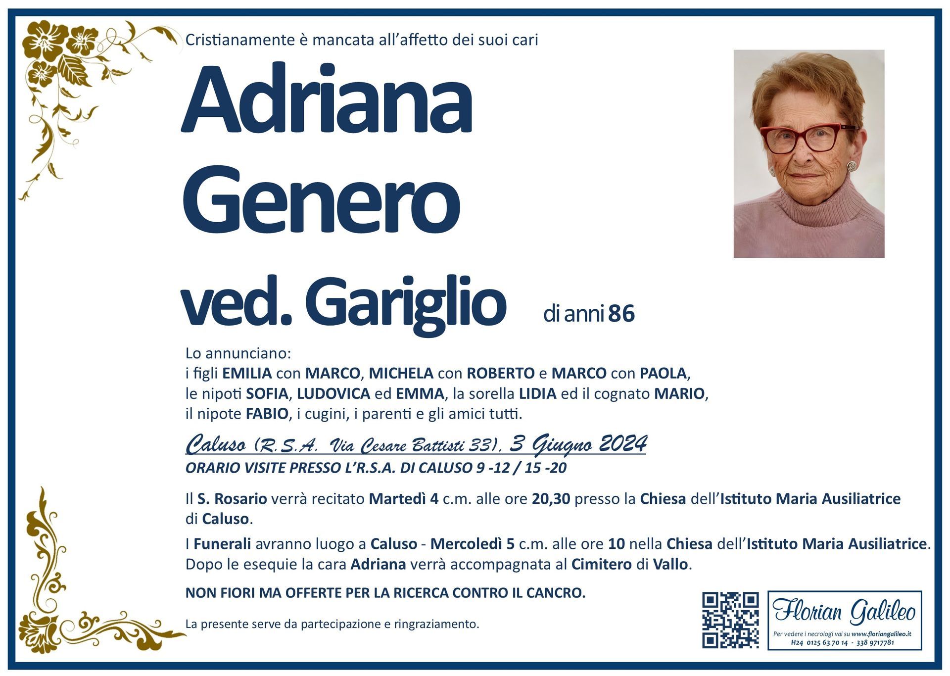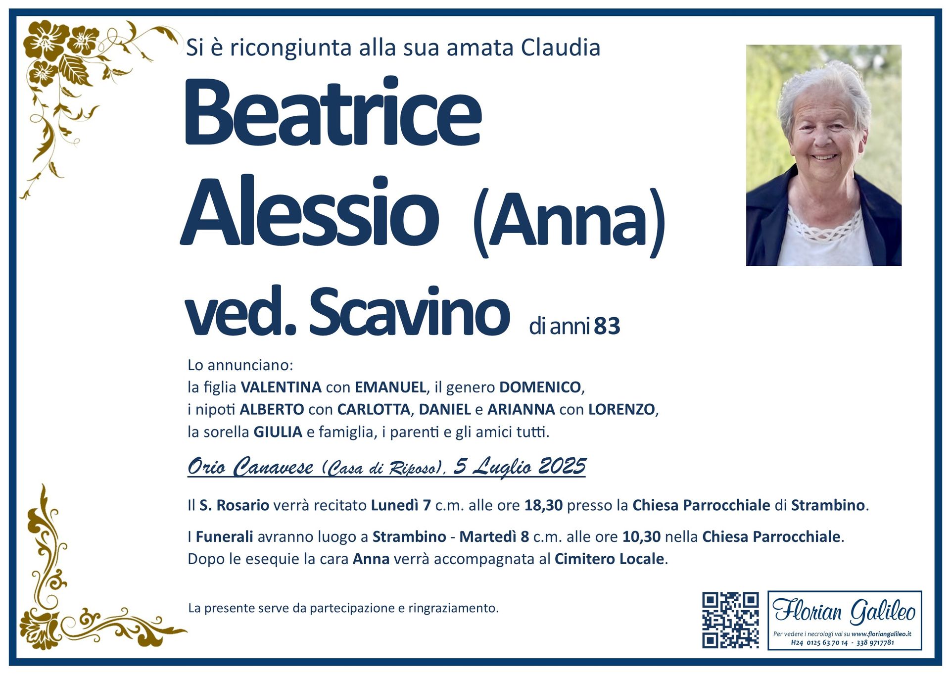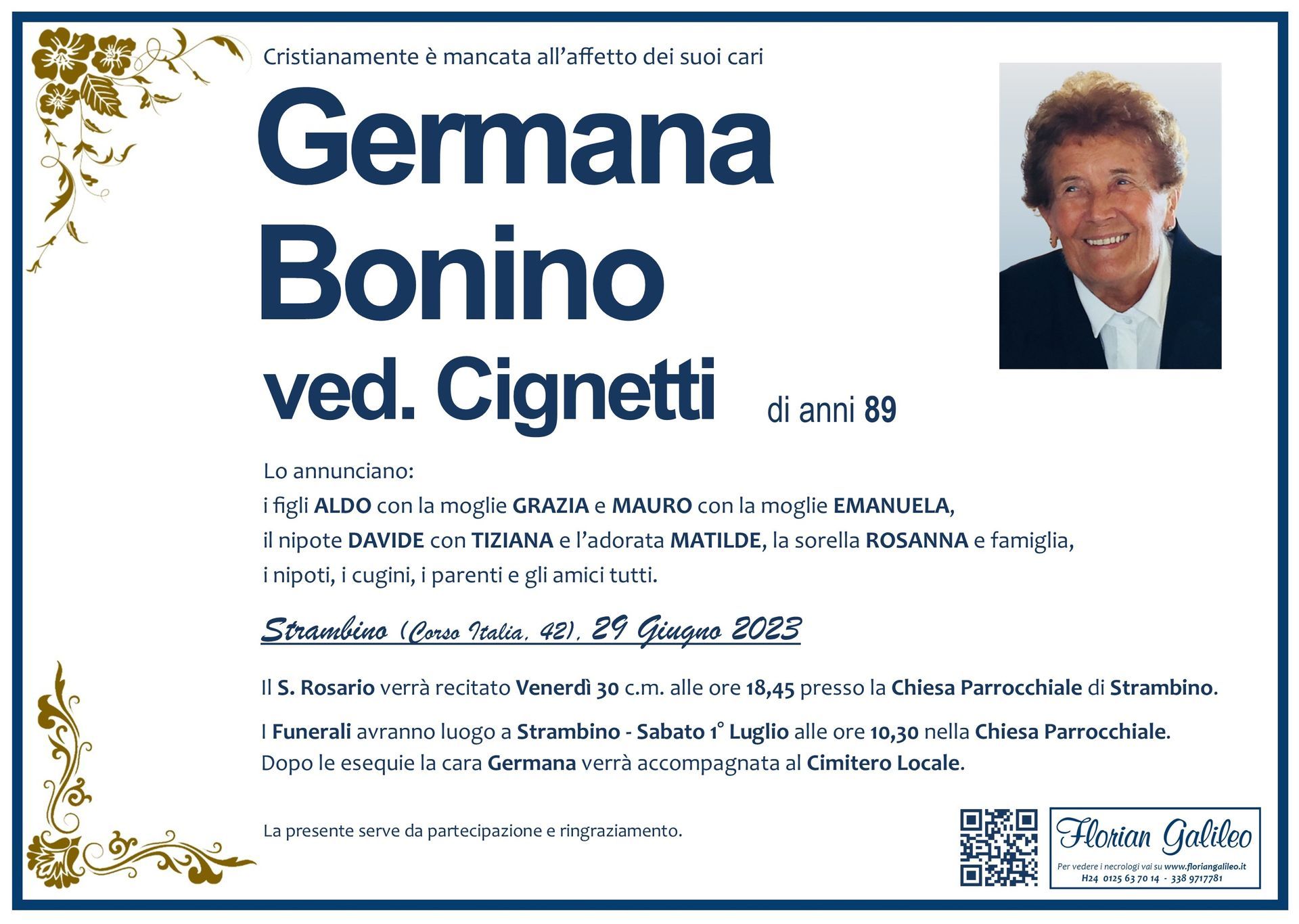 La Florian Galileo, ditta di Onoranze funebri di Strambino, Ivrea e dintorni ha creato questa pagina per rendere visibili anche on line le epigrafi dei cari defunti e per dare,