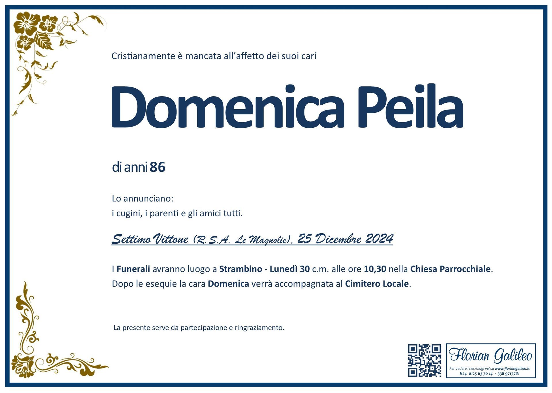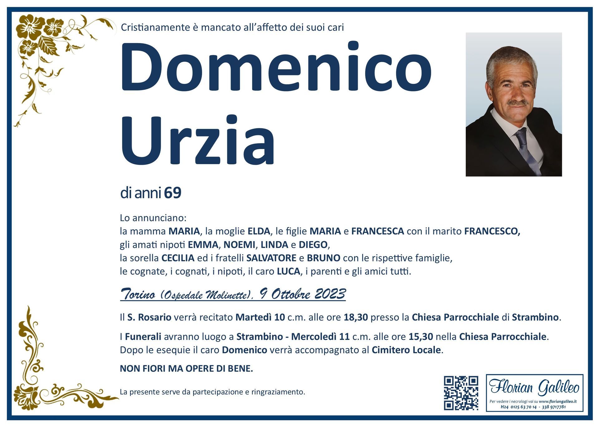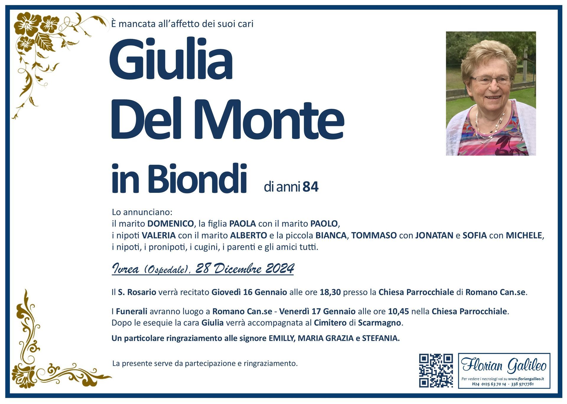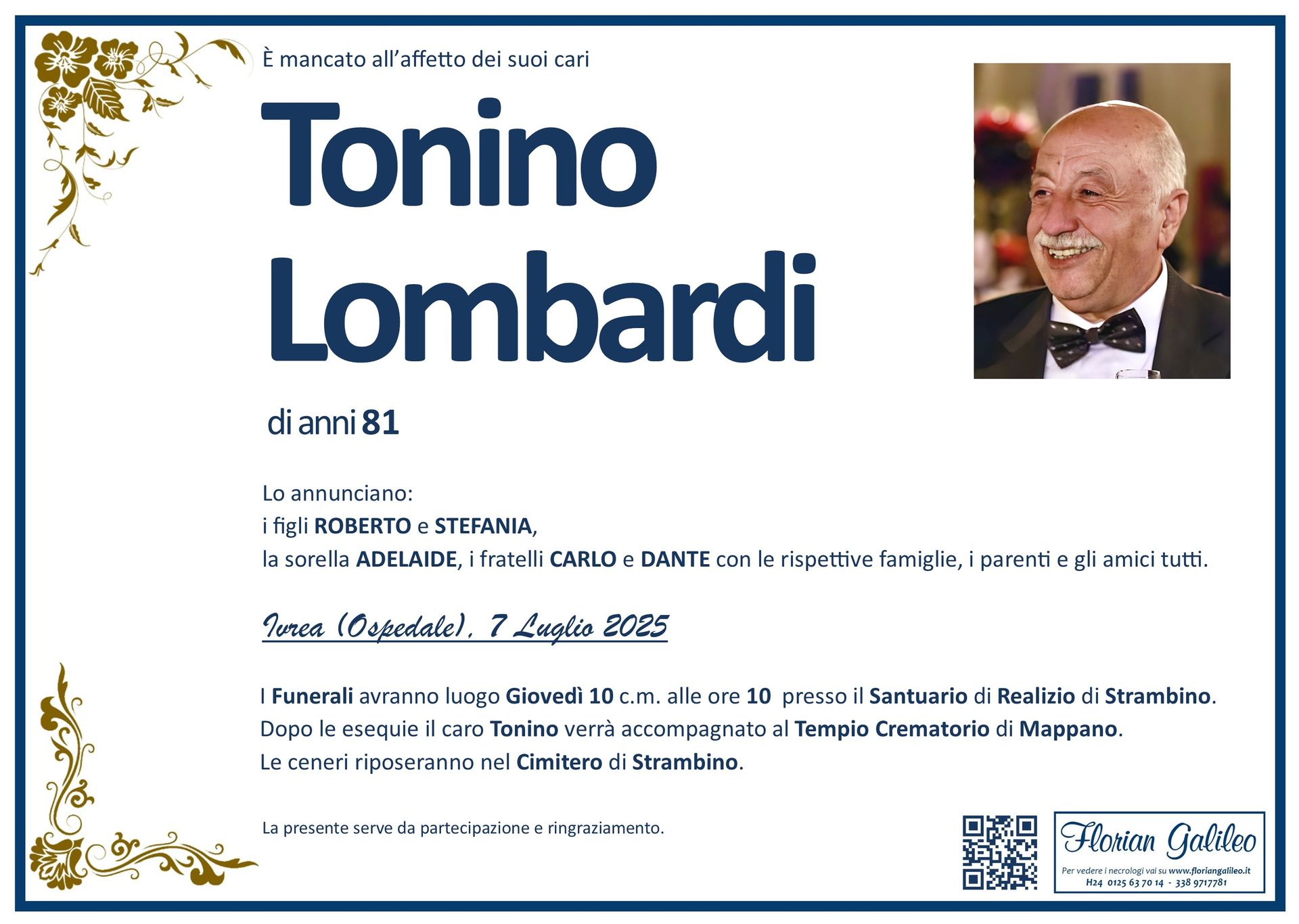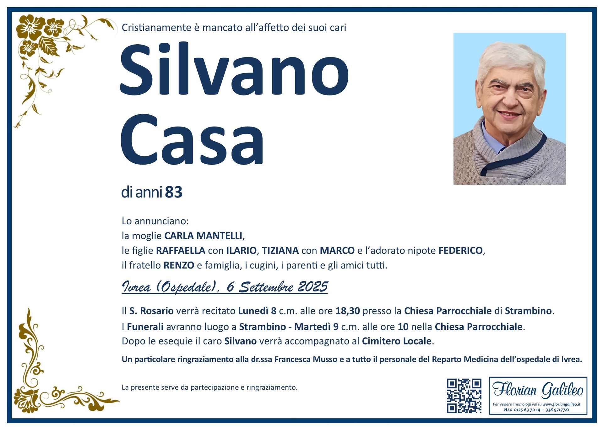 La Florian Galileo, ditta di Onoranze funebri di Strambino, Ivrea e dintorni ha creato questa pagina per rendere visibili anche on line le epigrafi dei cari defunti e per dare,