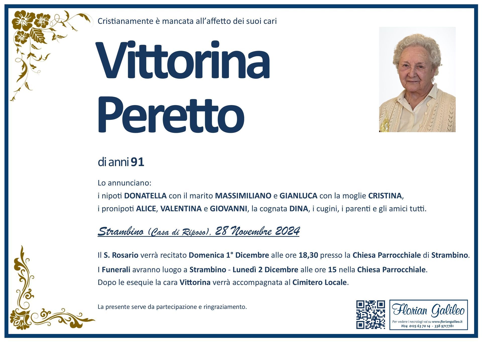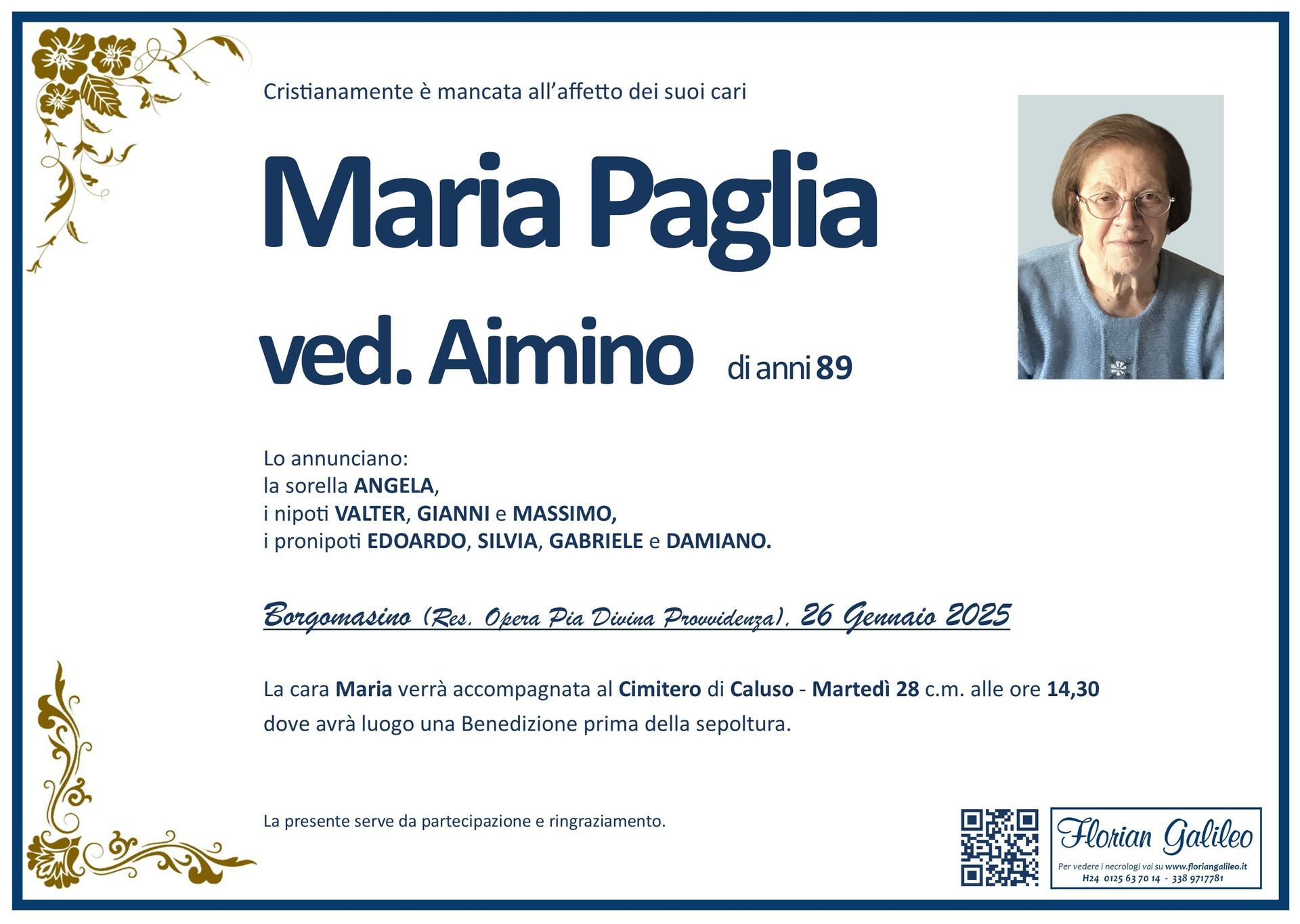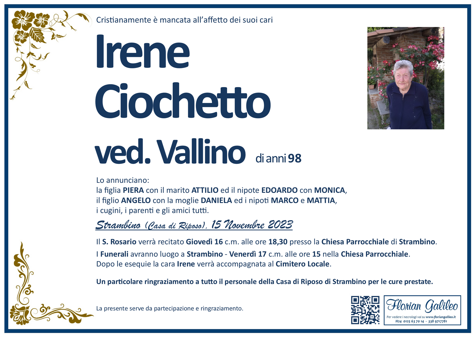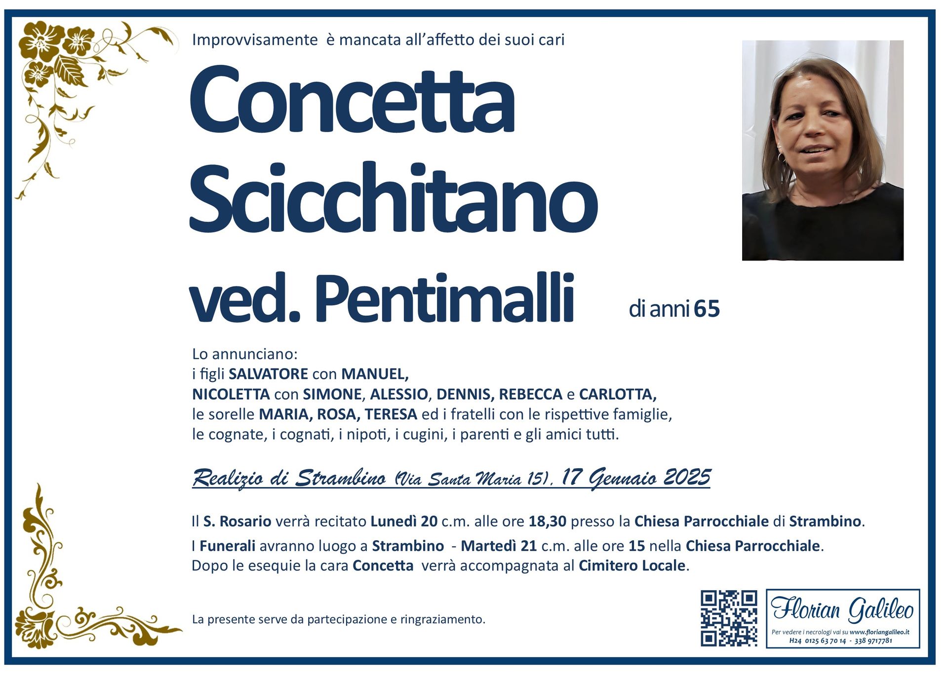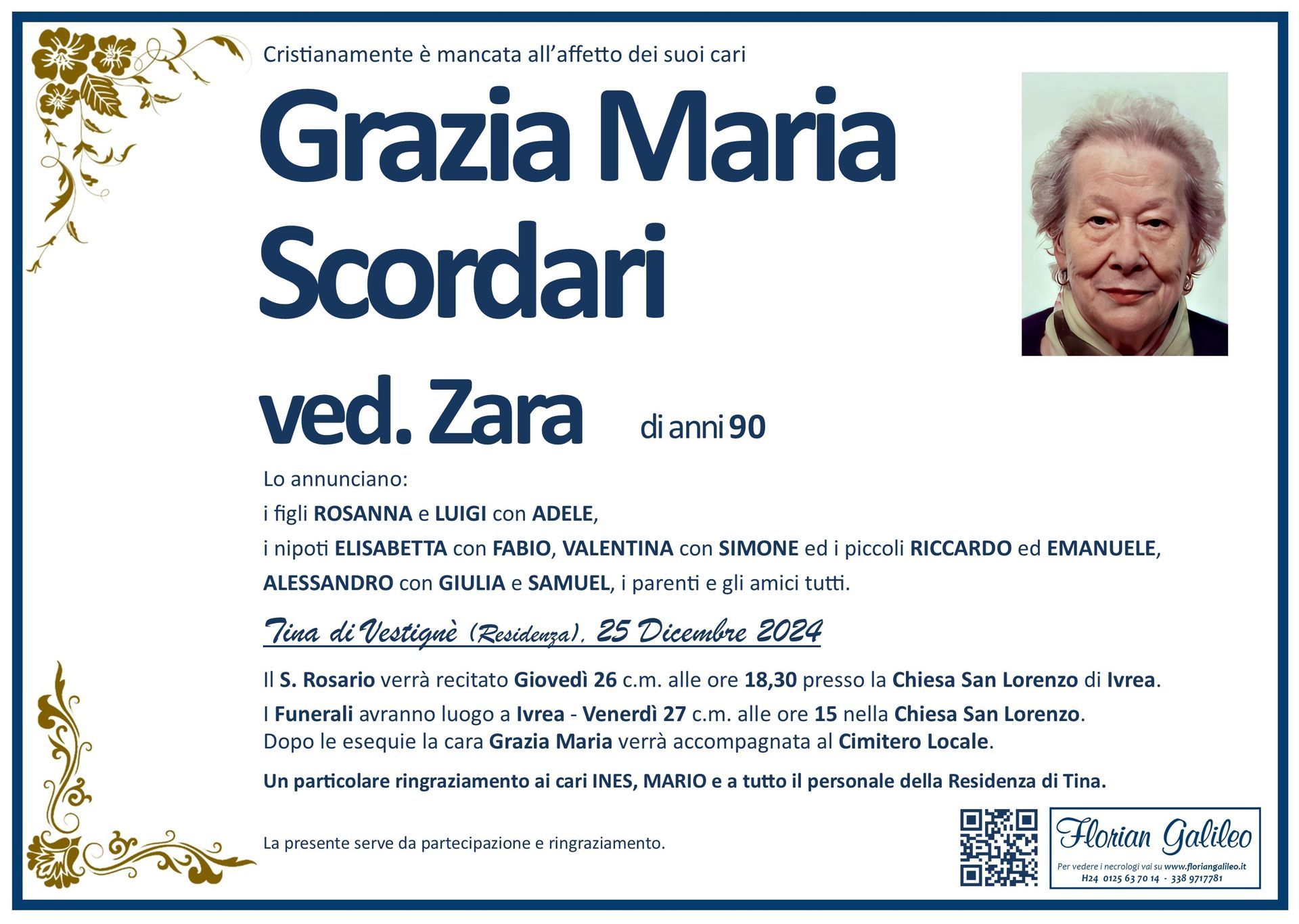 La Florian Galileo, ditta di Onoranze funebri di Strambino, Ivrea e dintorni ha creato questa pagina per rendere visibili anche on line le epigrafi dei cari defunti e per dare,