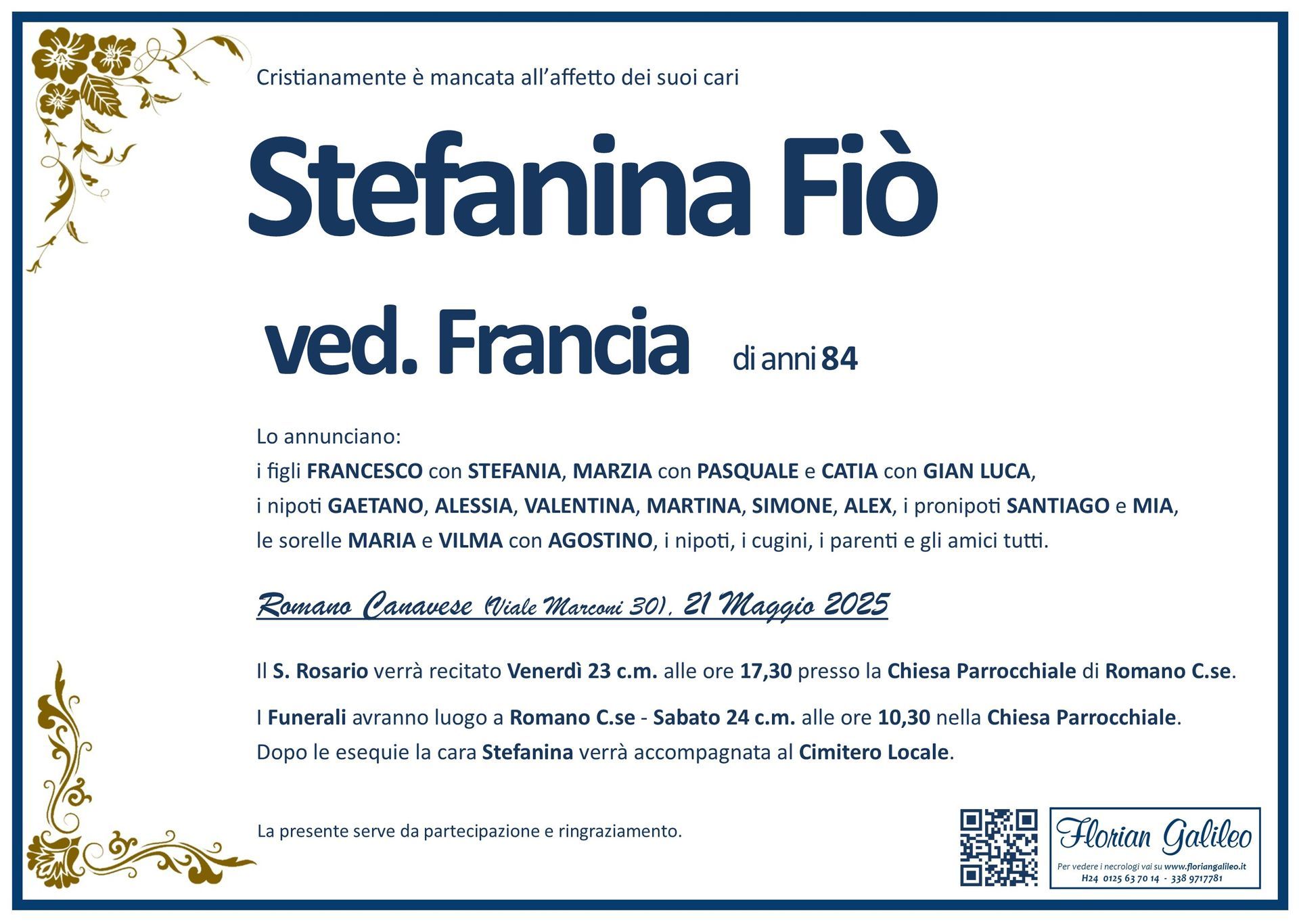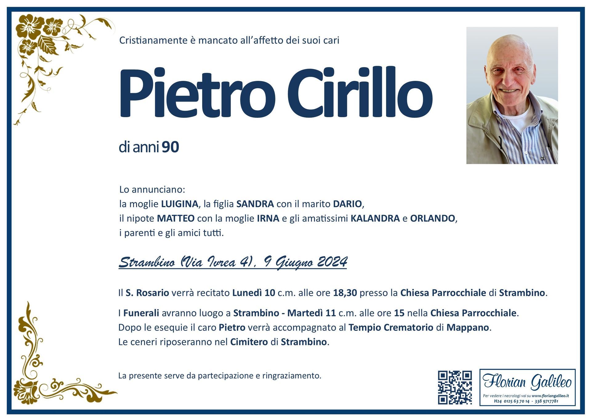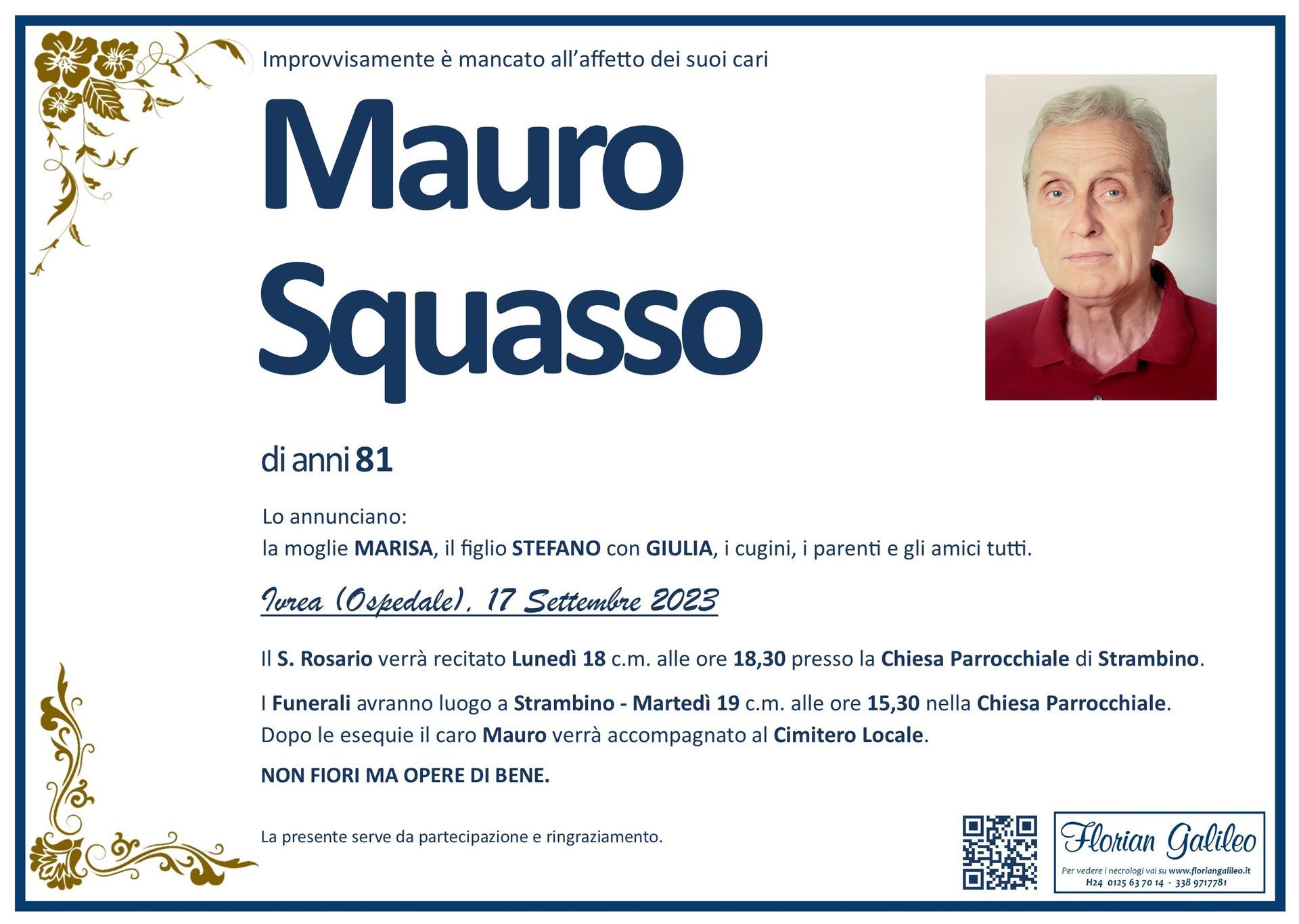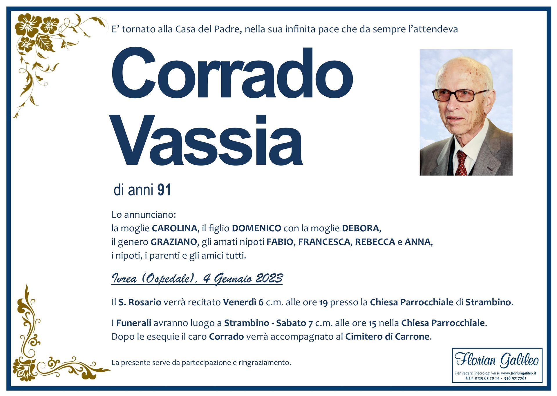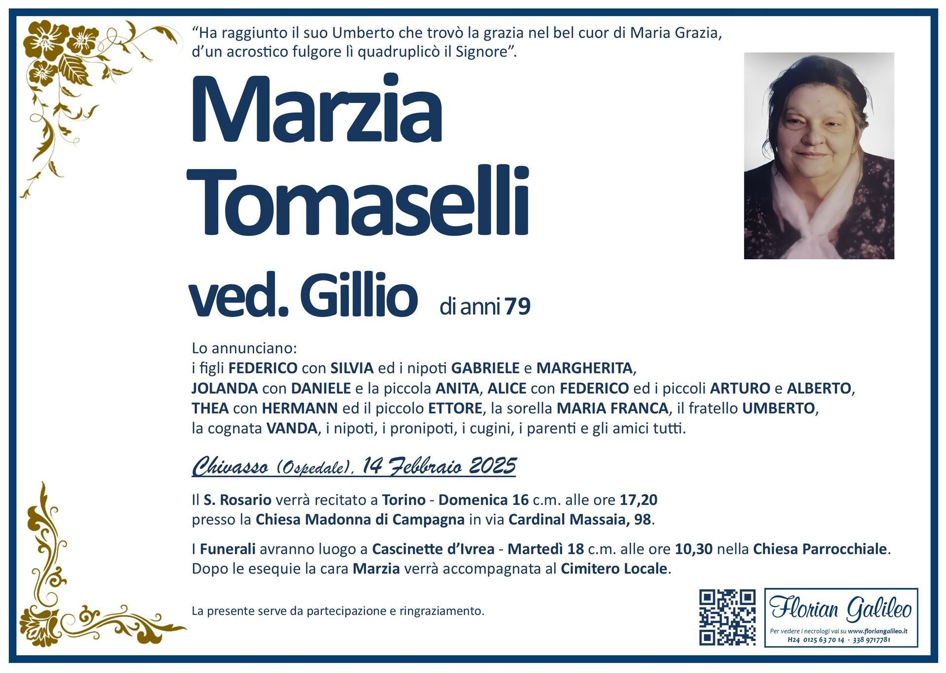 La Florian Galileo, ditta di Onoranze funebri di Strambino, Ivrea e dintorni ha creato questa pagina per rendere visibili anche on line le epigrafi dei cari defunti e per dare,