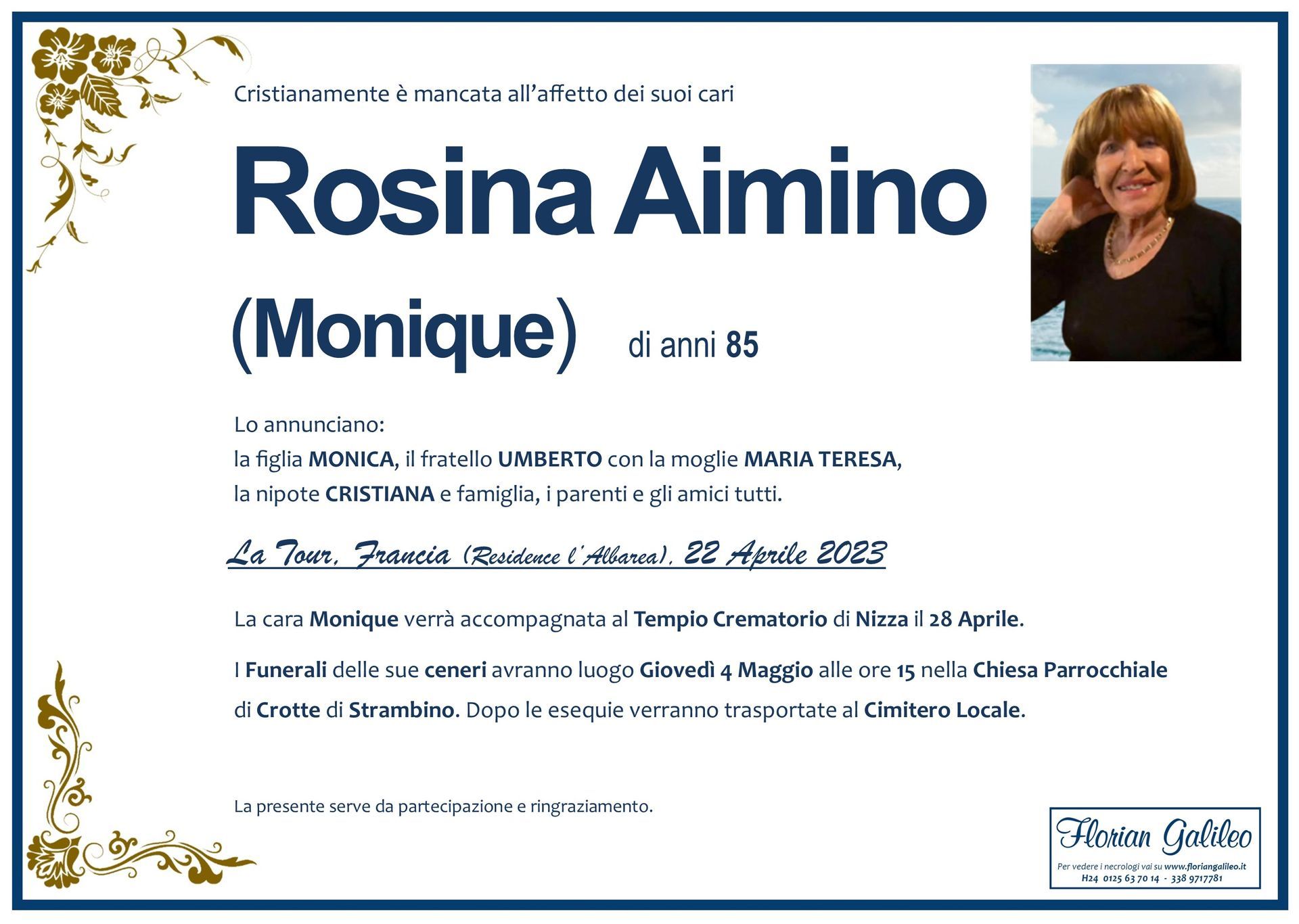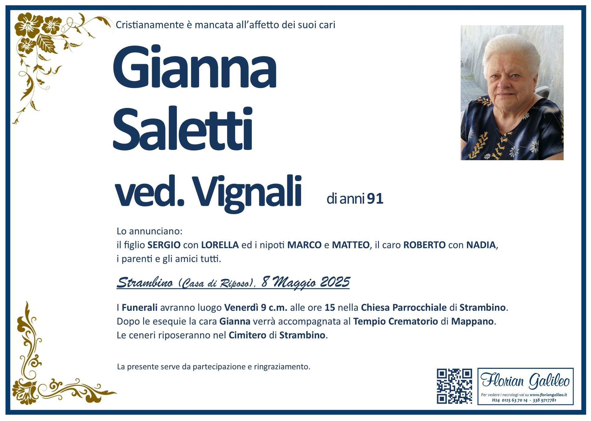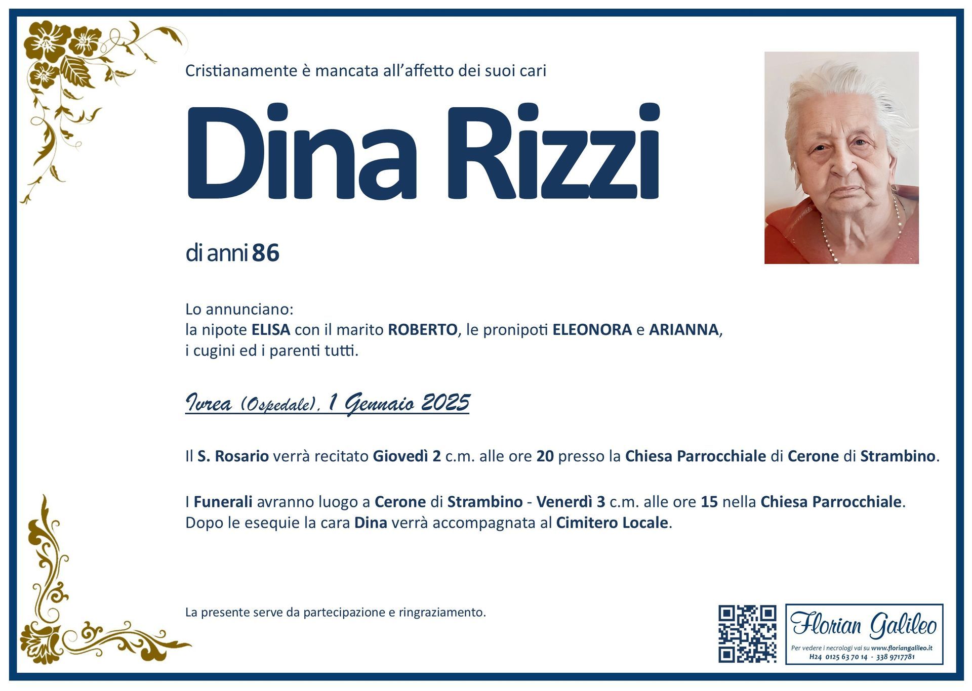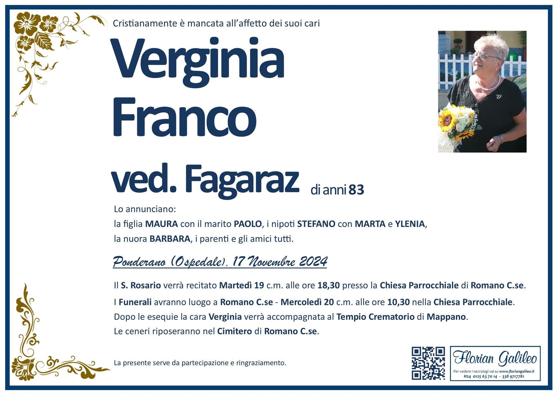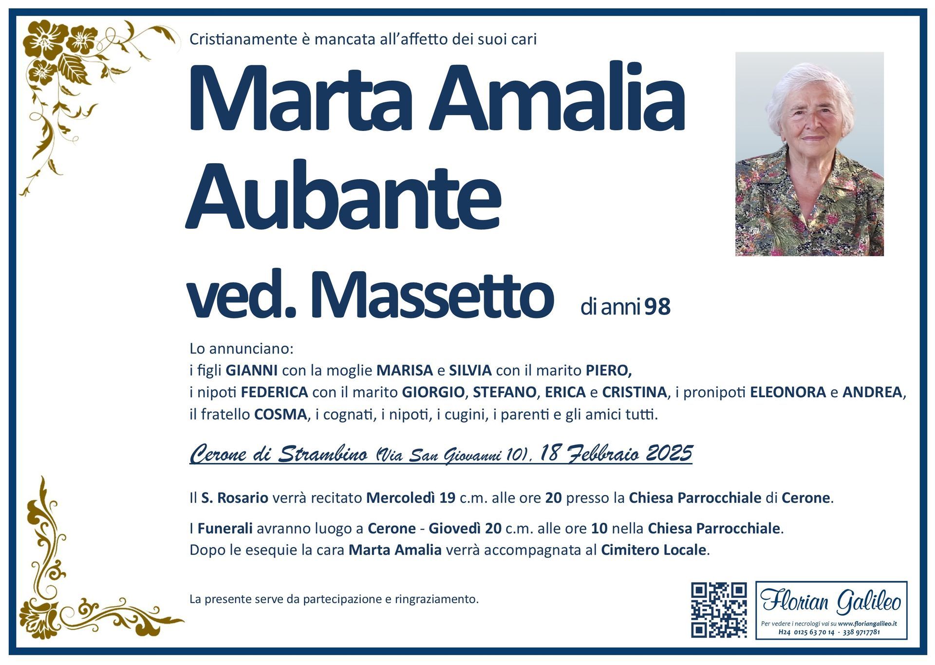 La Florian Galileo, ditta di Onoranze funebri di Strambino, Ivrea e dintorni ha creato questa pagina per rendere visibili anche on line le epigrafi dei cari defunti e per dare,