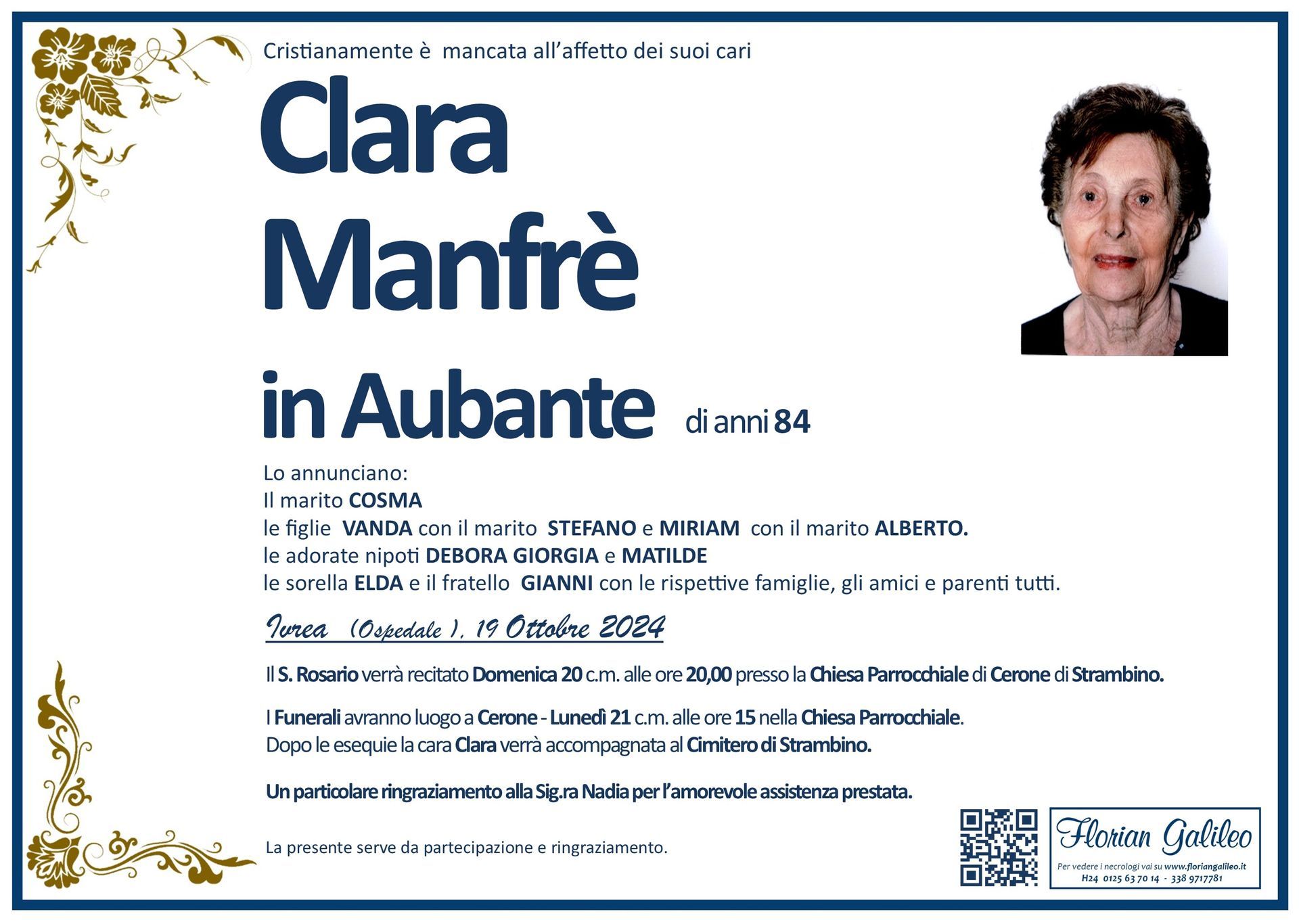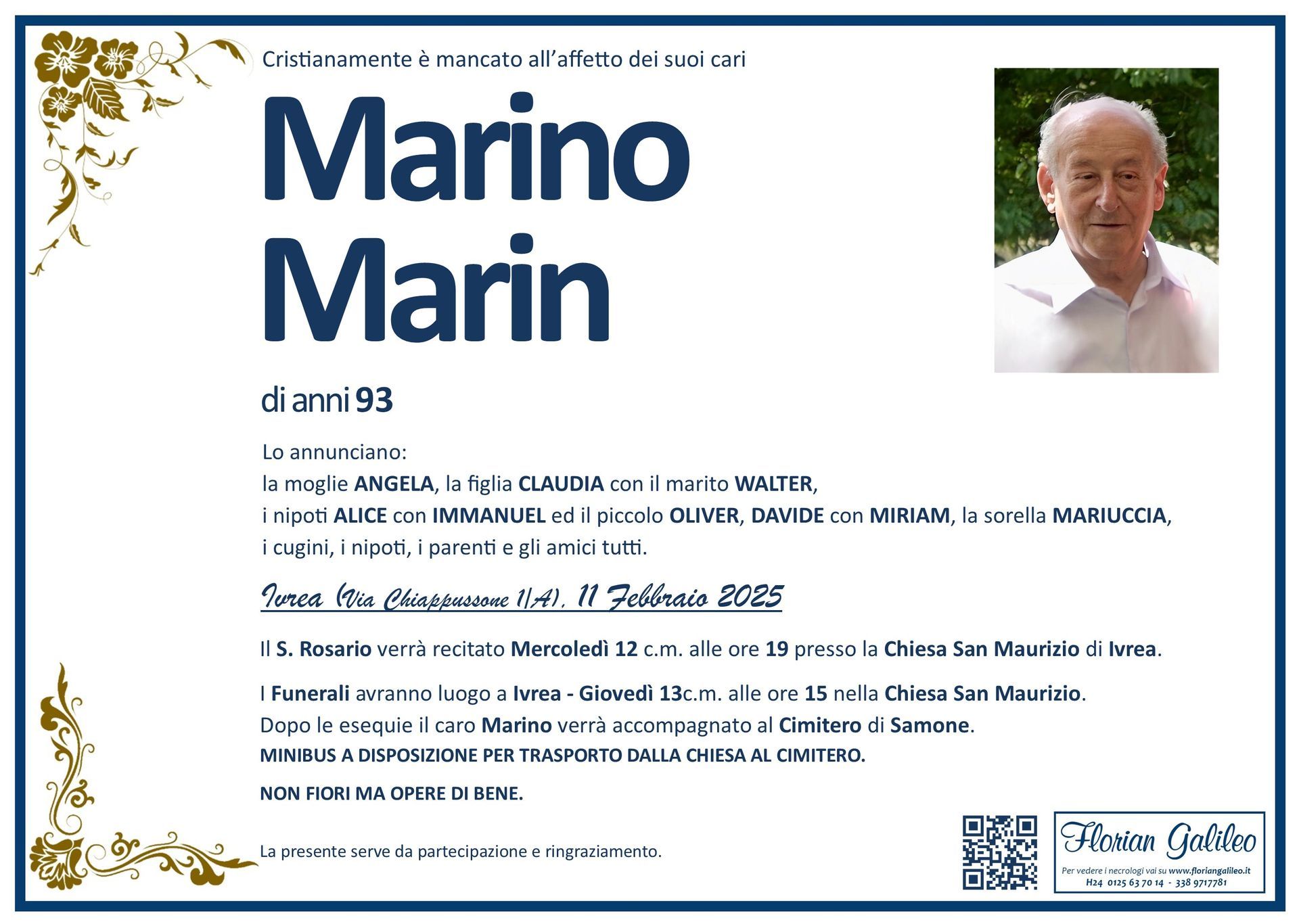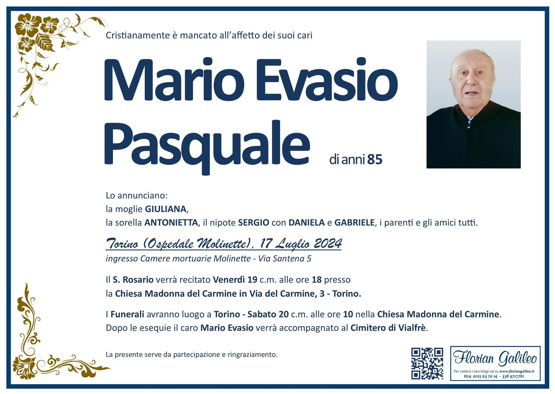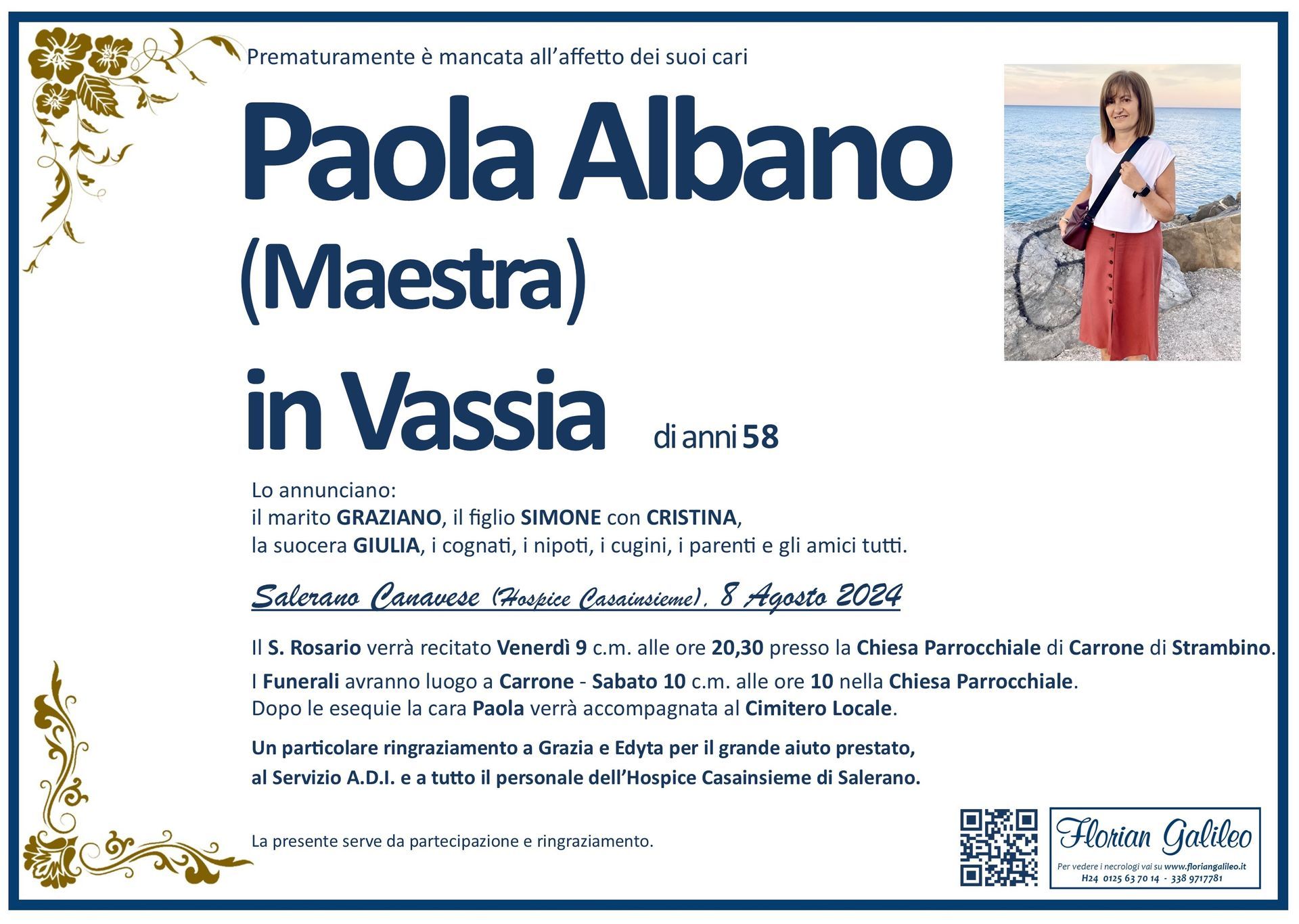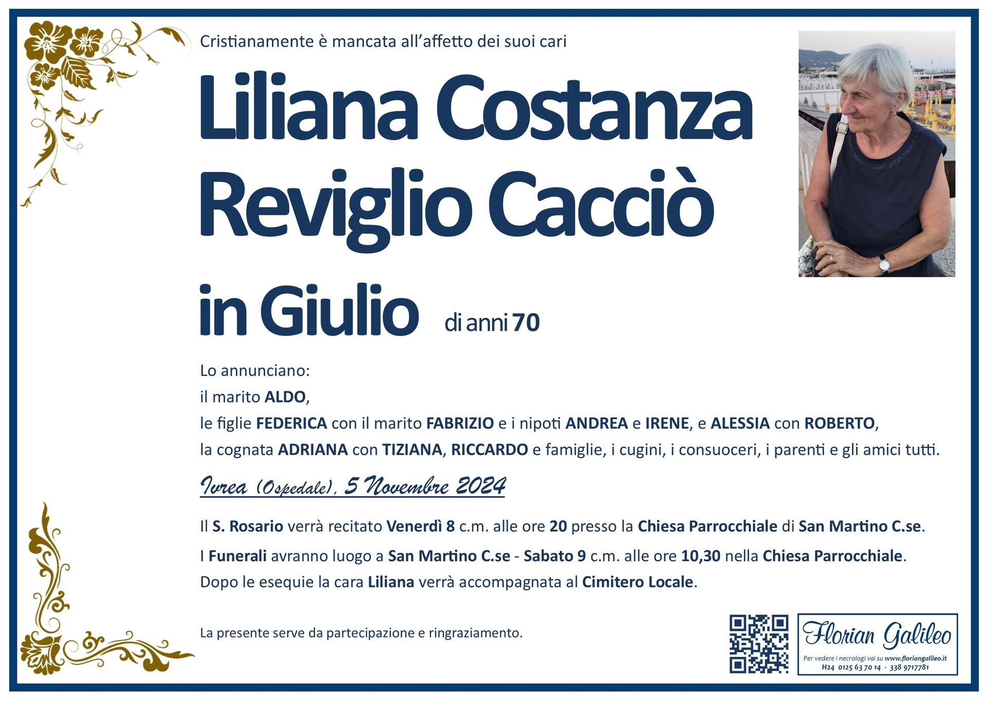 La Florian Galileo, ditta di Onoranze funebri di Strambino, Ivrea e dintorni ha creato questa pagina per rendere visibili anche on line le epigrafi dei cari defunti e per dare,