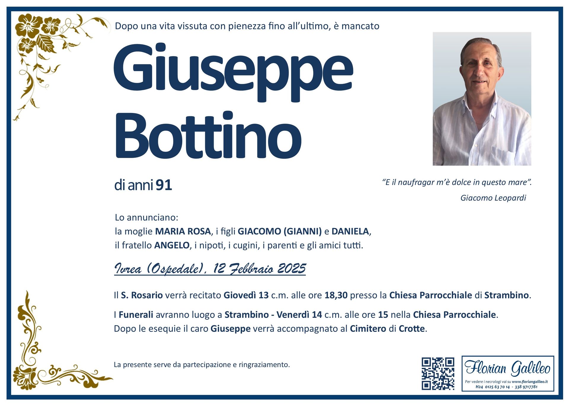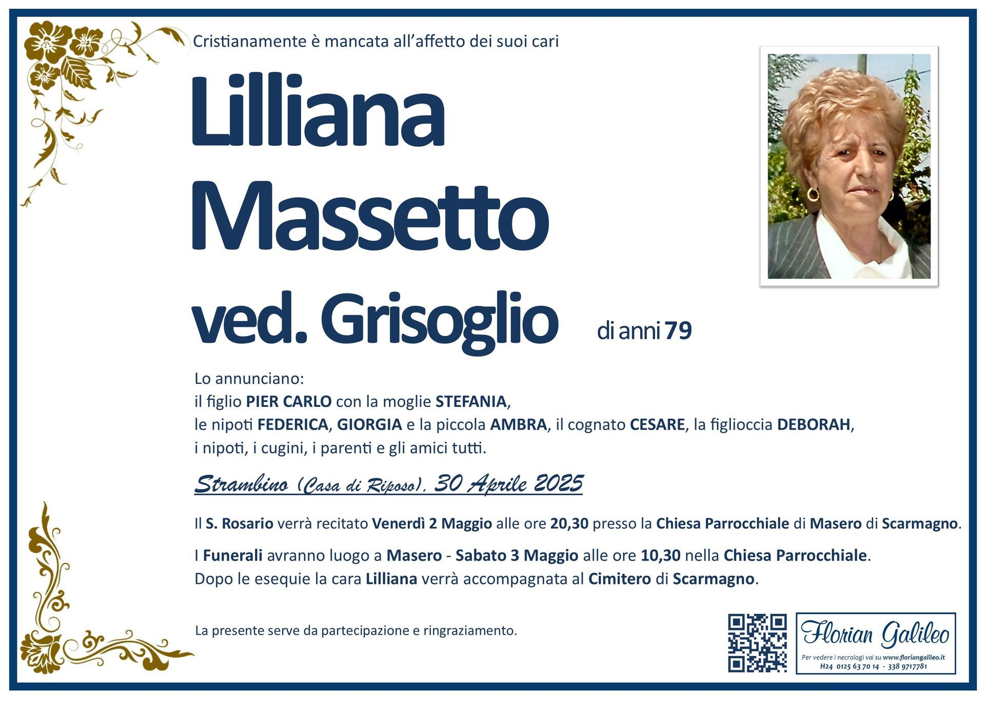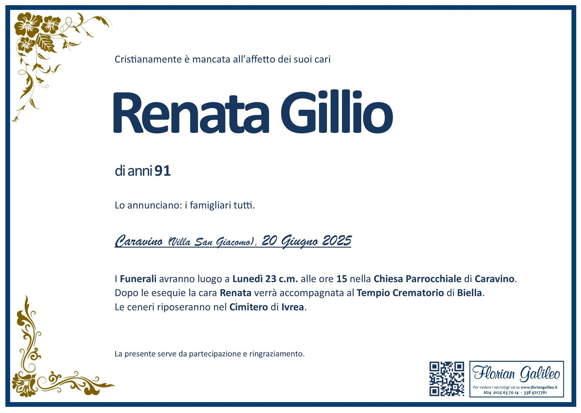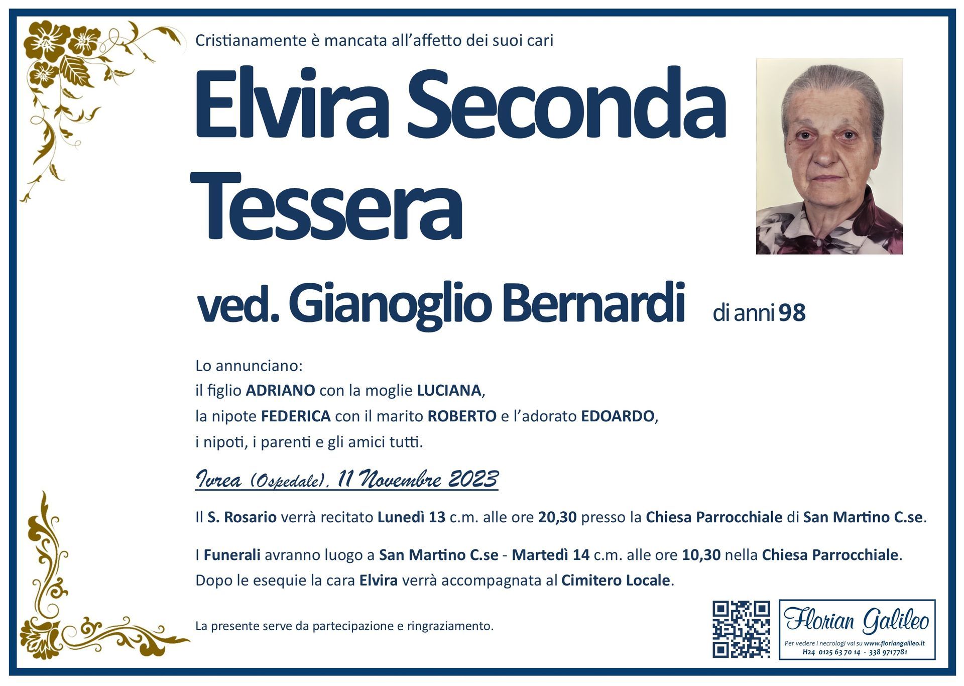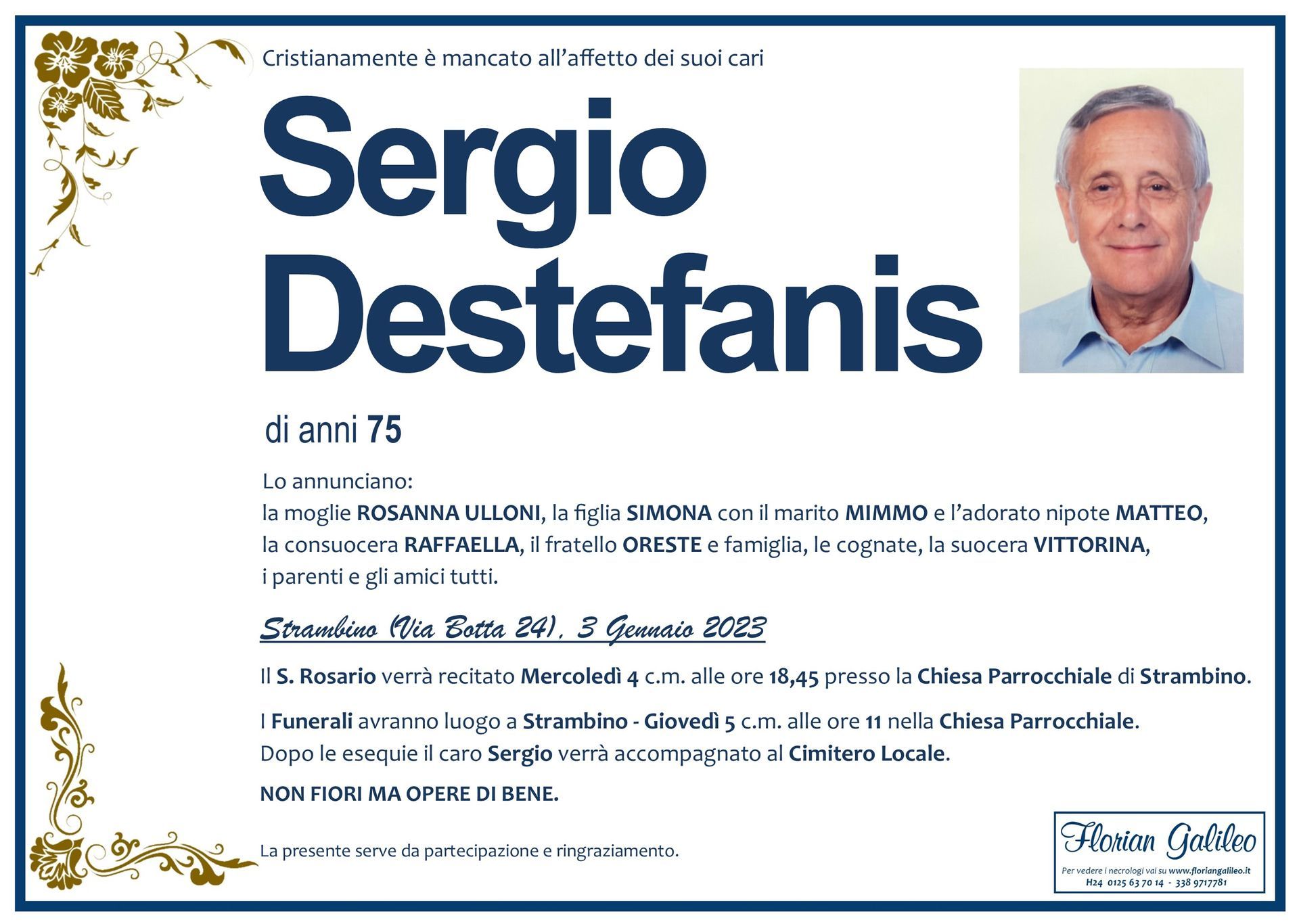 La Florian Galileo, ditta di Onoranze funebri di Strambino, Ivrea e dintorni ha creato questa pagina per rendere visibili anche on line le epigrafi dei cari defunti e per dare,
