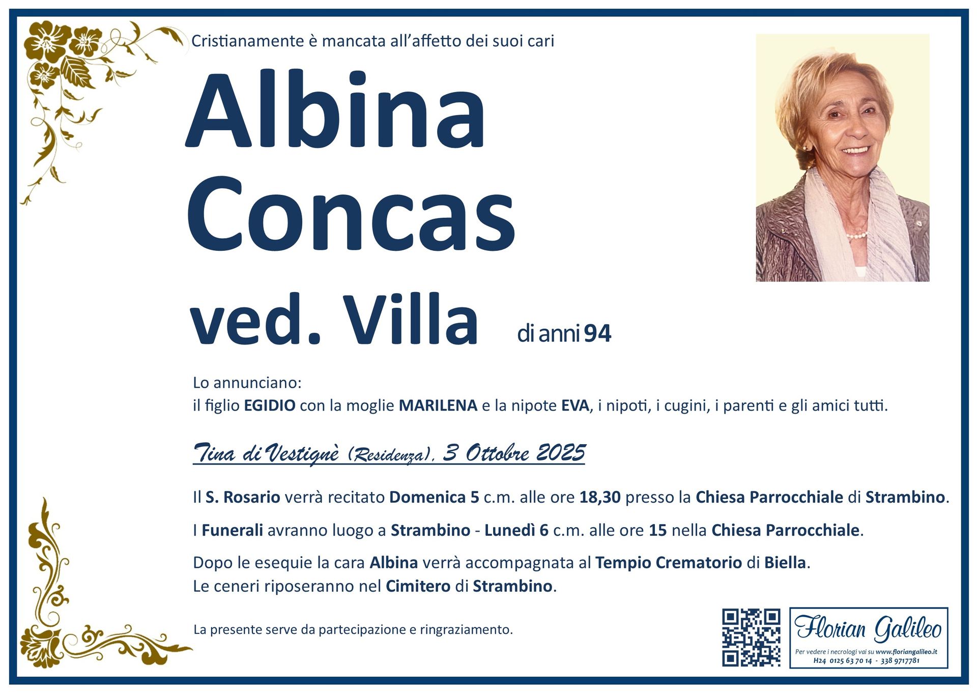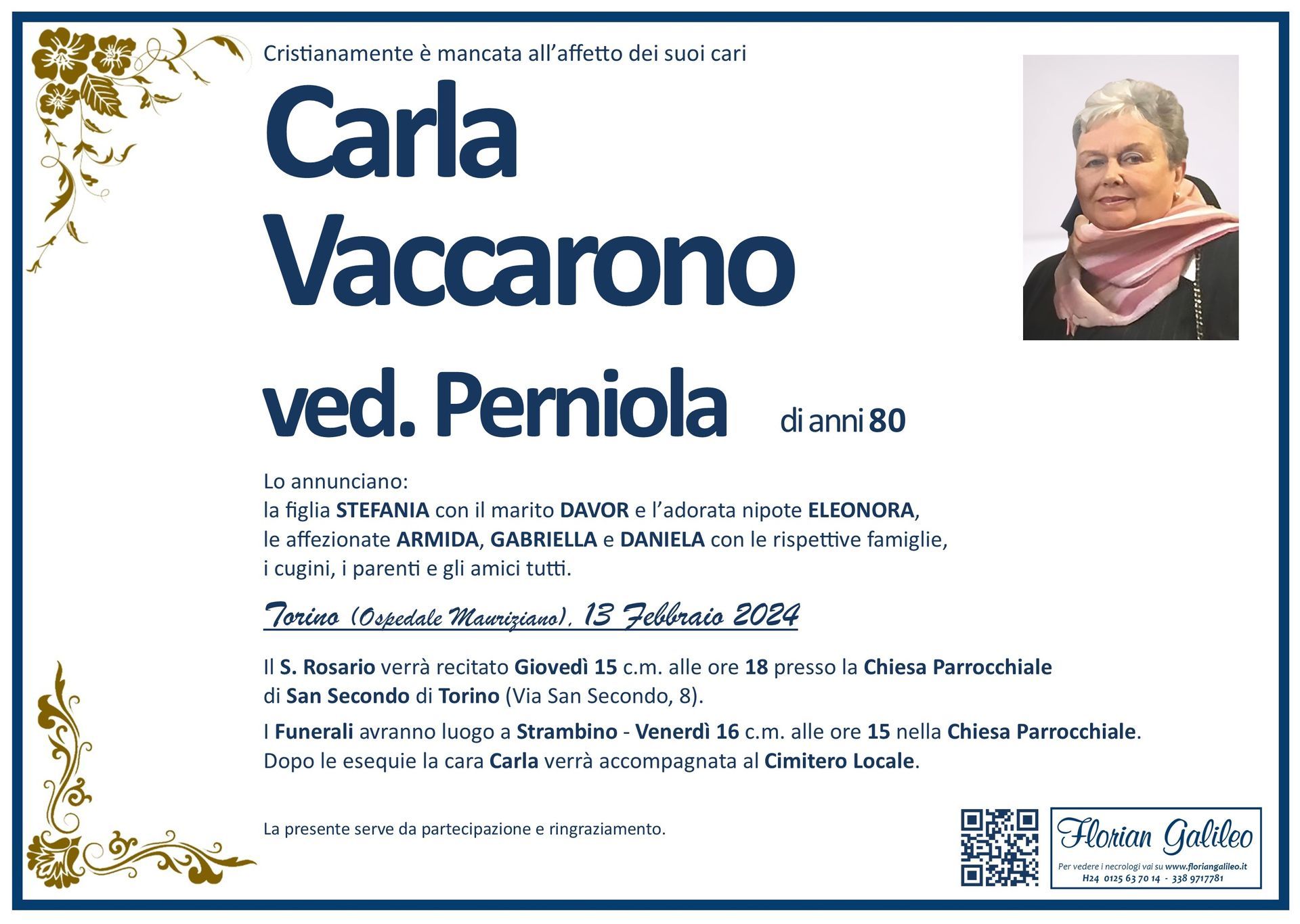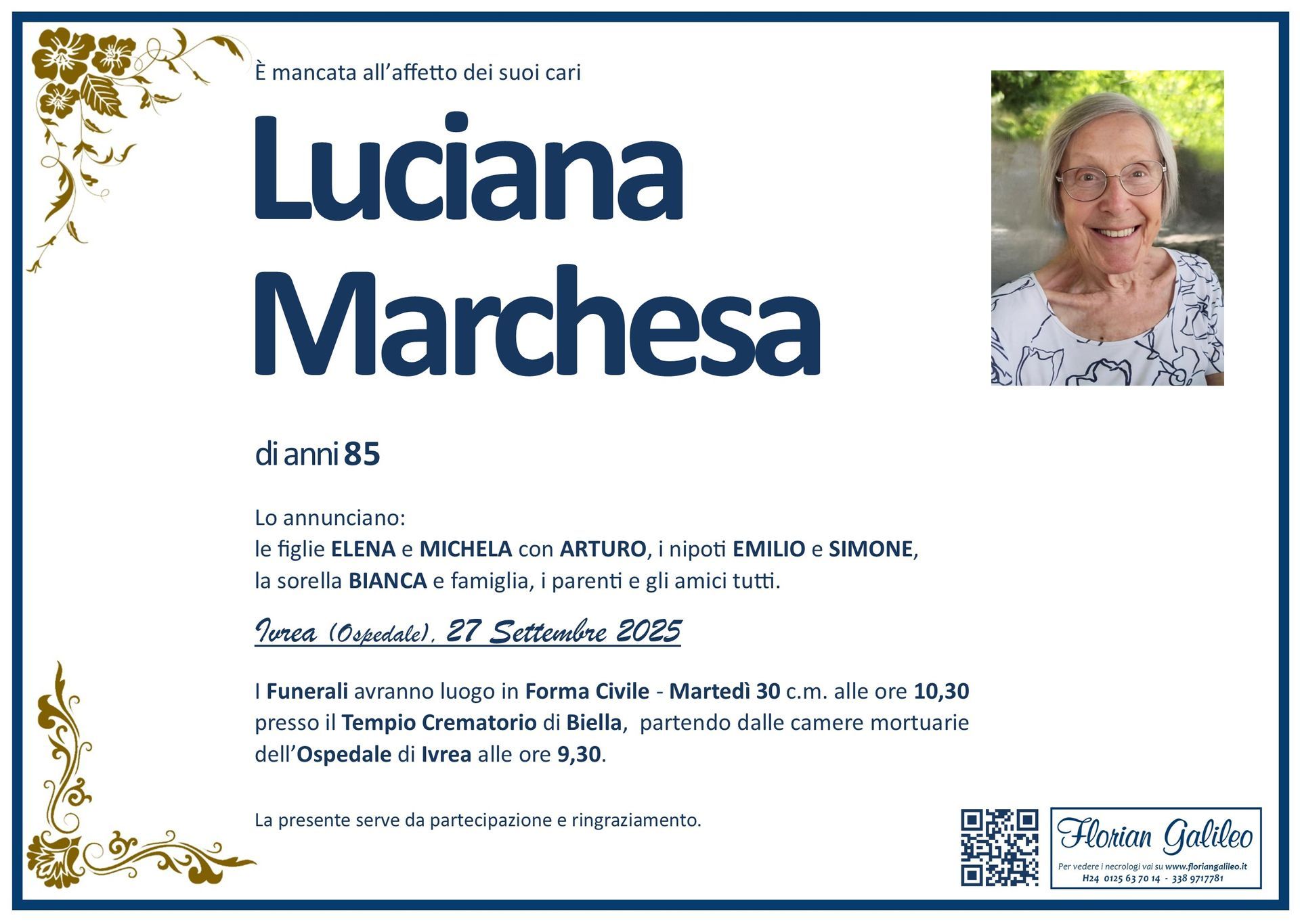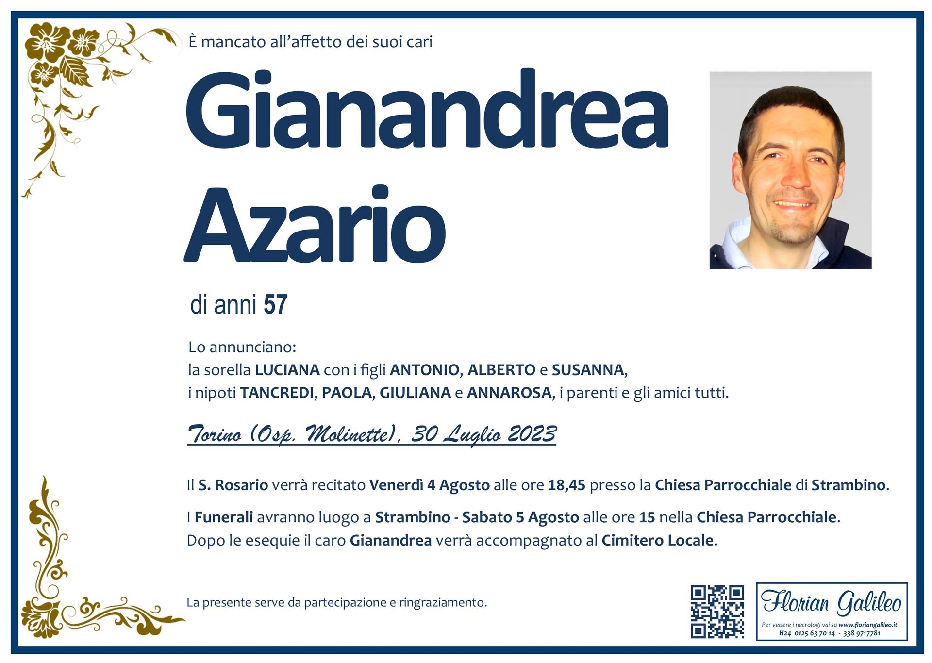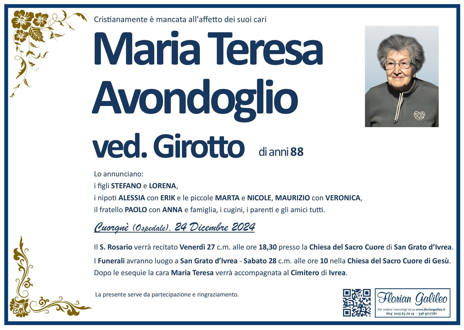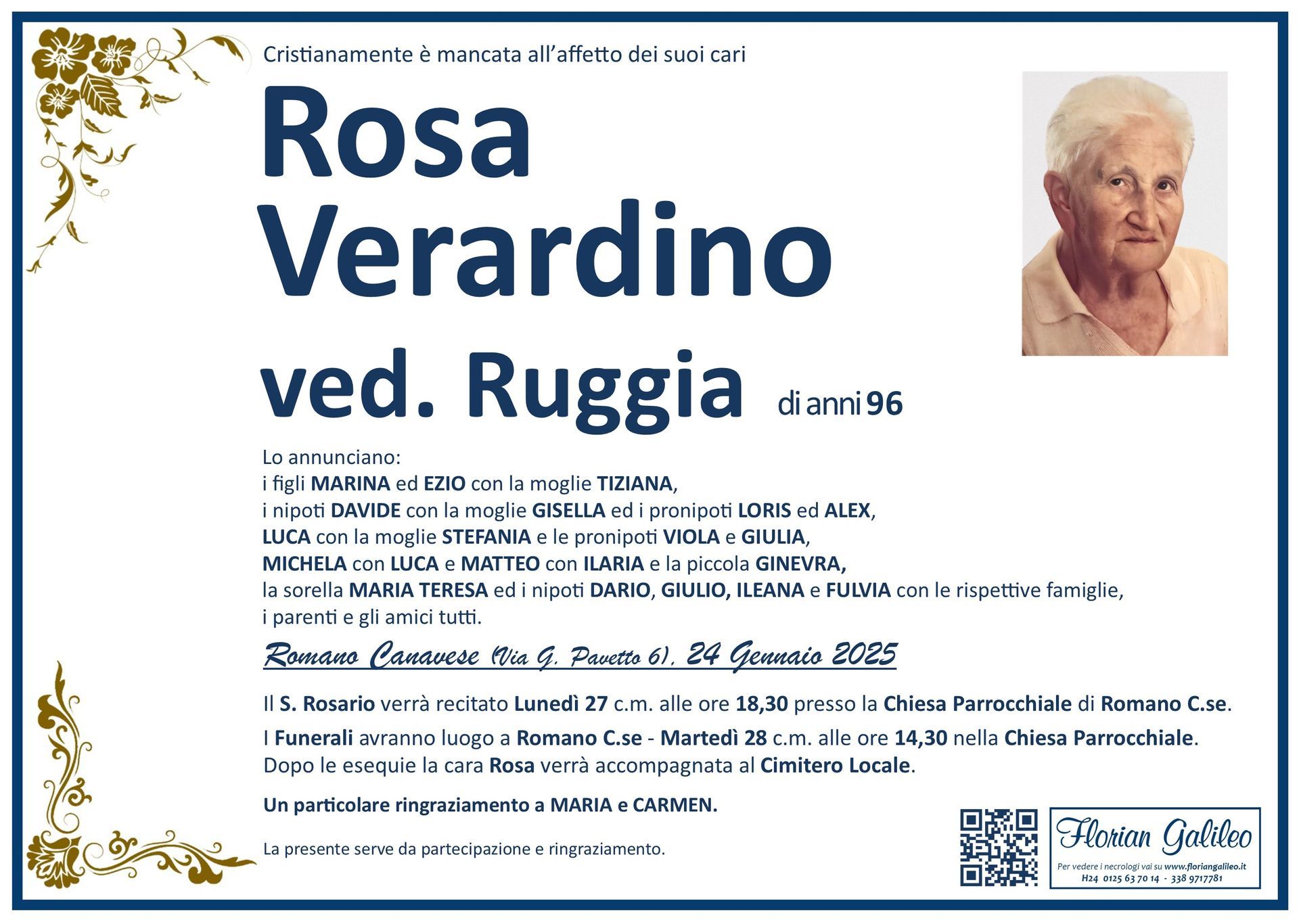 La Florian Galileo, ditta di Onoranze funebri di Strambino, Ivrea e dintorni ha creato questa pagina per rendere visibili anche on line le epigrafi dei cari defunti e per dare,