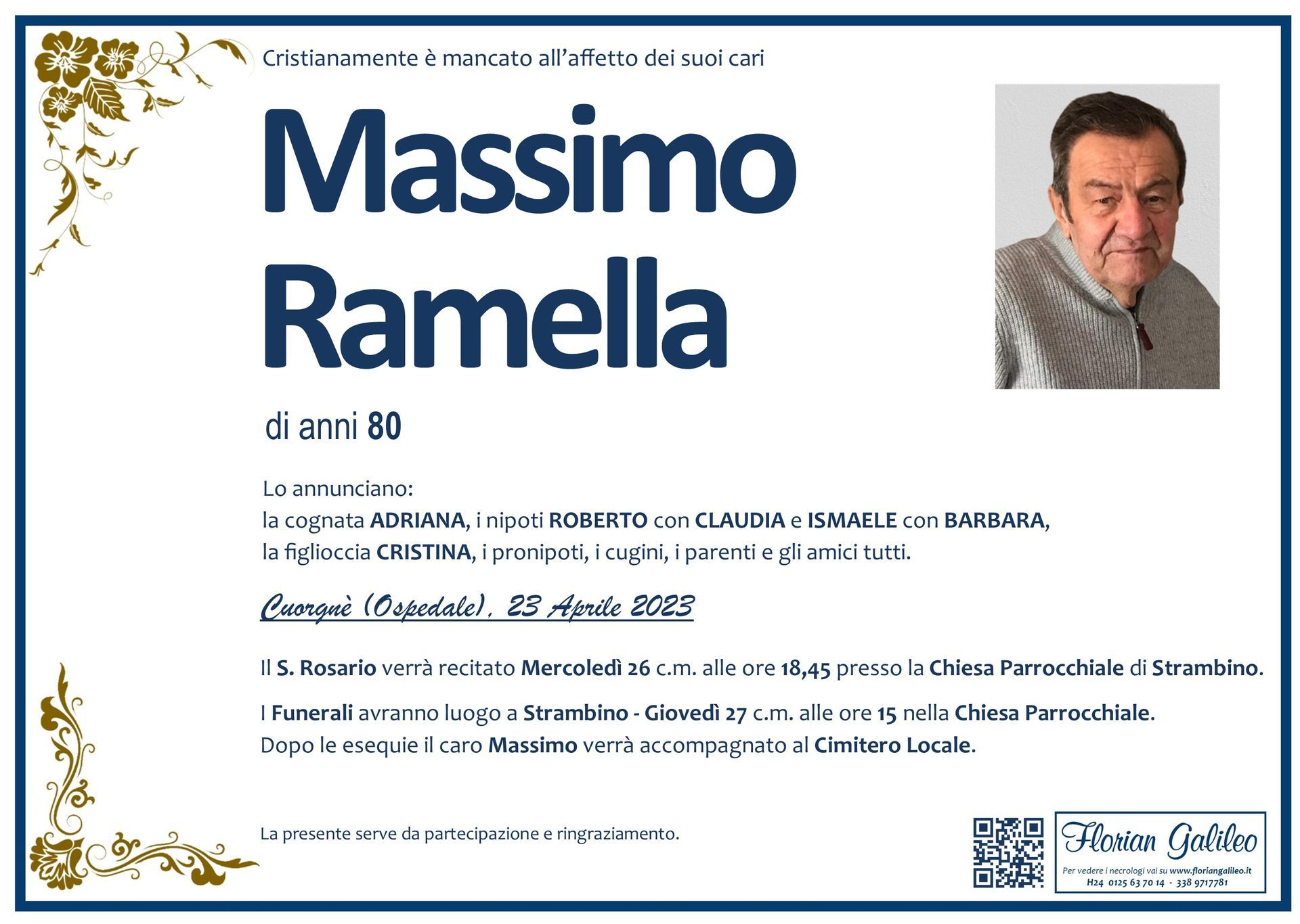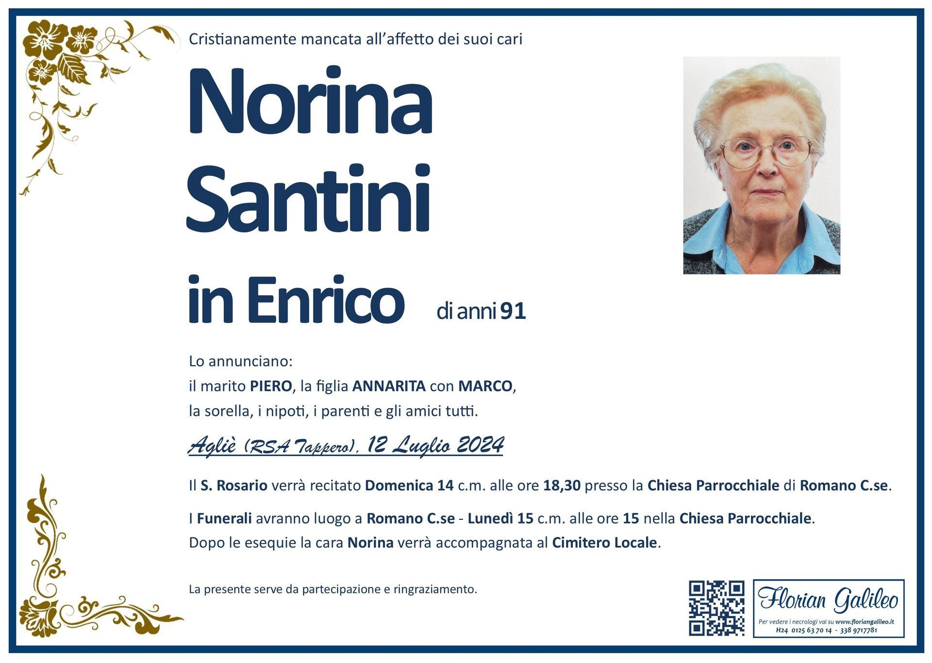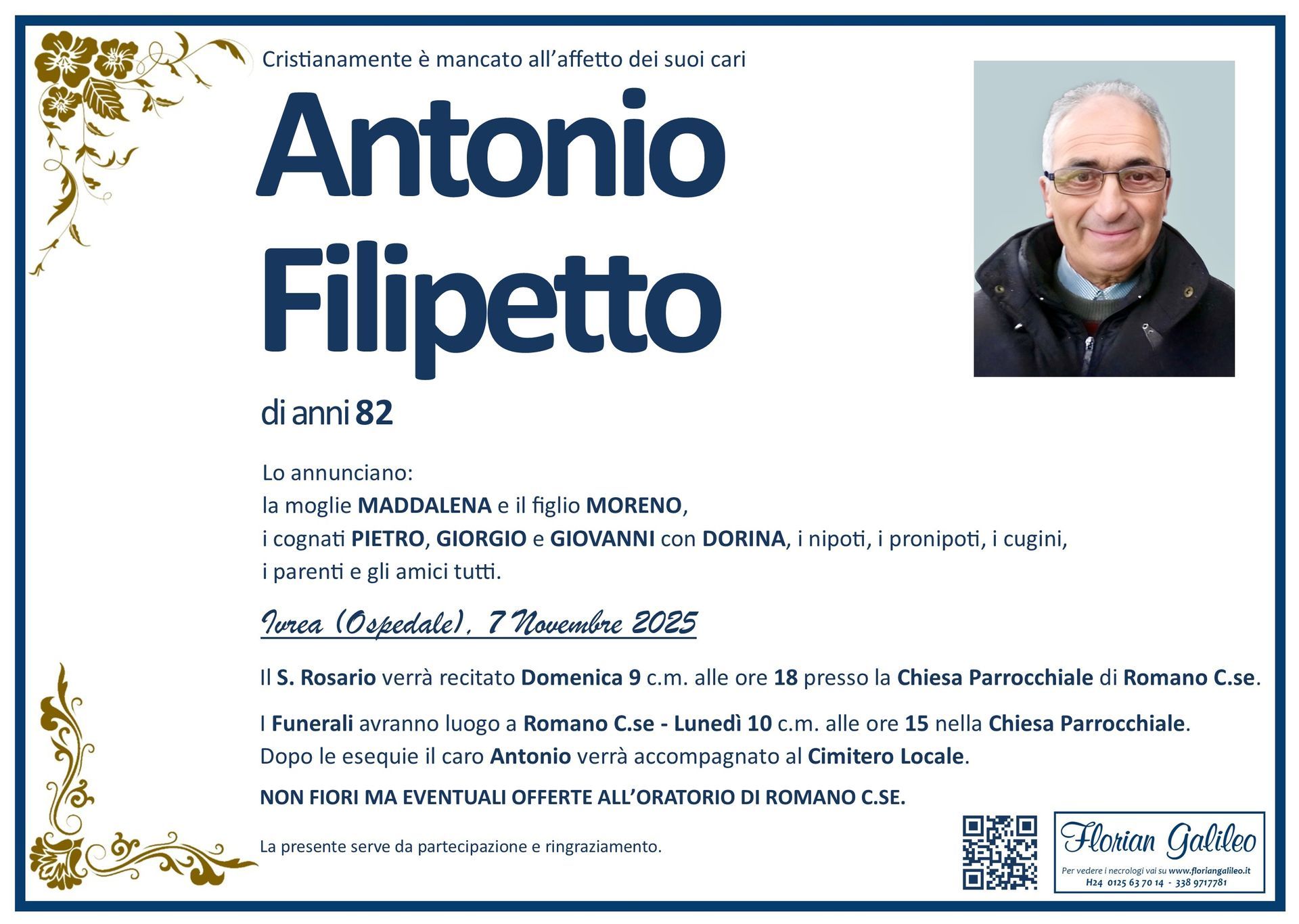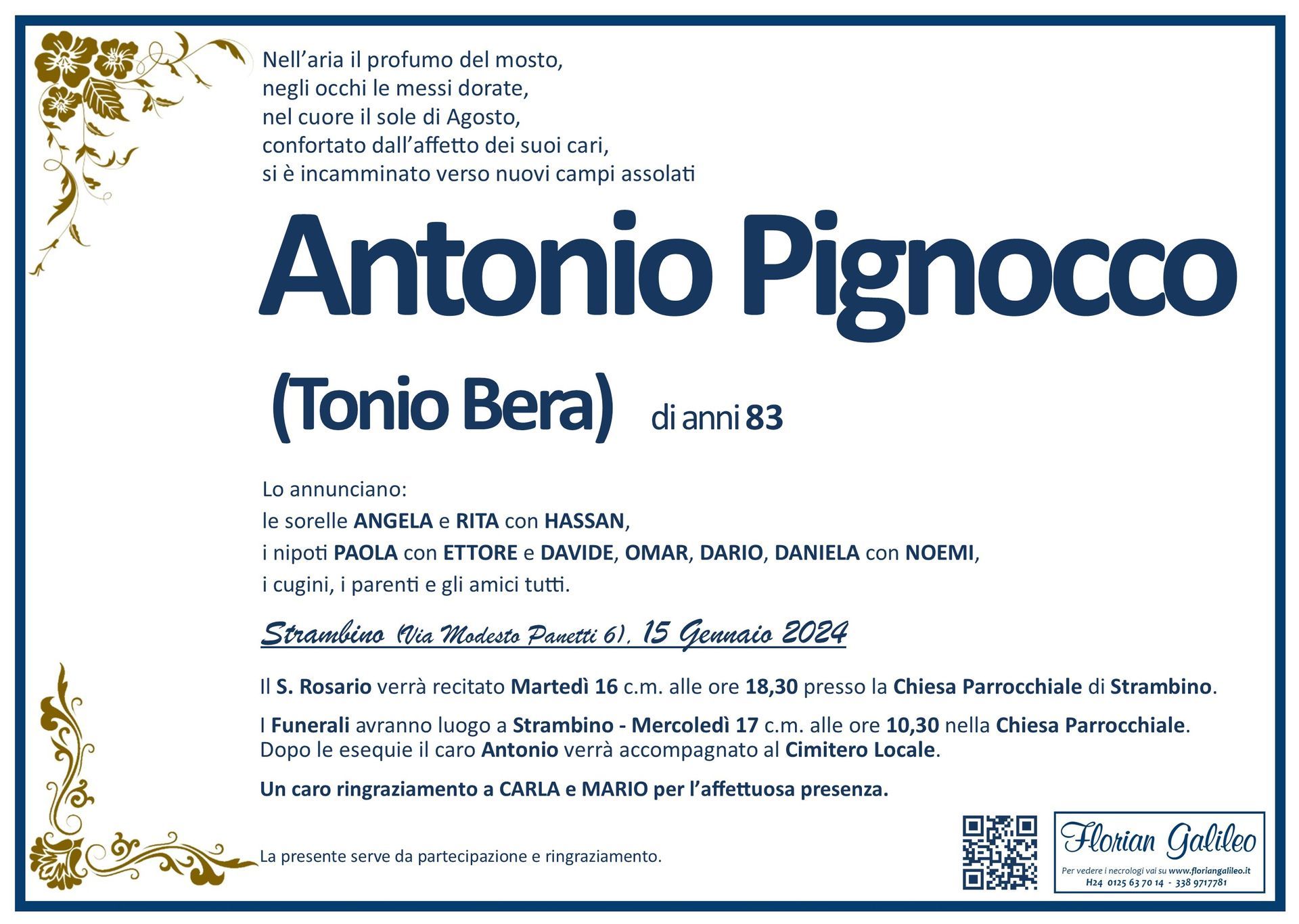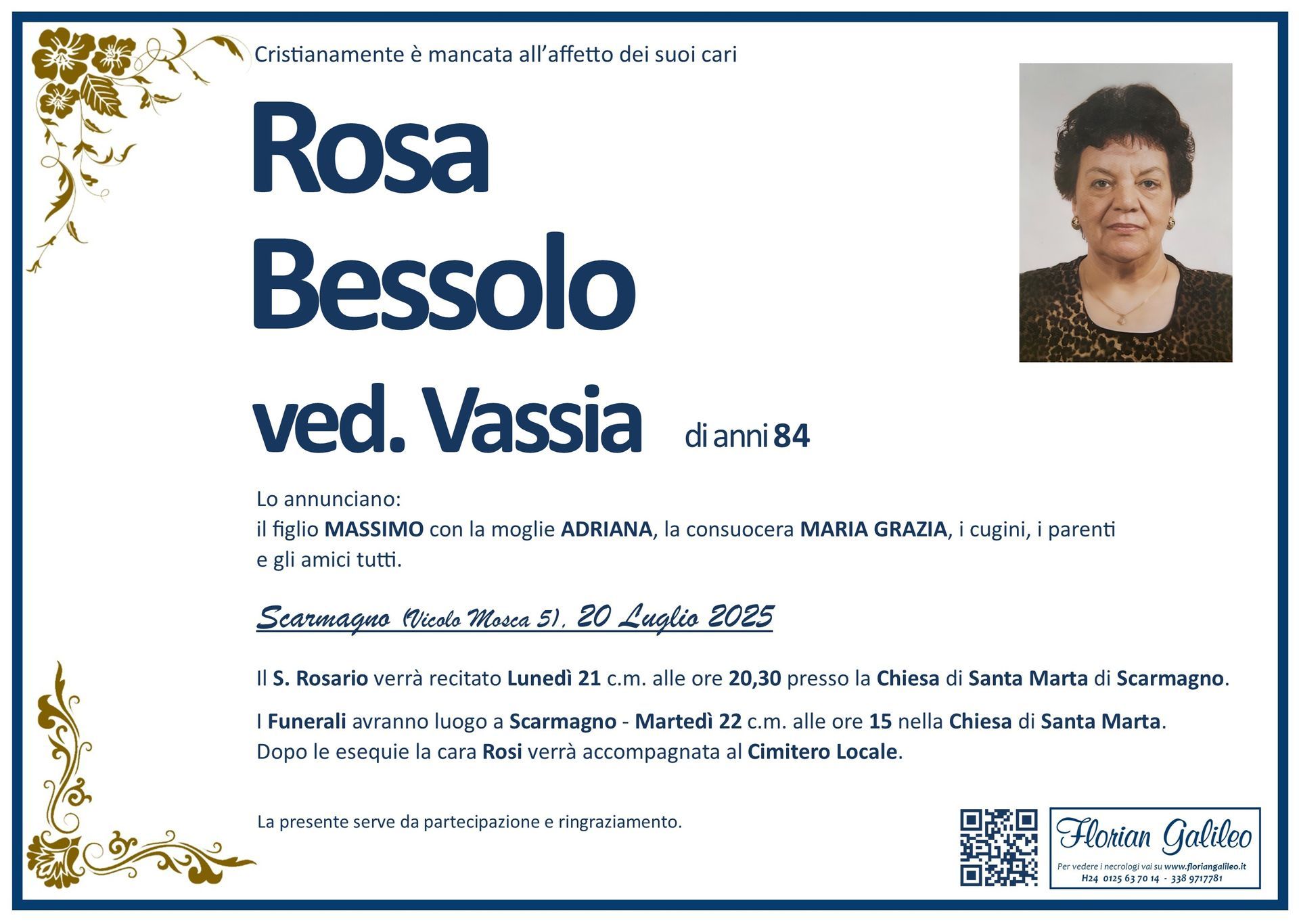 La Florian Galileo, ditta di Onoranze funebri di Strambino, Ivrea e dintorni ha creato questa pagina per rendere visibili anche on line le epigrafi dei cari defunti e per dare,