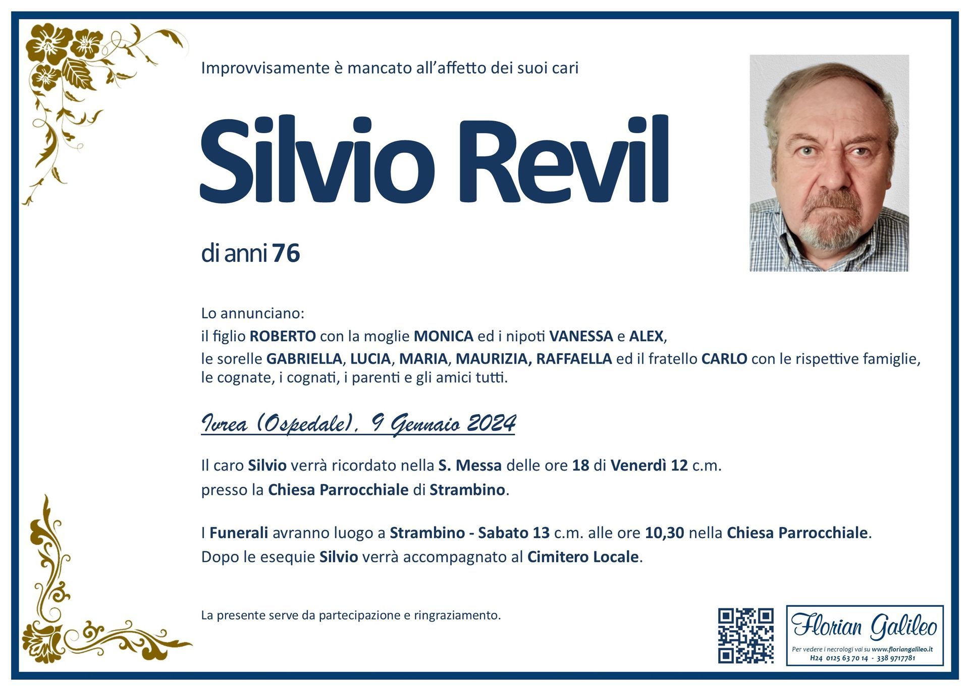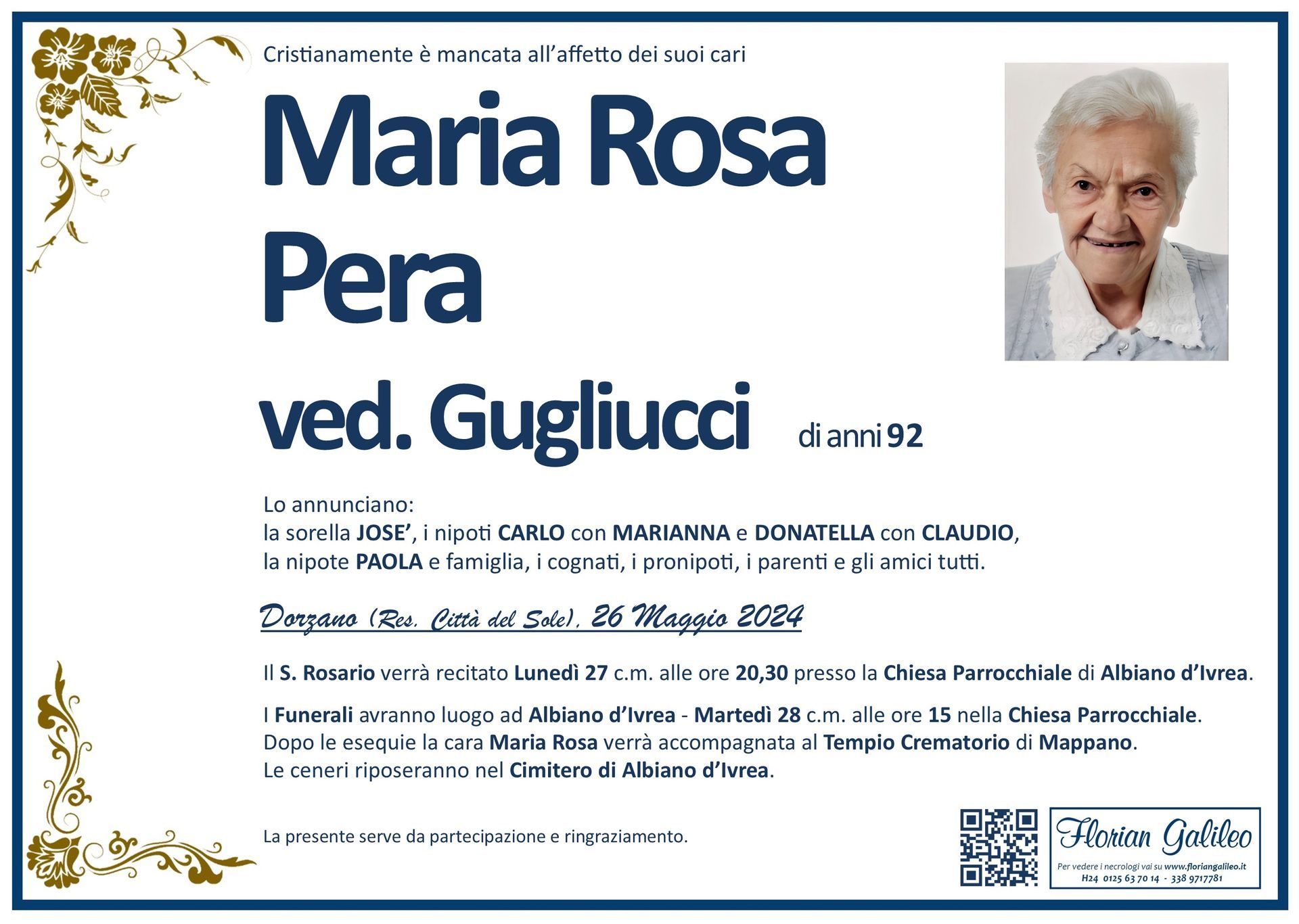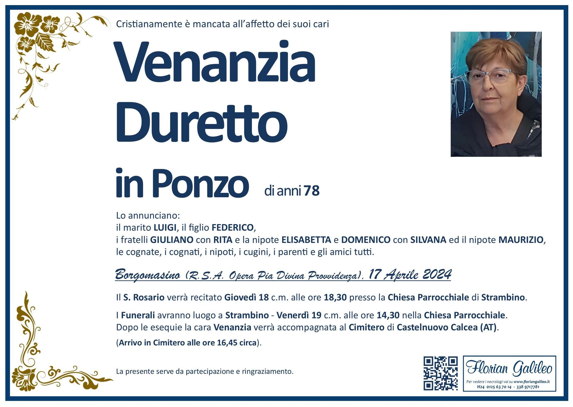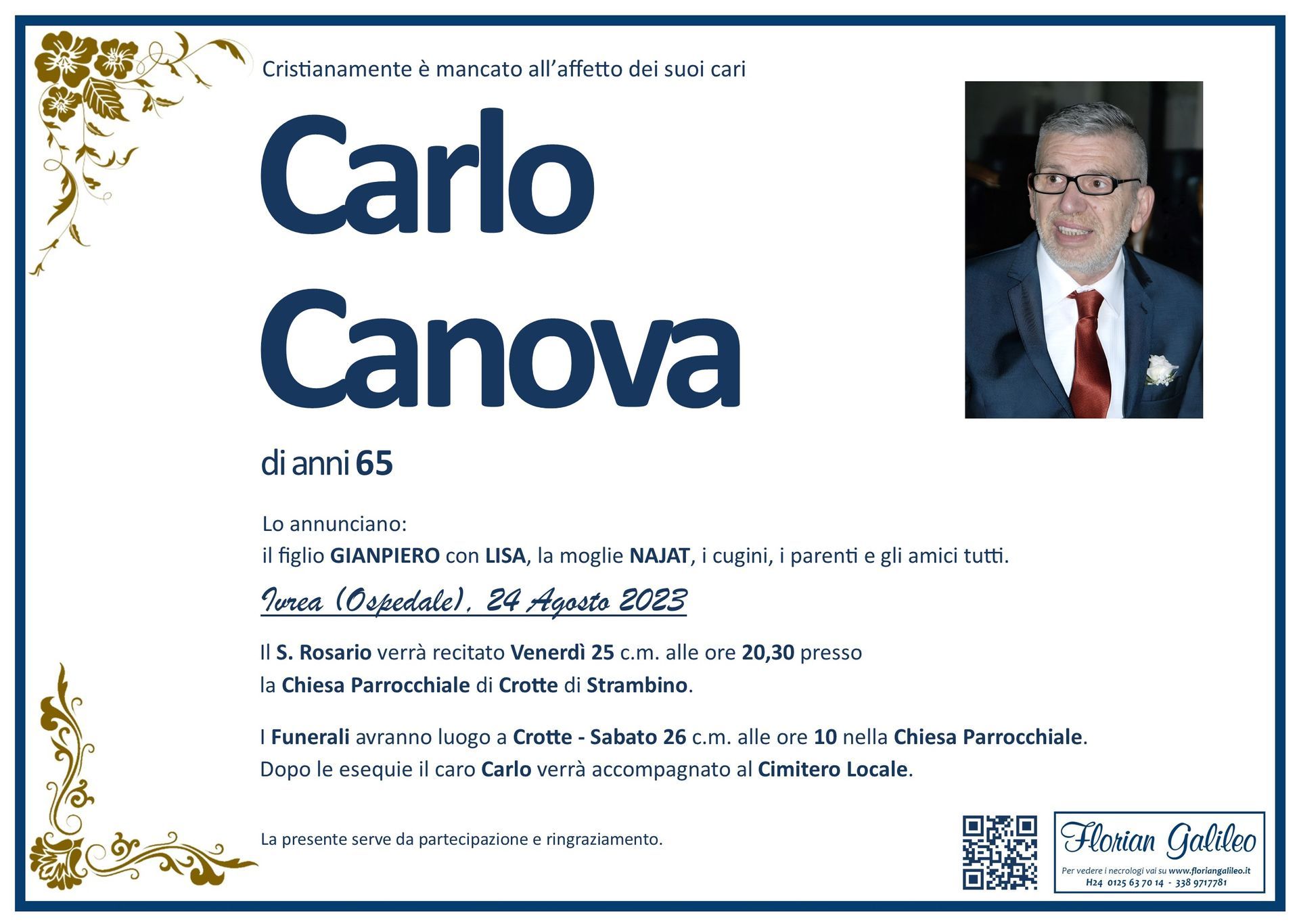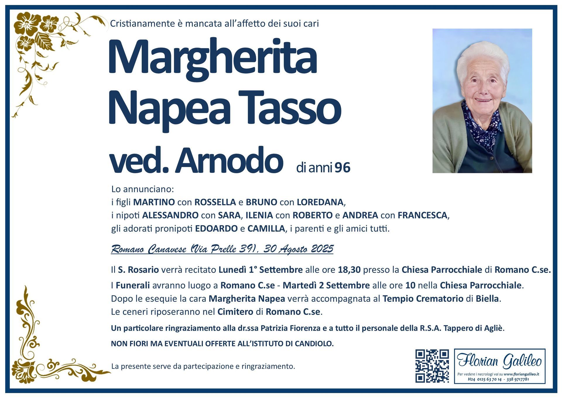 La Florian Galileo, ditta di Onoranze funebri di Strambino, Ivrea e dintorni ha creato questa pagina per rendere visibili anche on line le epigrafi dei cari defunti e per dare,