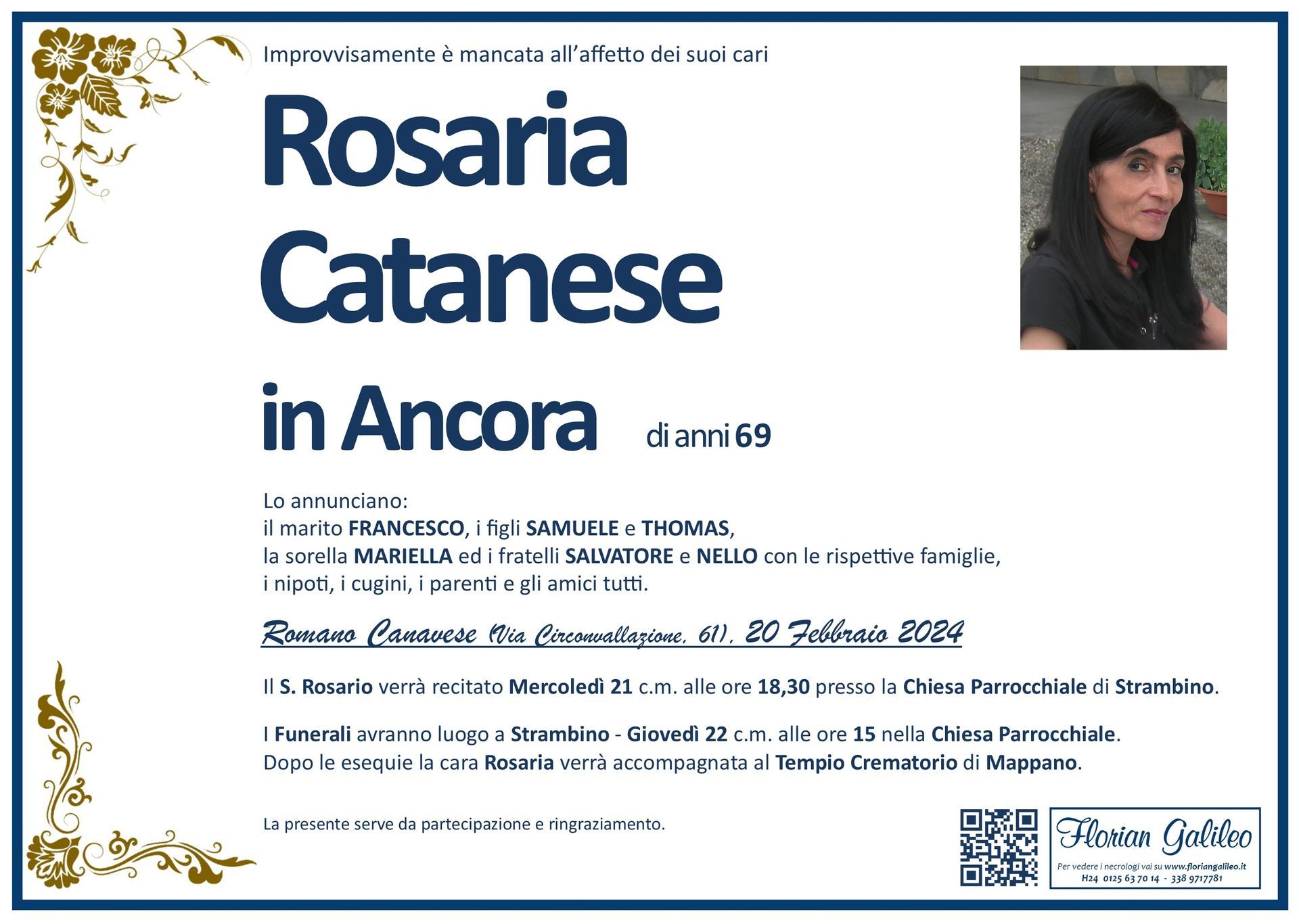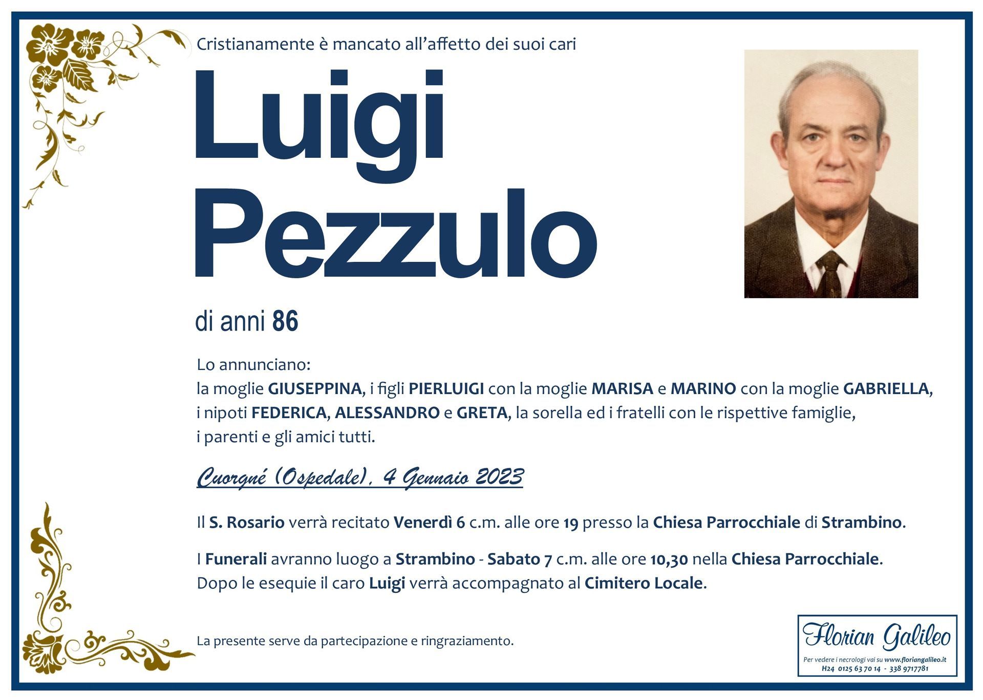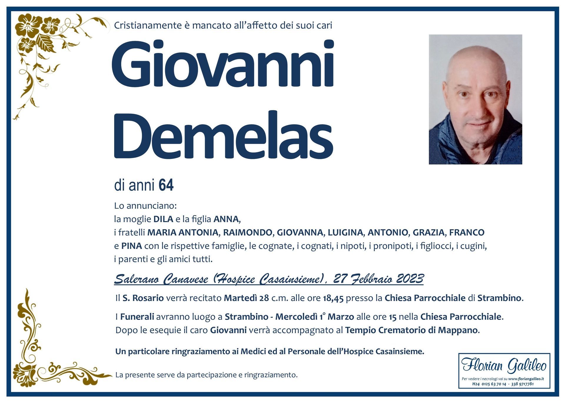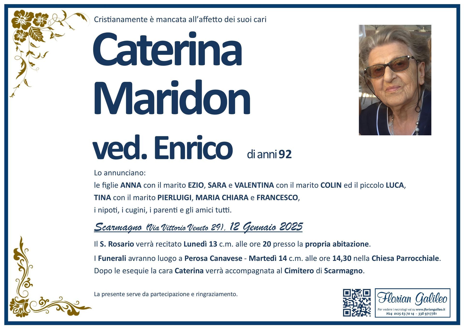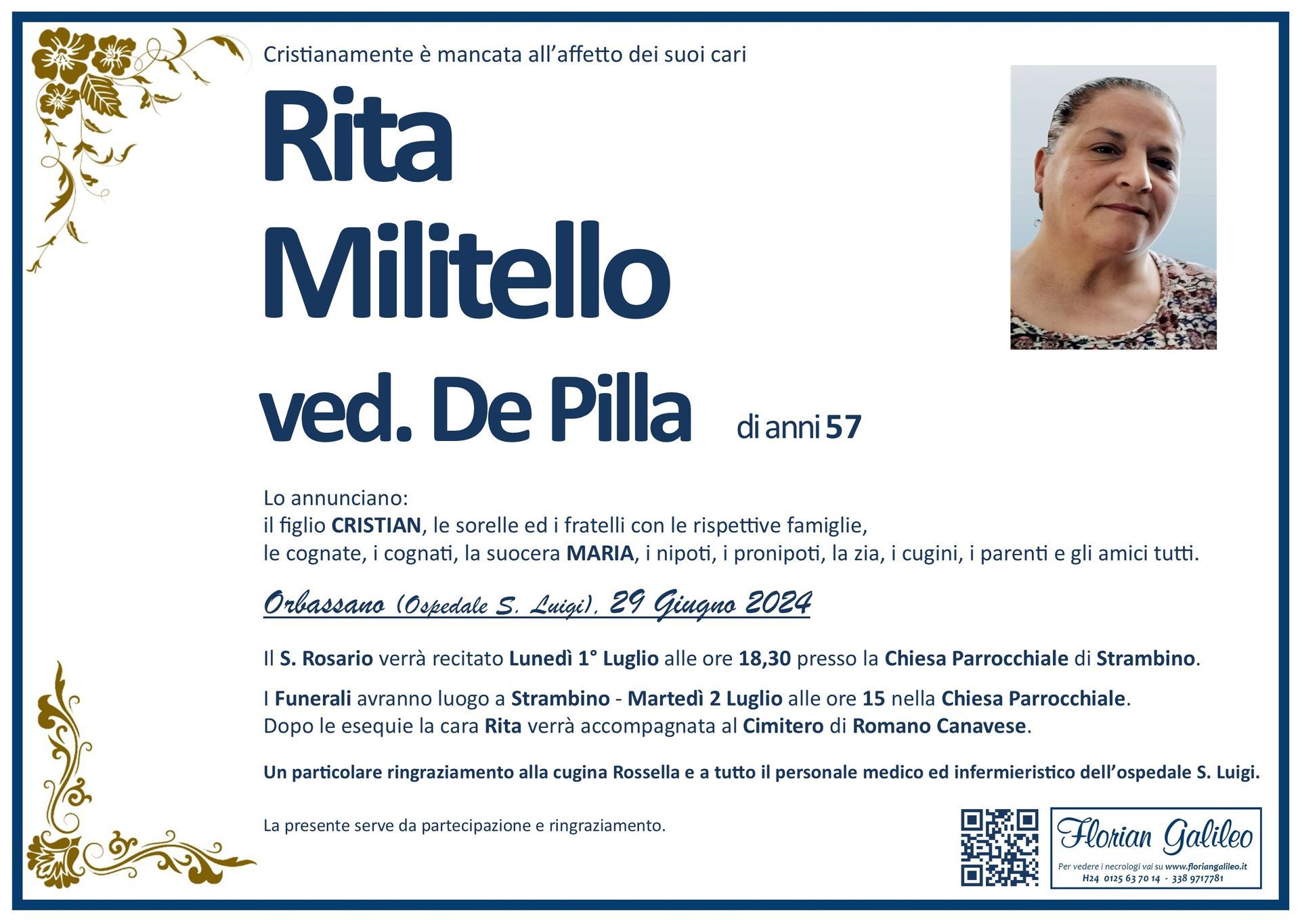 La Florian Galileo, ditta di Onoranze funebri di Strambino, Ivrea e dintorni ha creato questa pagina per rendere visibili anche on line le epigrafi dei cari defunti e per dare,