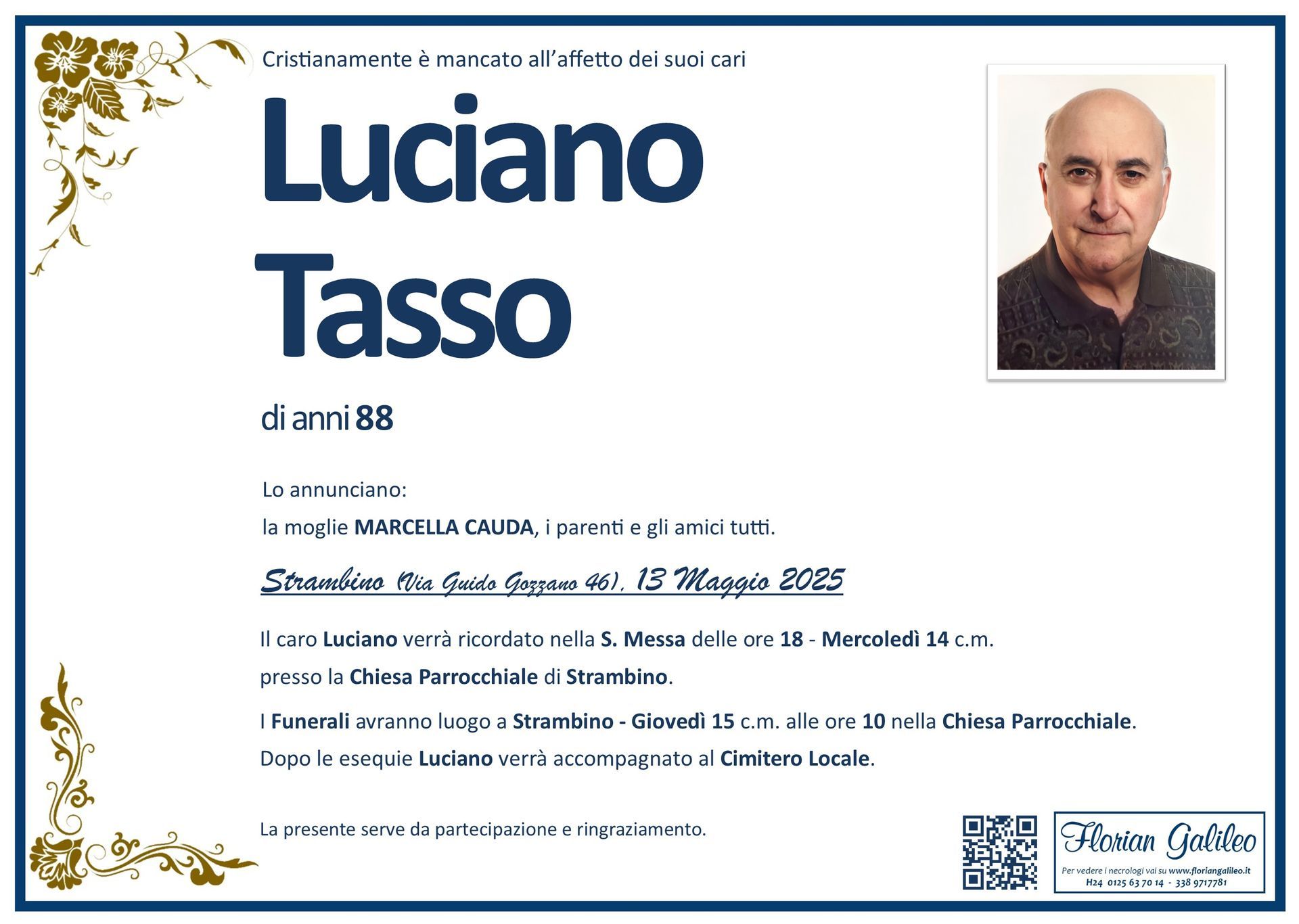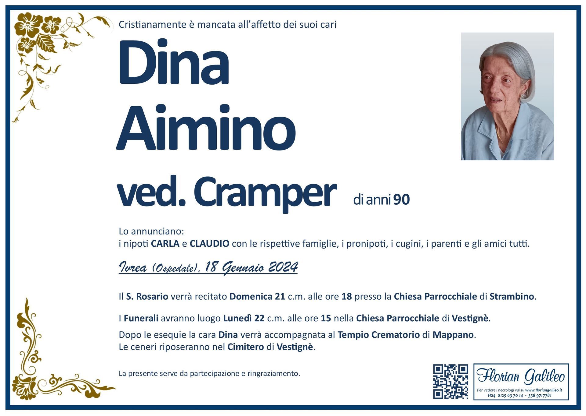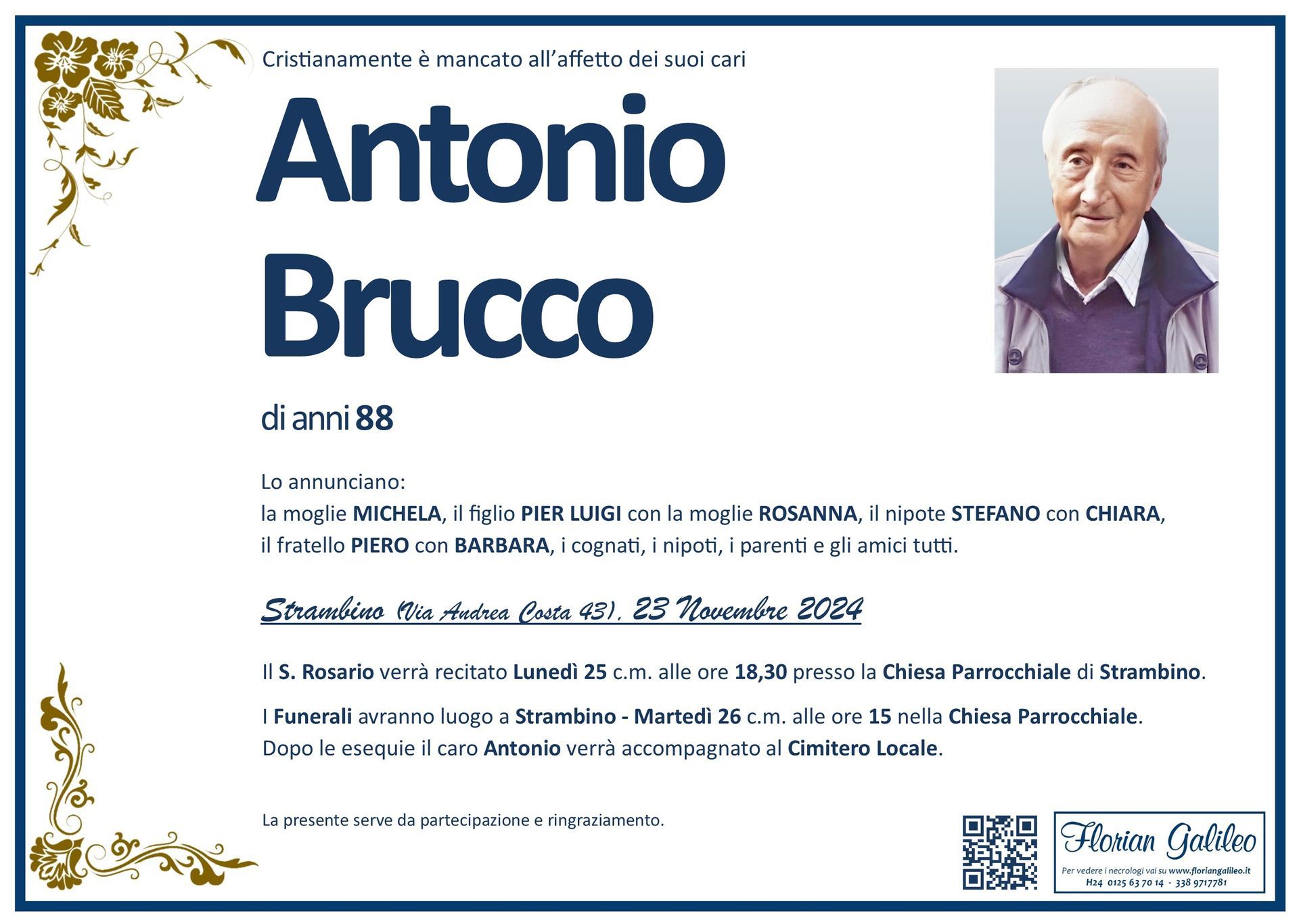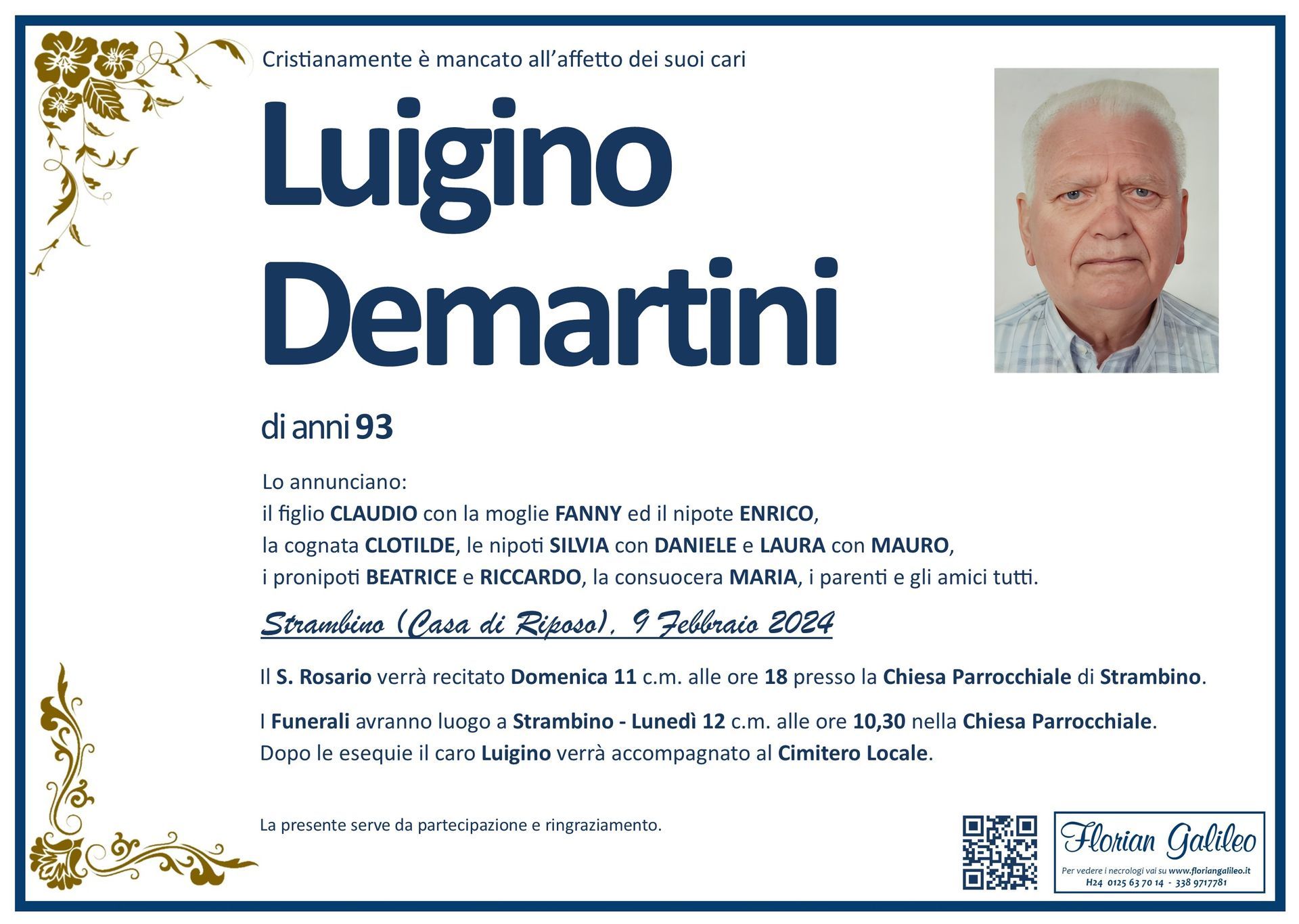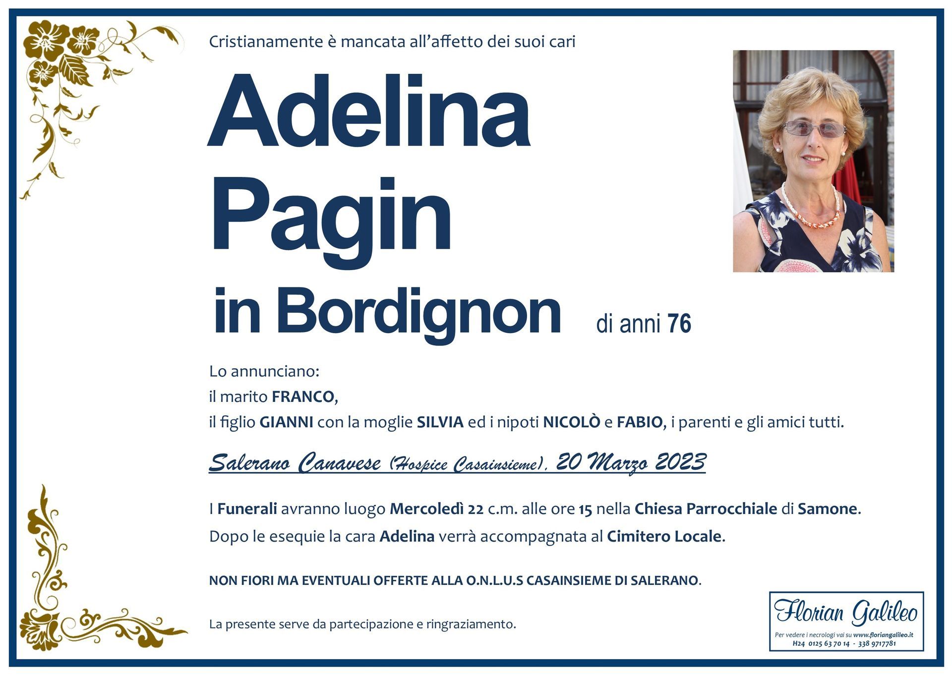 La Florian Galileo, ditta di Onoranze funebri di Strambino, Ivrea e dintorni ha creato questa pagina per rendere visibili anche on line le epigrafi dei cari defunti e per dare,