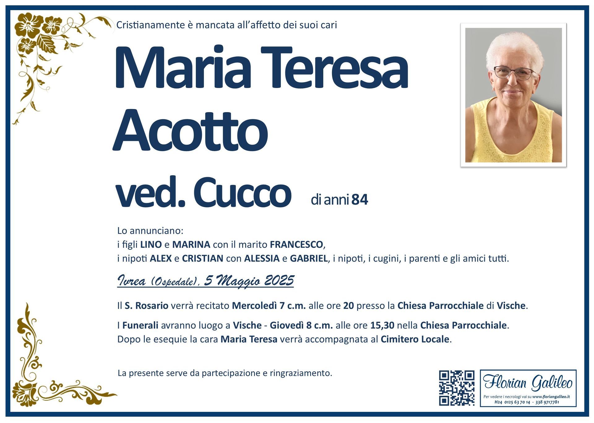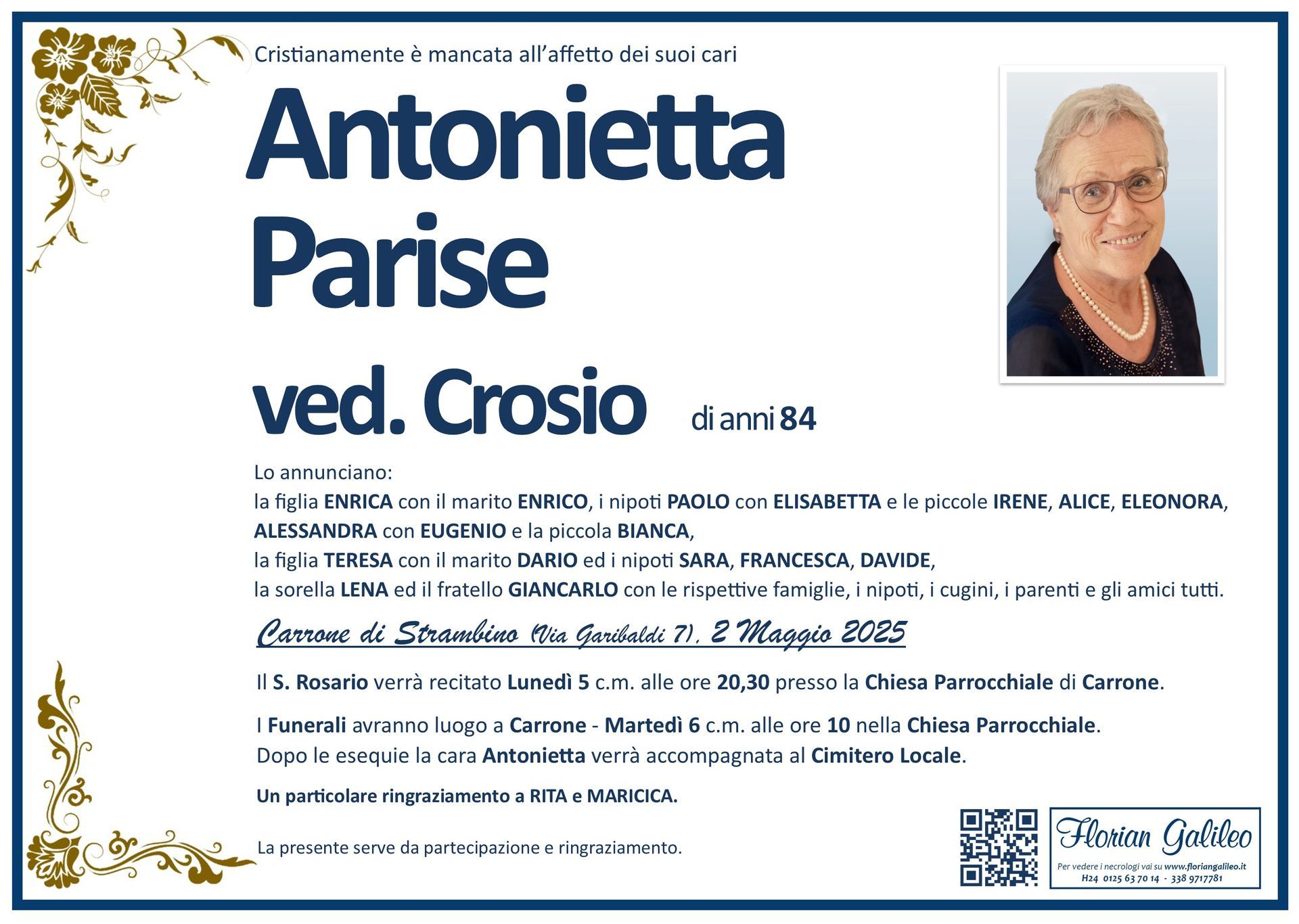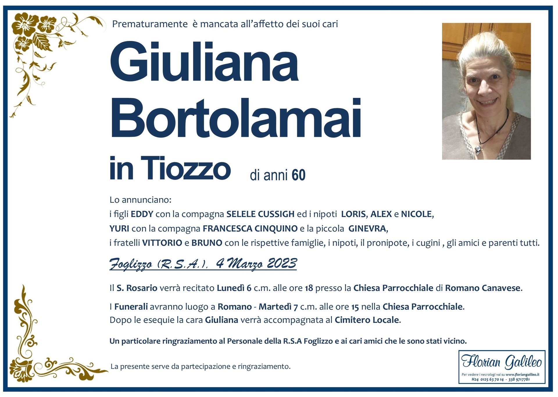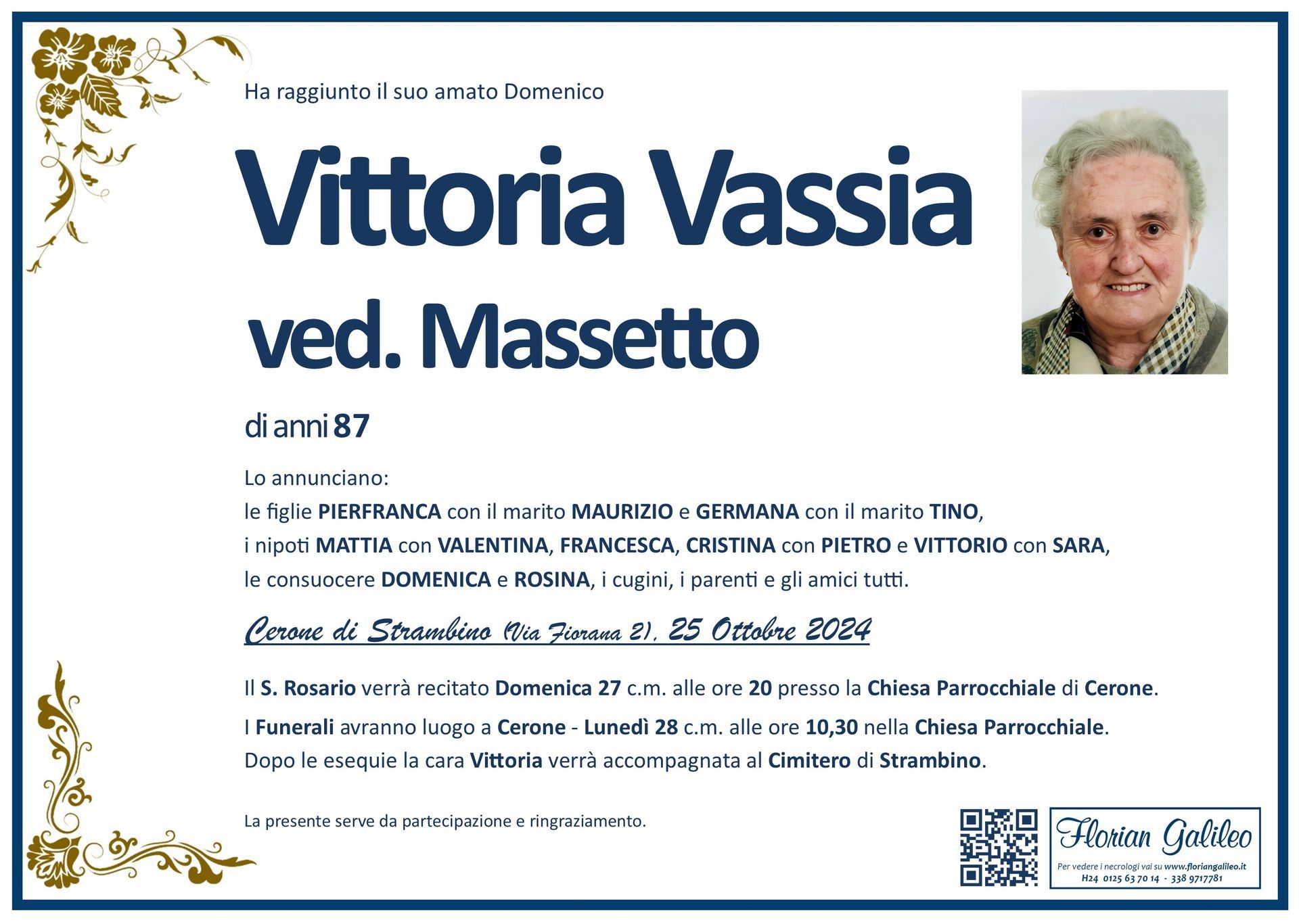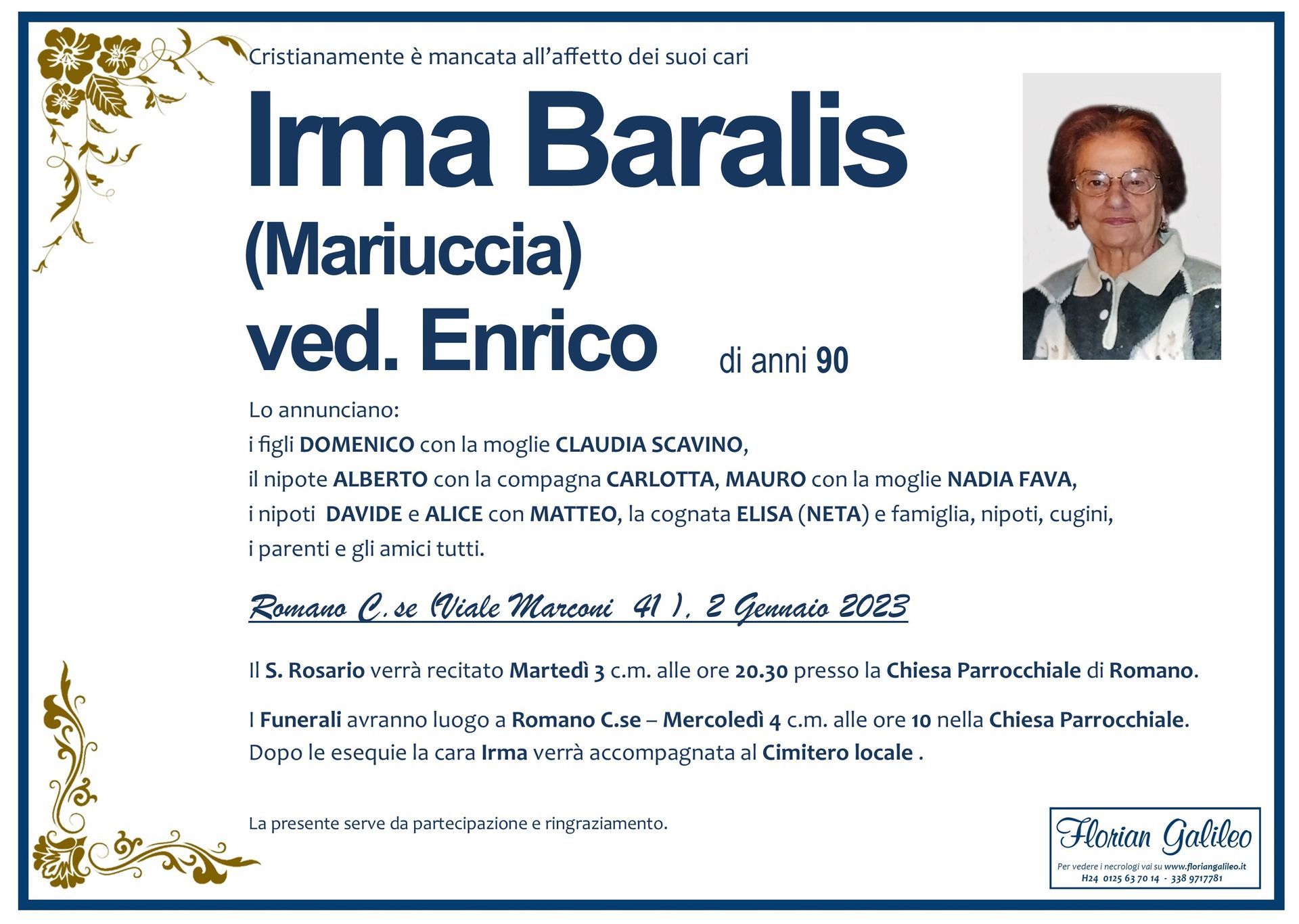 La Florian Galileo, ditta di Onoranze funebri di Strambino, Ivrea e dintorni ha creato questa pagina per rendere visibili anche on line le epigrafi dei cari defunti e per dare,