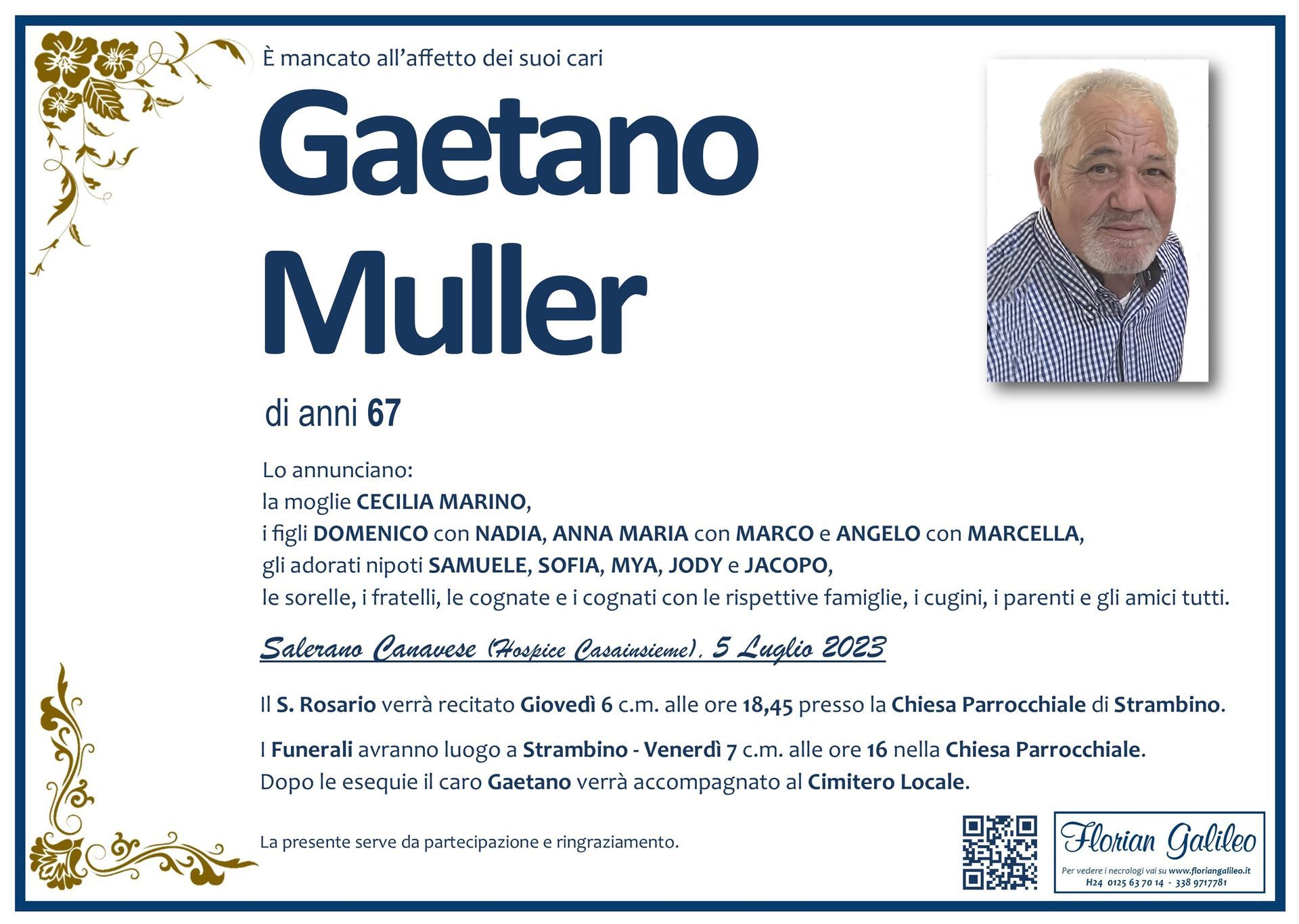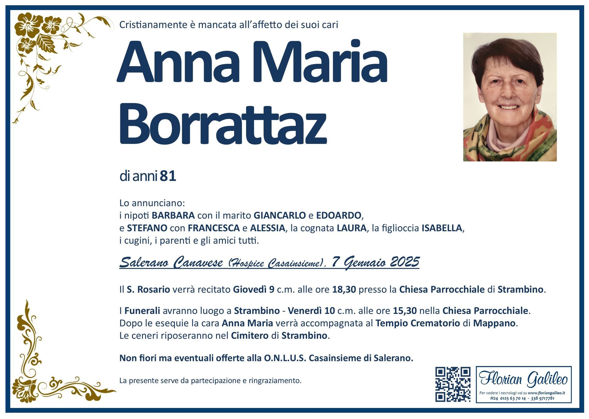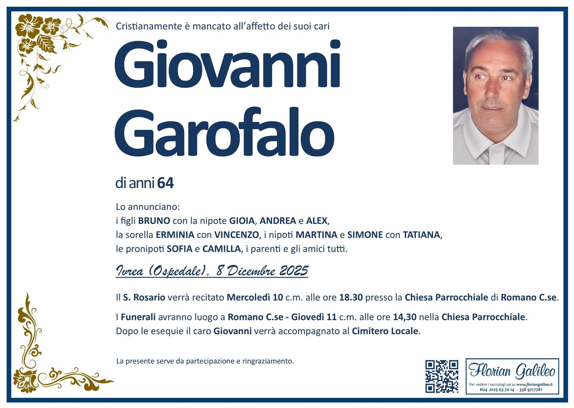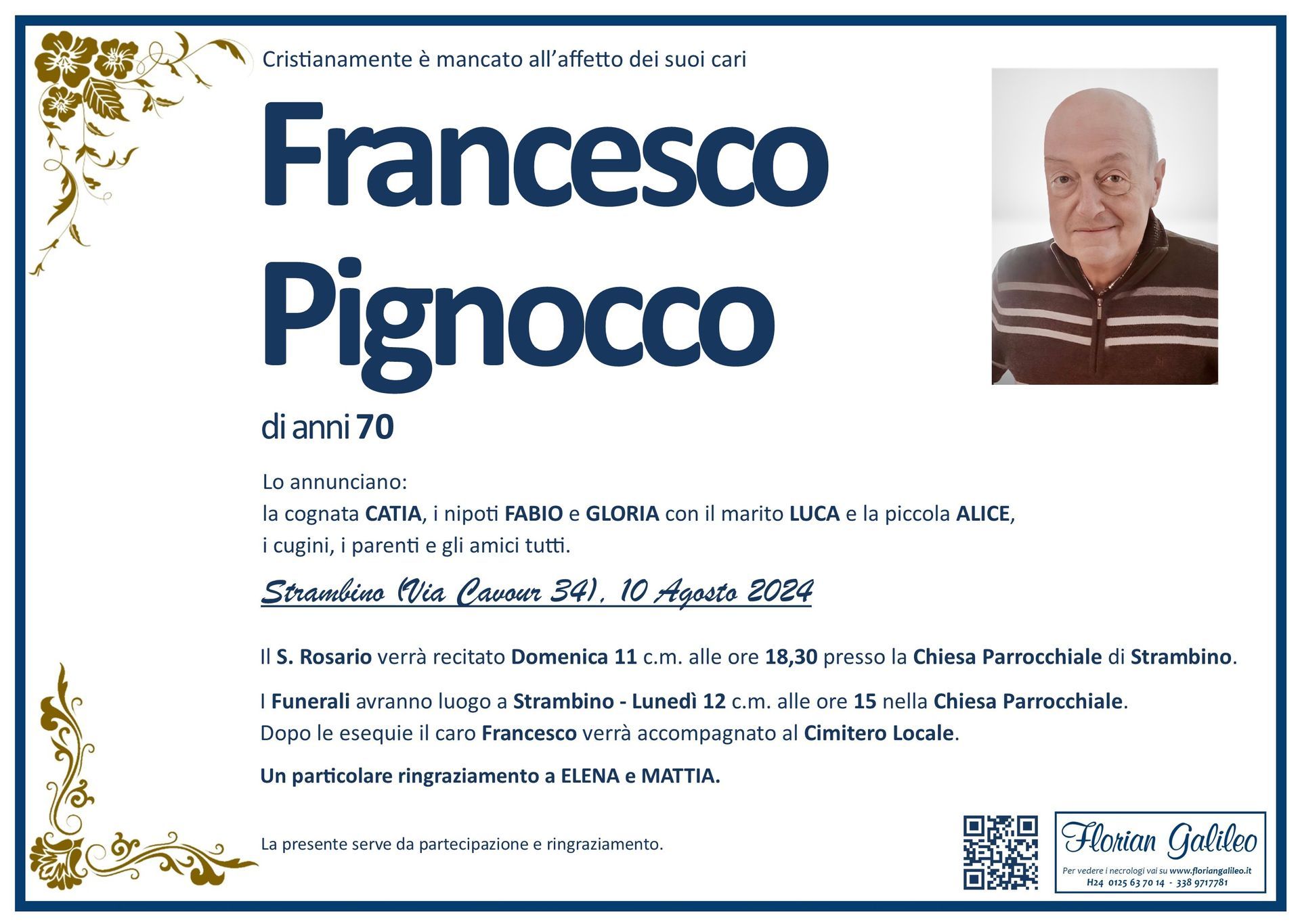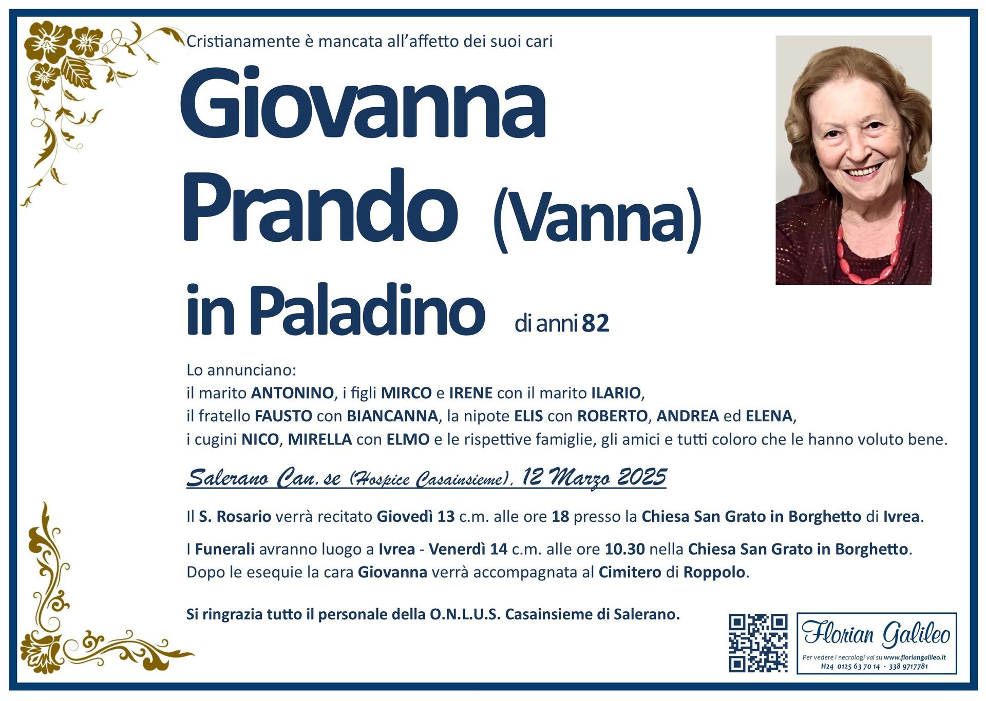 La Florian Galileo, ditta di Onoranze funebri di Strambino, Ivrea e dintorni ha creato questa pagina per rendere visibili anche on line le epigrafi dei cari defunti e per dare,