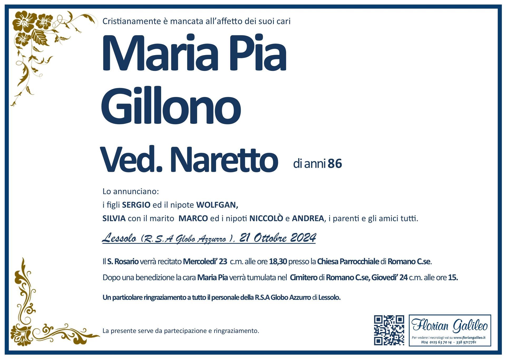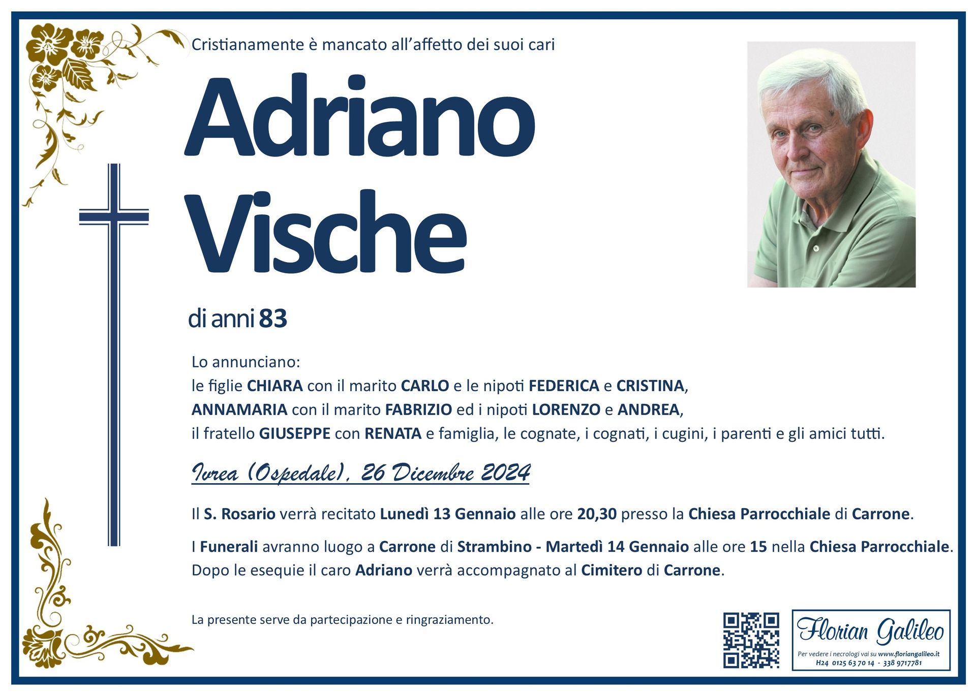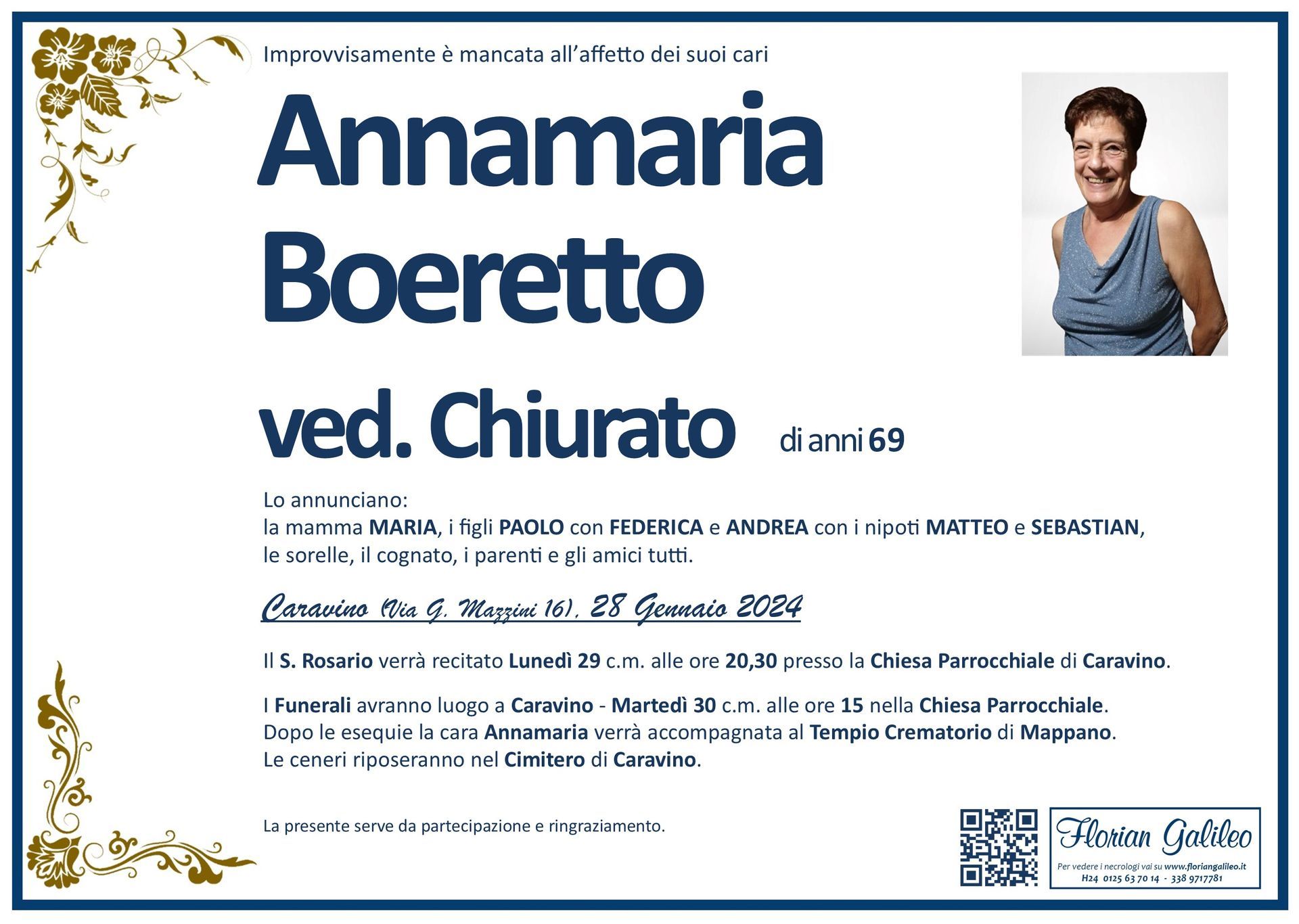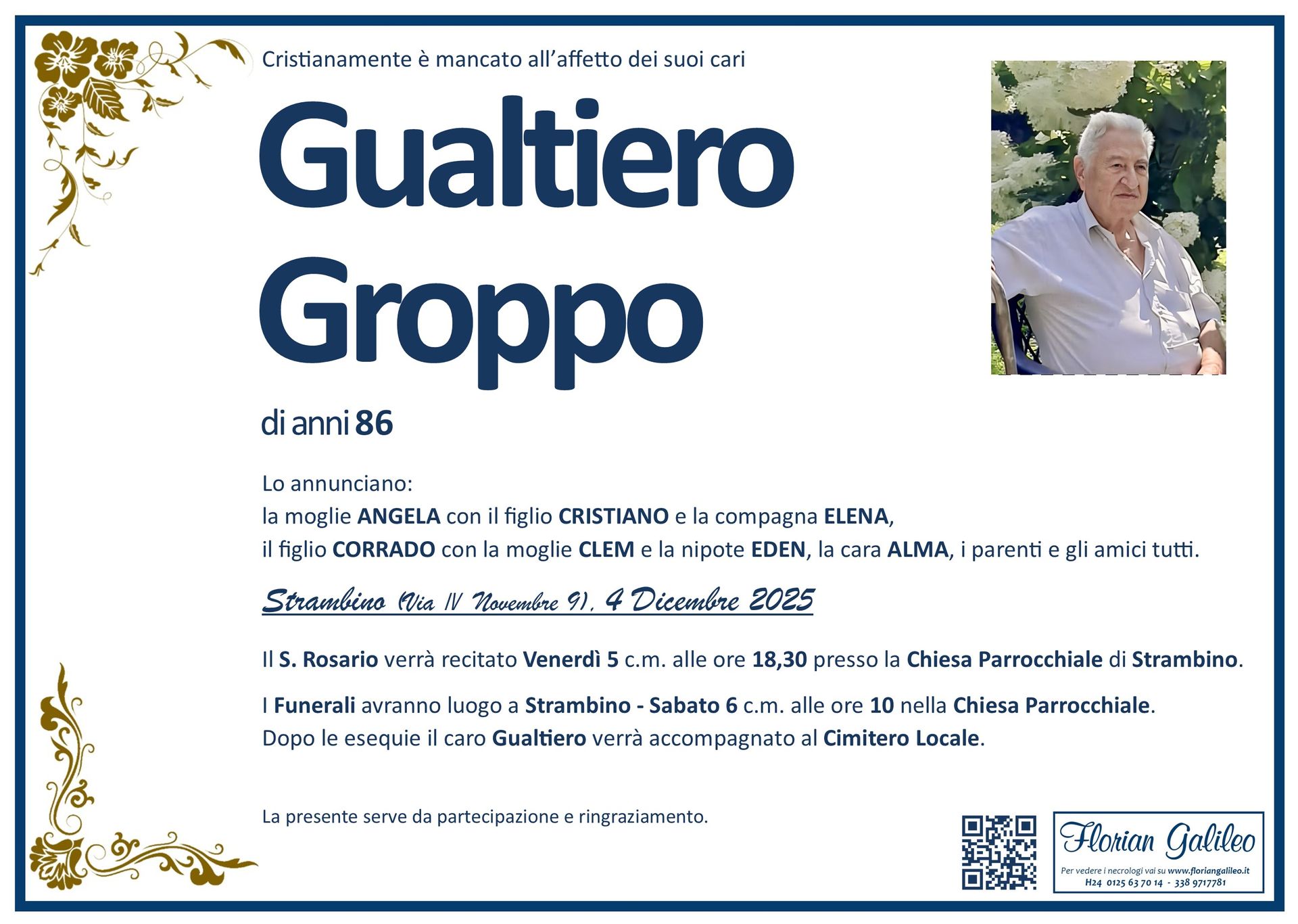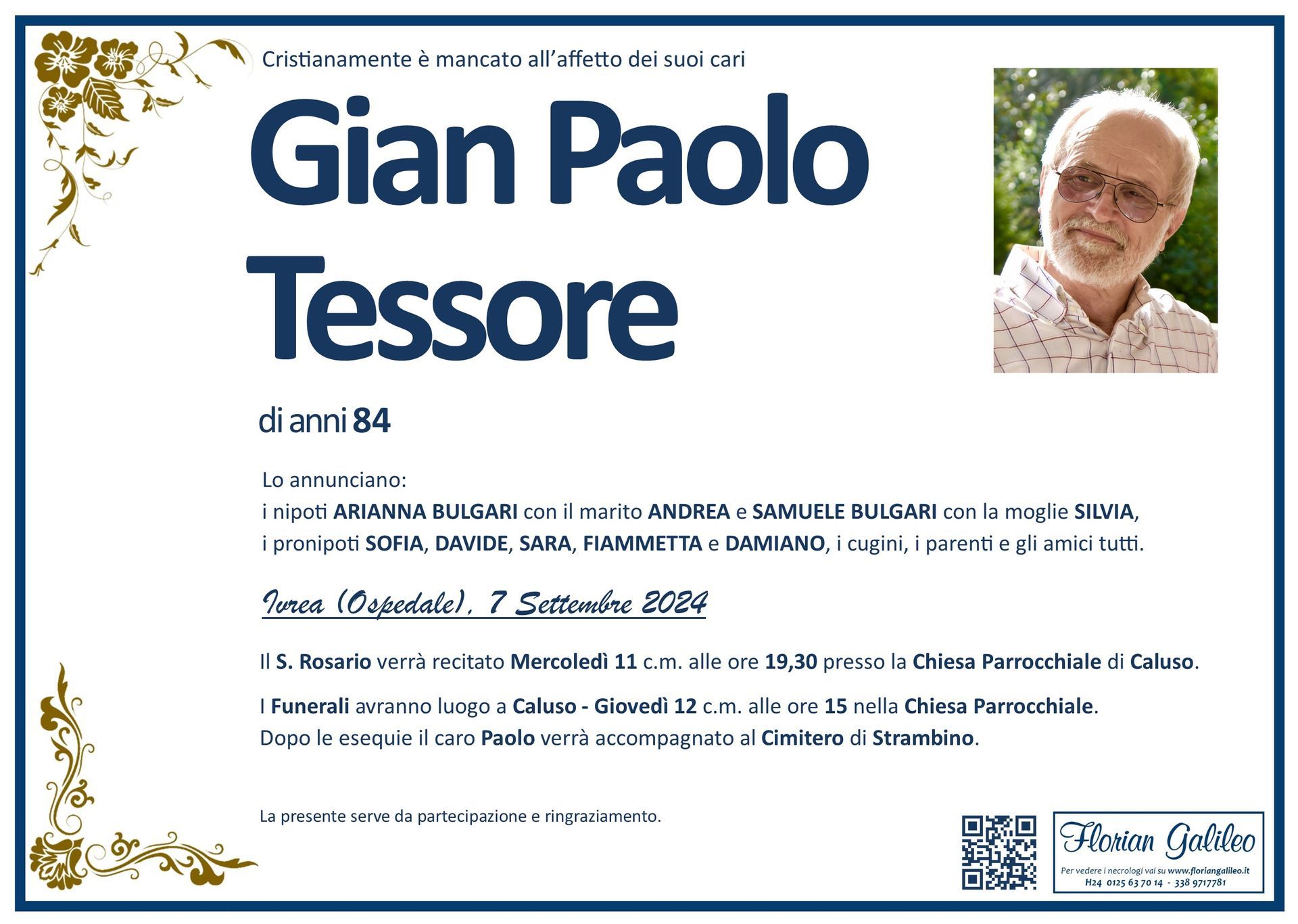 La Florian Galileo, ditta di Onoranze funebri di Strambino, Ivrea e dintorni ha creato questa pagina per rendere visibili anche on line le epigrafi dei cari defunti e per dare,