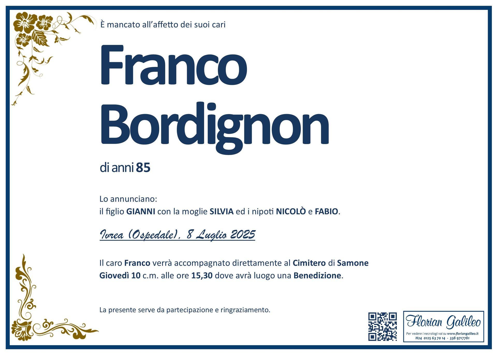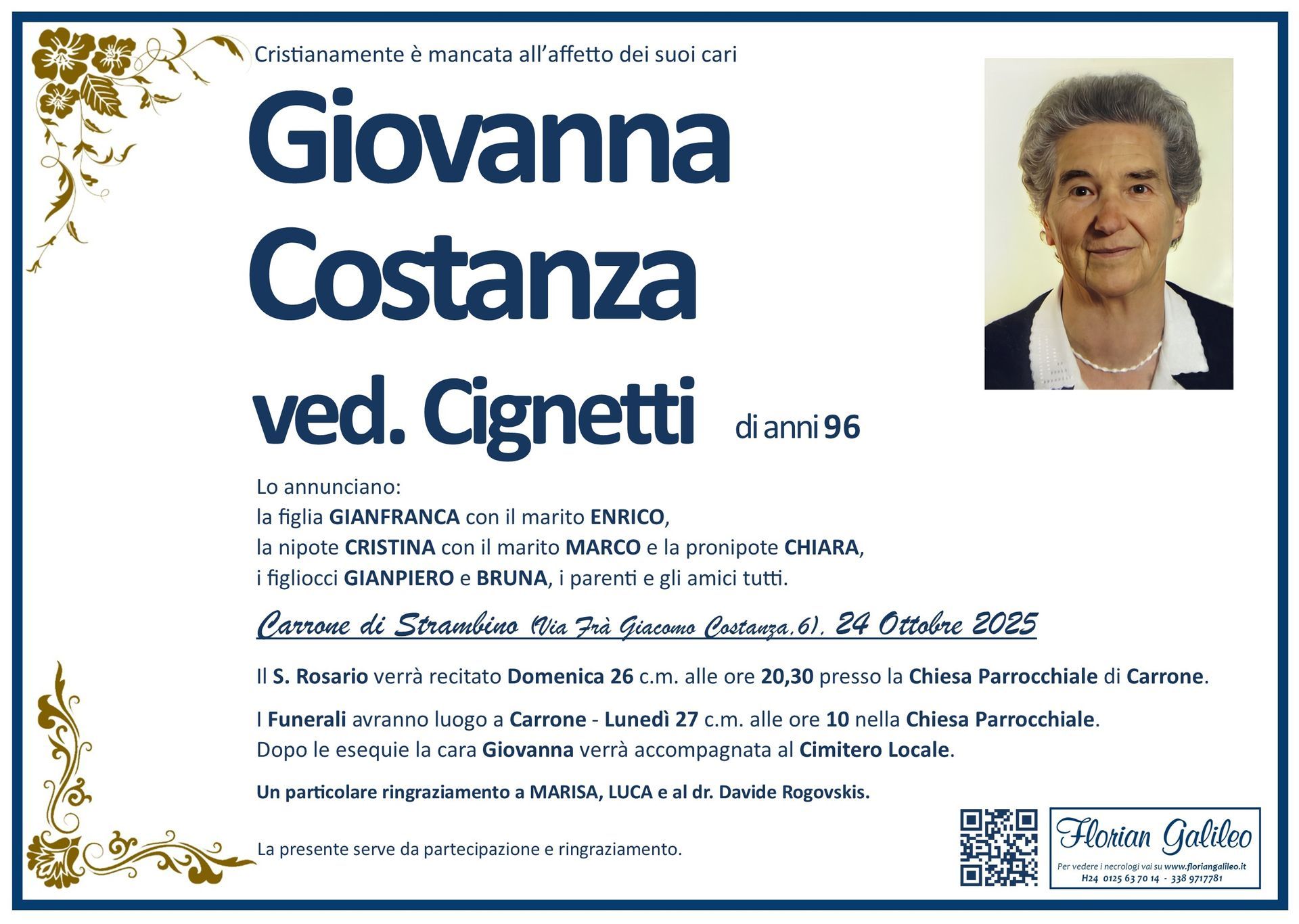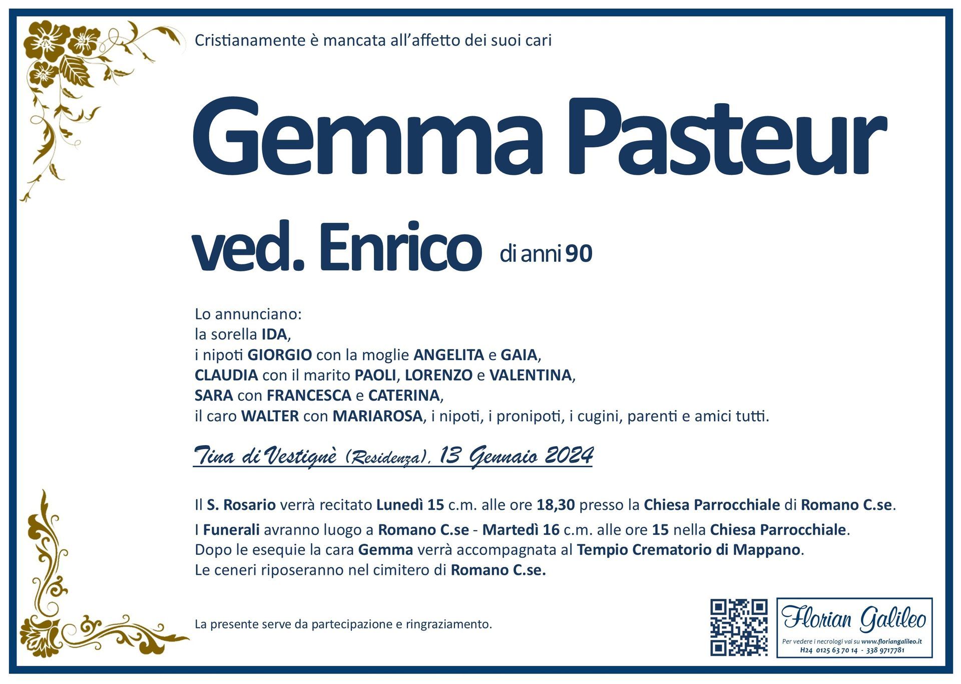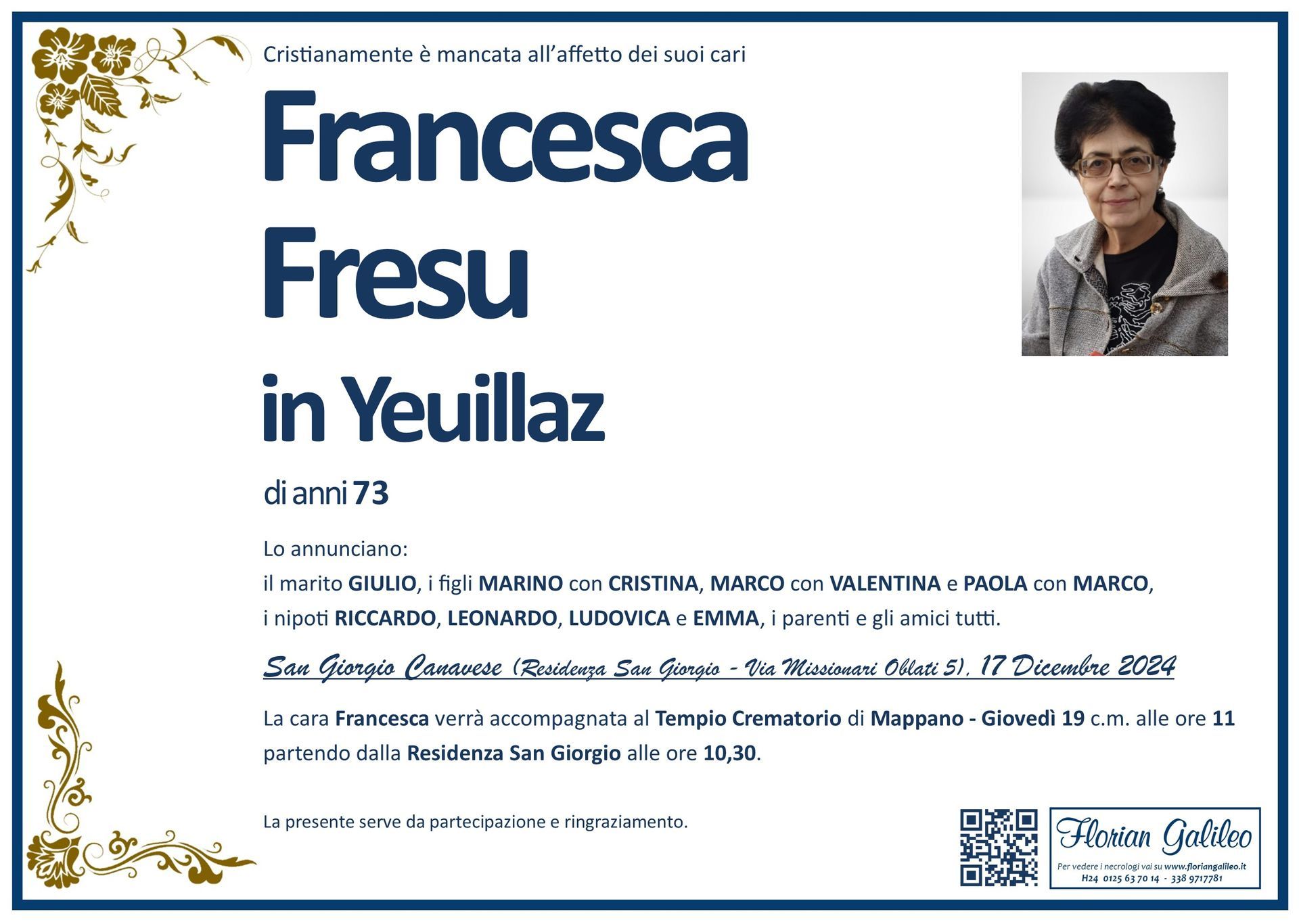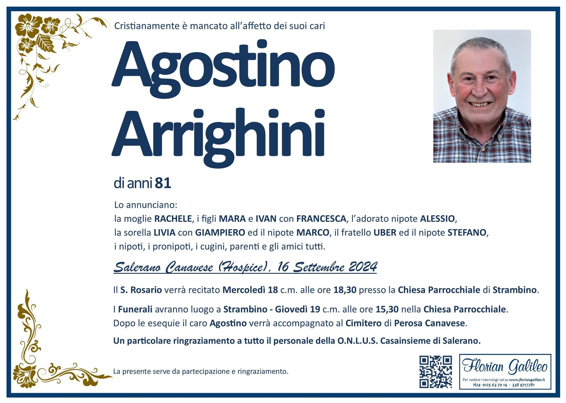 La Florian Galileo, ditta di Onoranze funebri di Strambino, Ivrea e dintorni ha creato questa pagina per rendere visibili anche on line le epigrafi dei cari defunti e per dare,