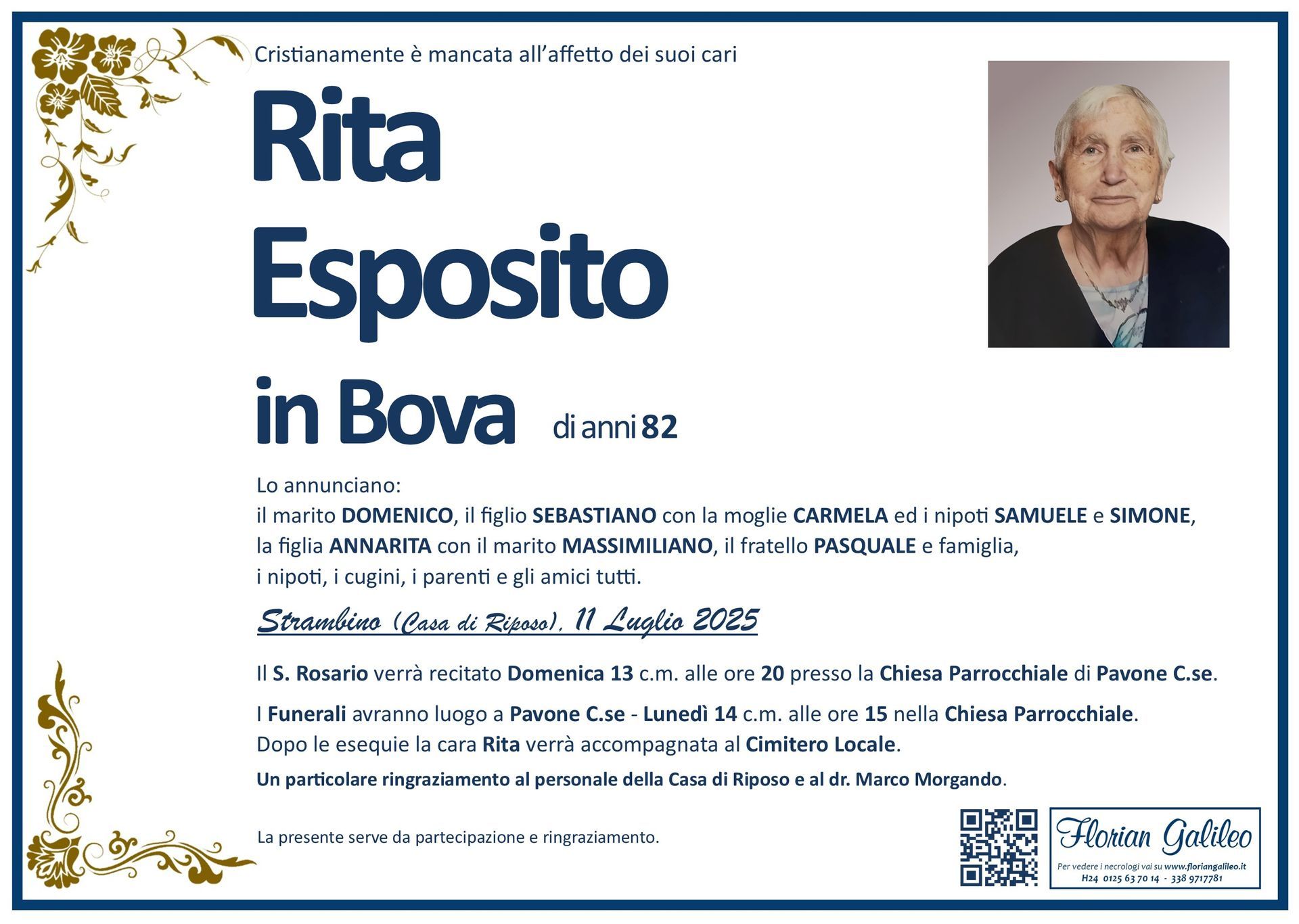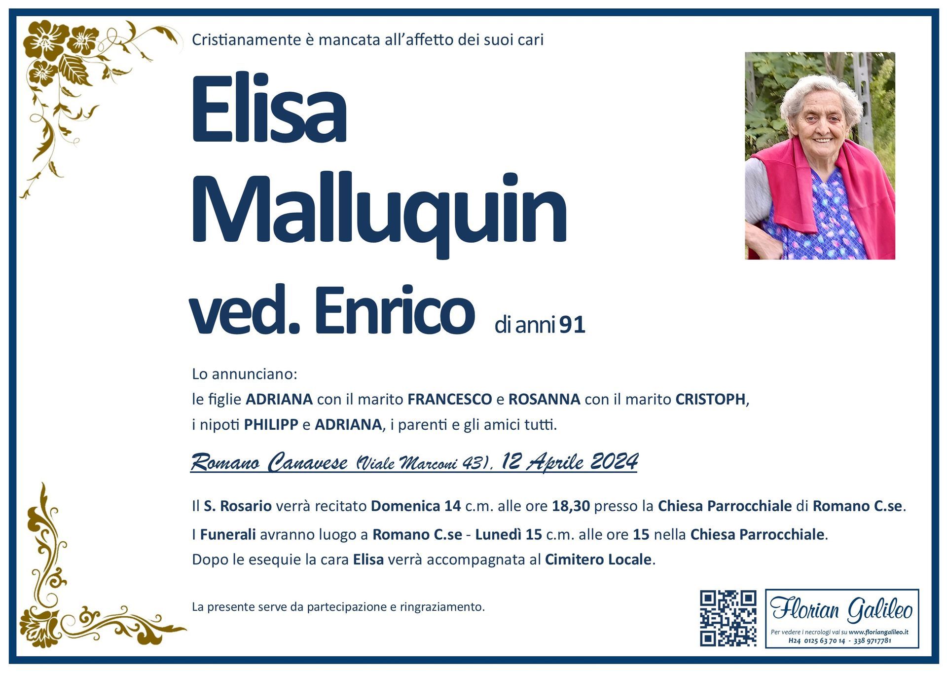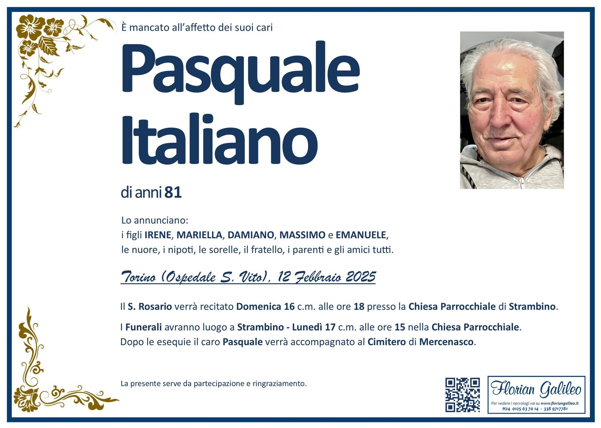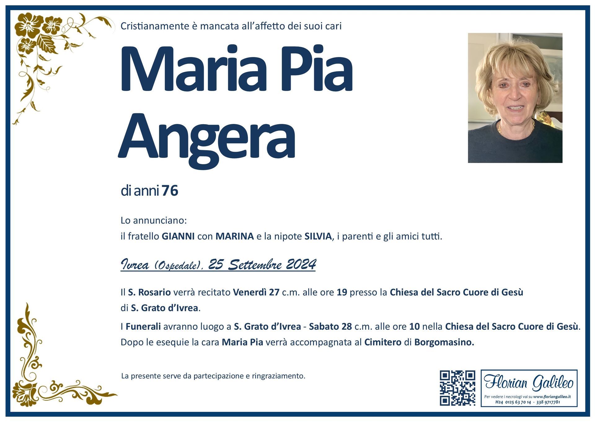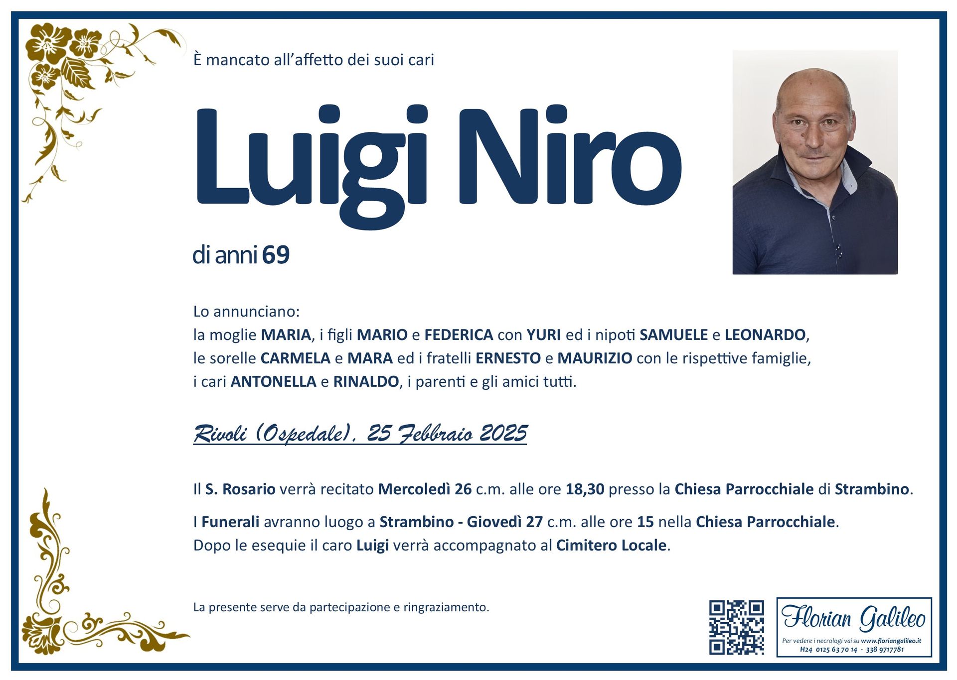 La Florian Galileo, ditta di Onoranze funebri di Strambino, Ivrea e dintorni ha creato questa pagina per rendere visibili anche on line le epigrafi dei cari defunti e per dare,
