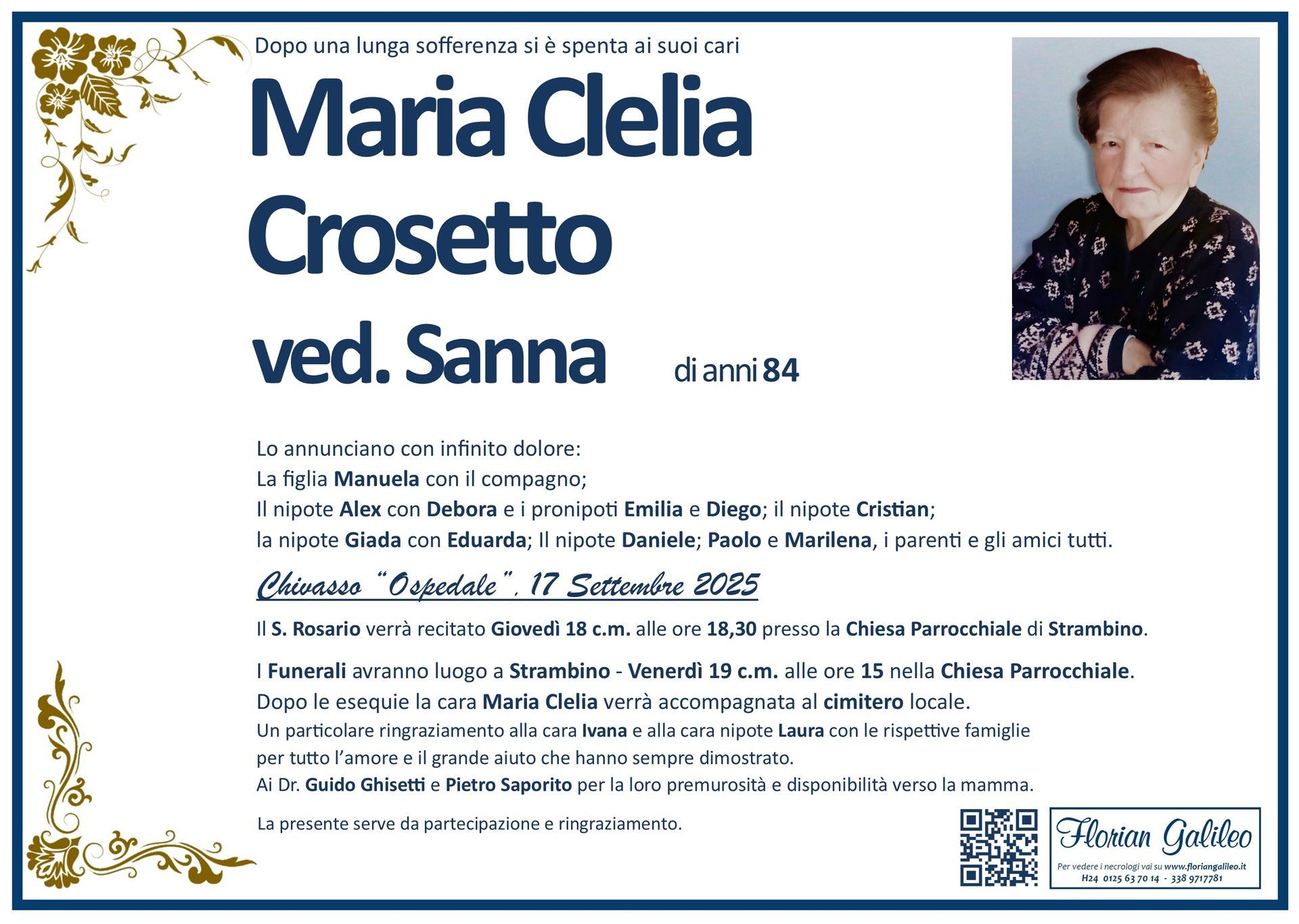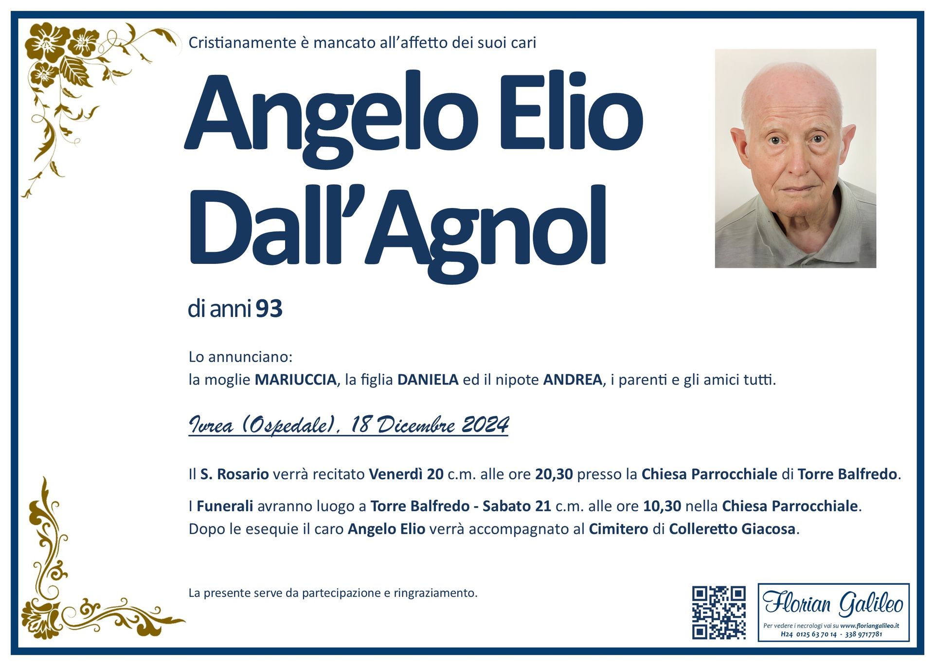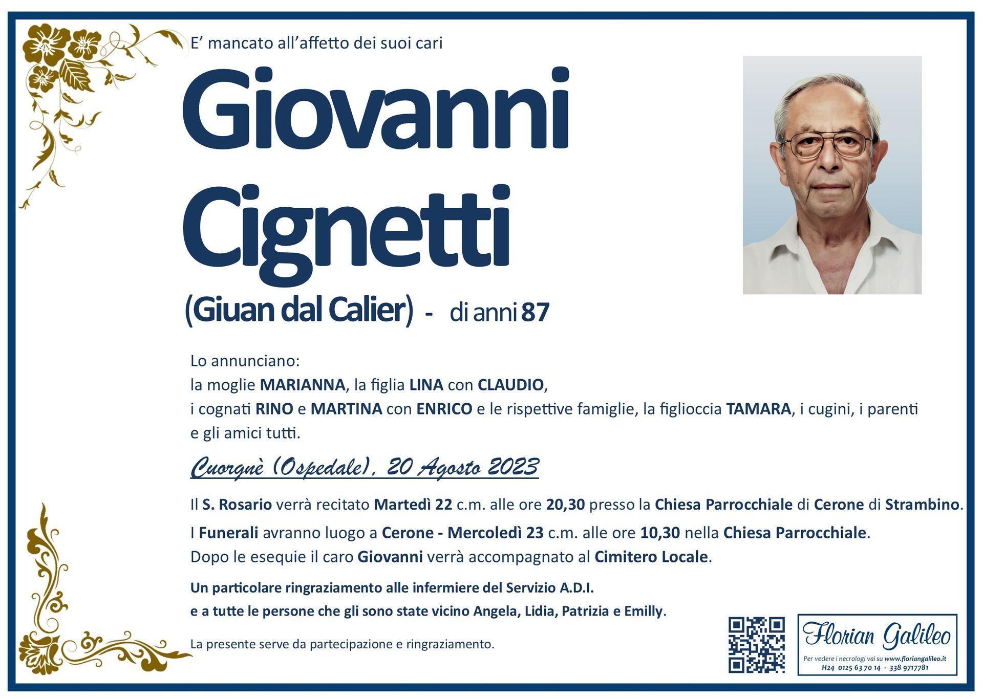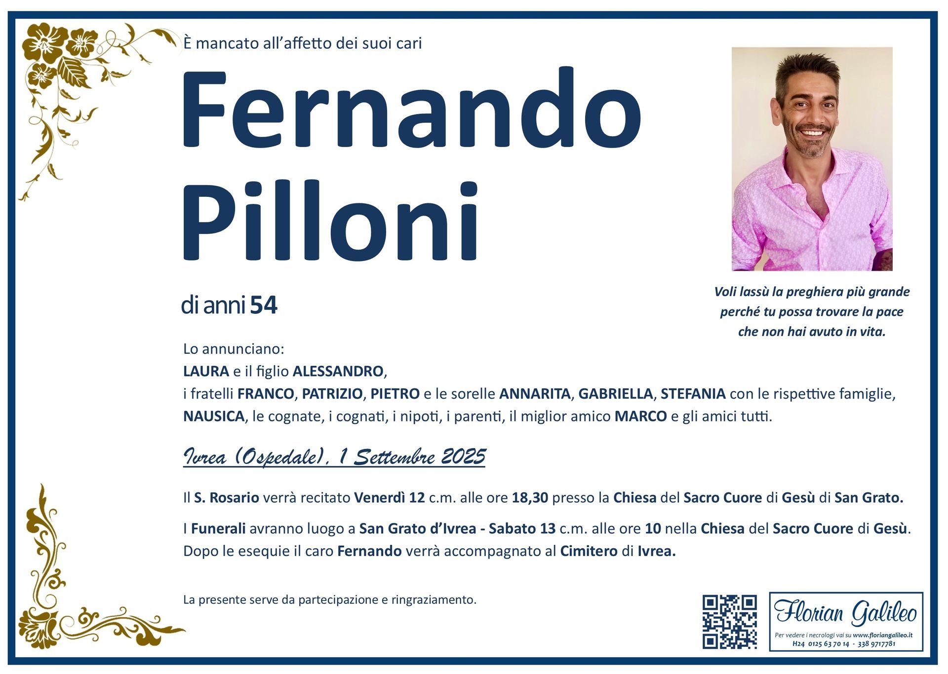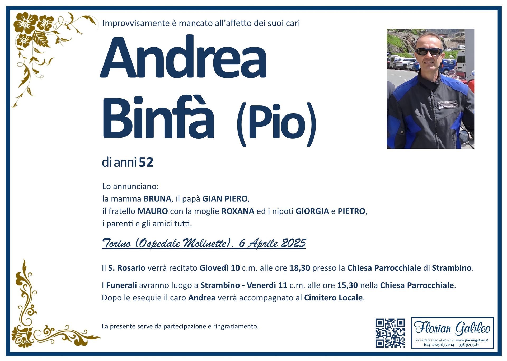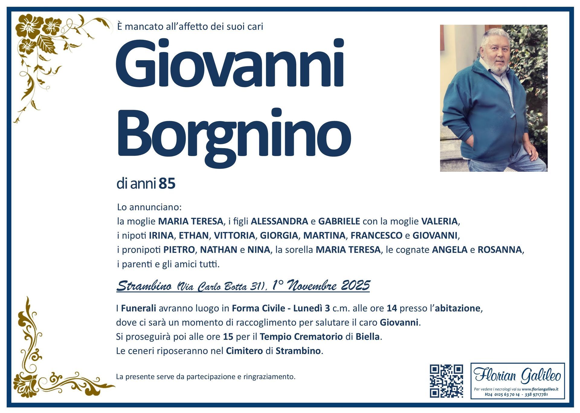 La Florian Galileo, ditta di Onoranze funebri di Strambino, Ivrea e dintorni ha creato questa pagina per rendere visibili anche on line le epigrafi dei cari defunti e per dare,