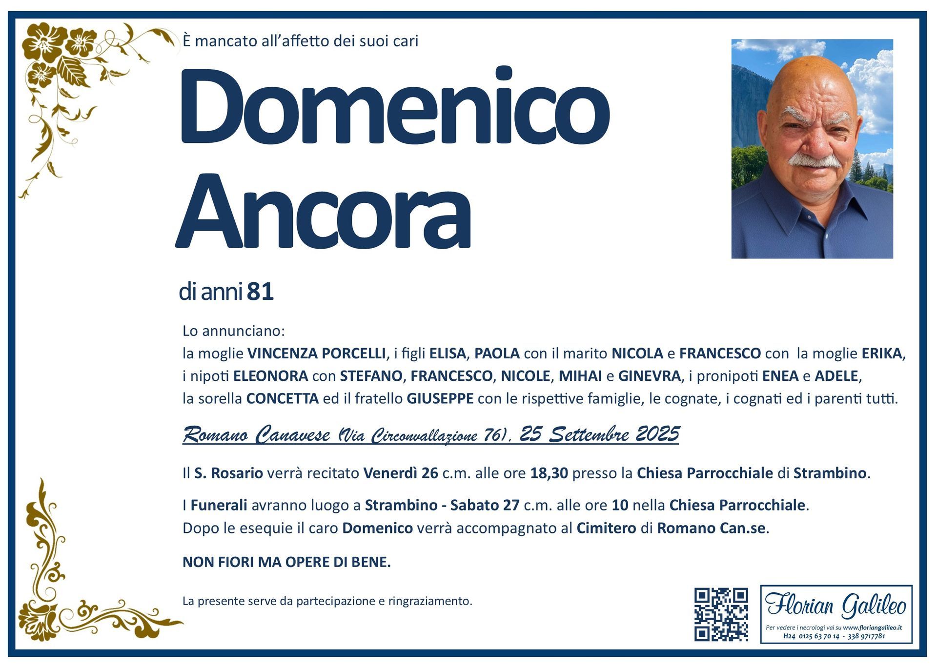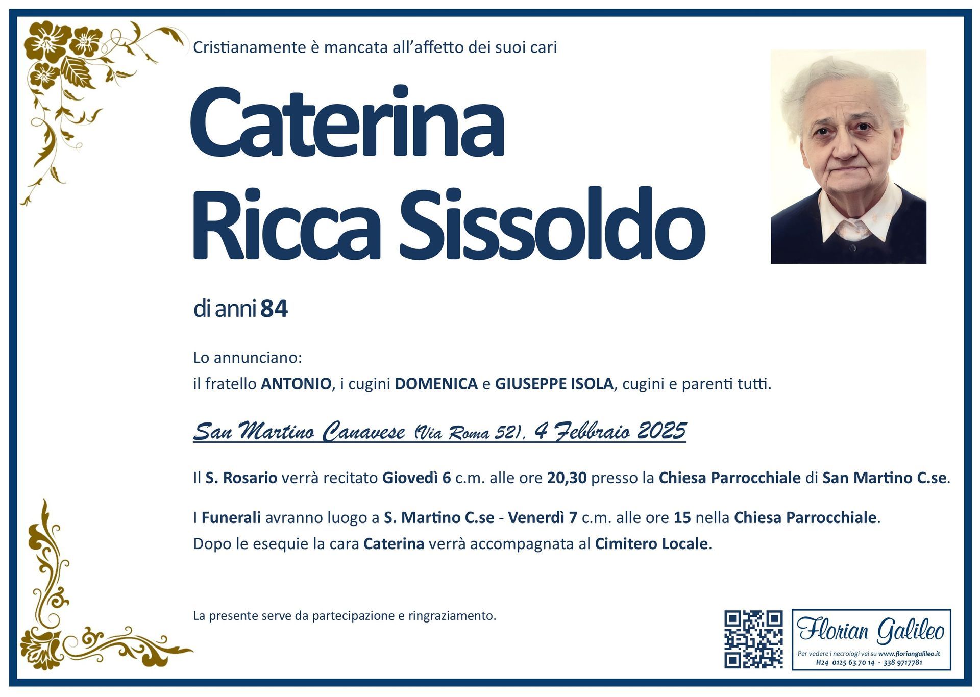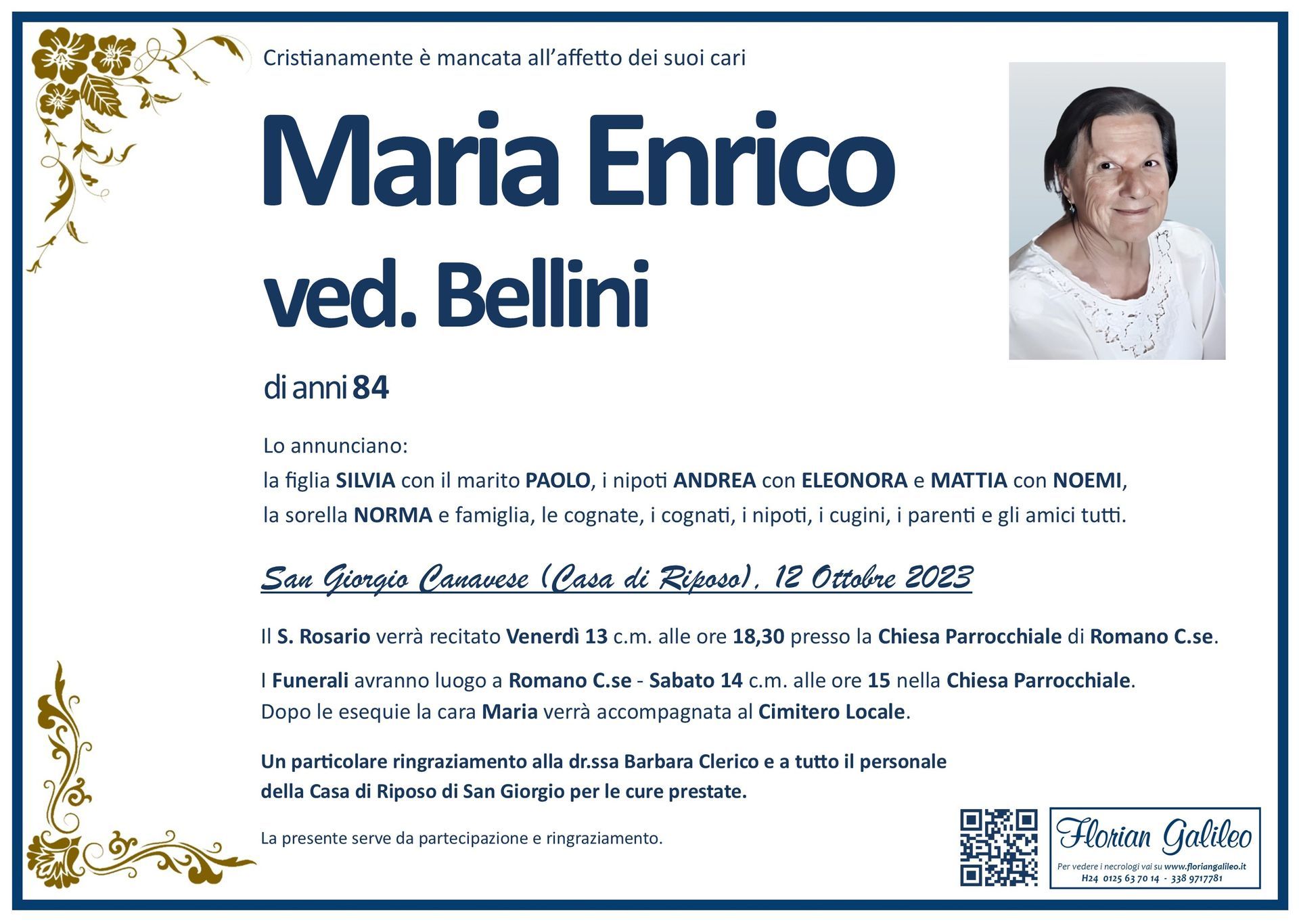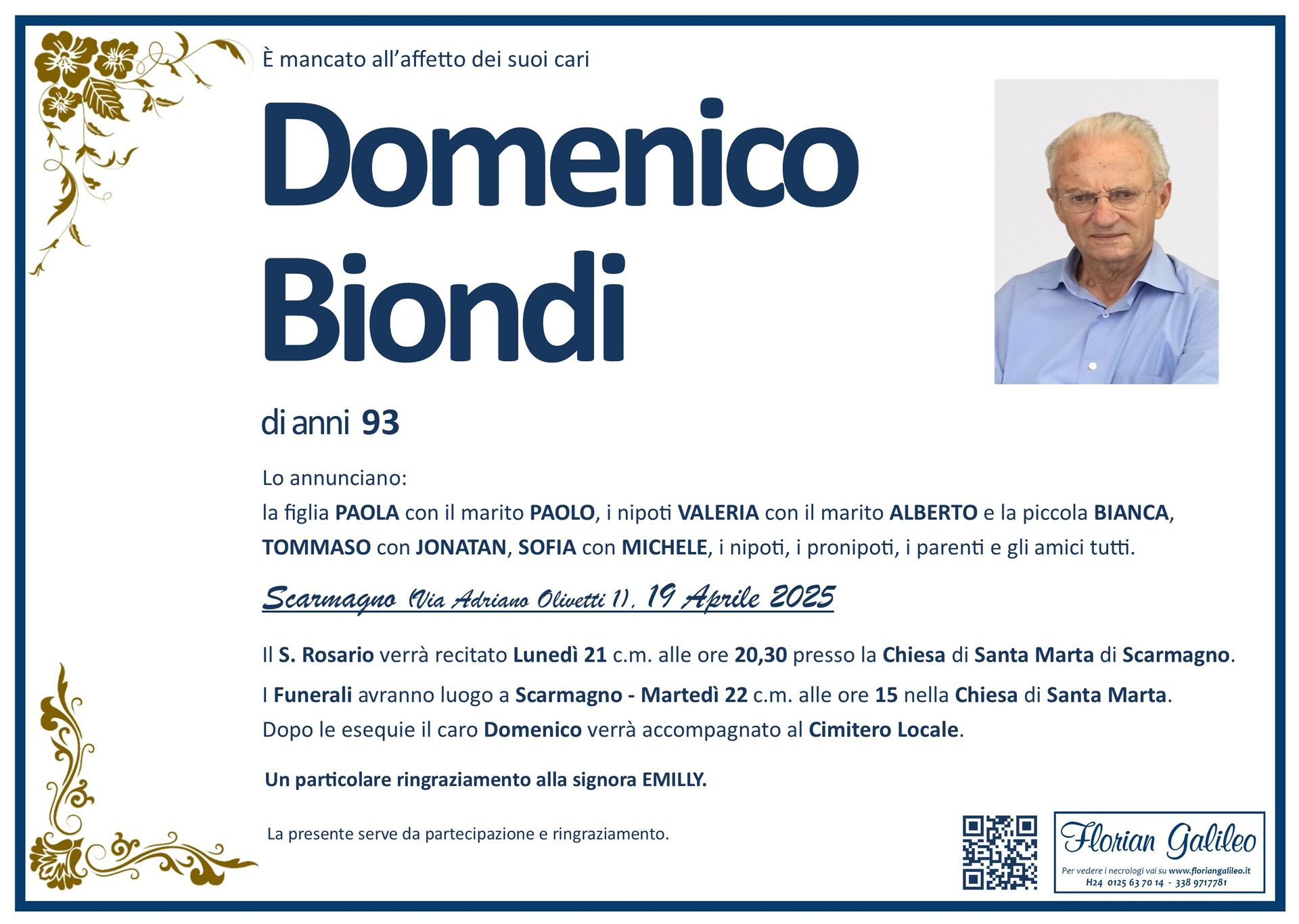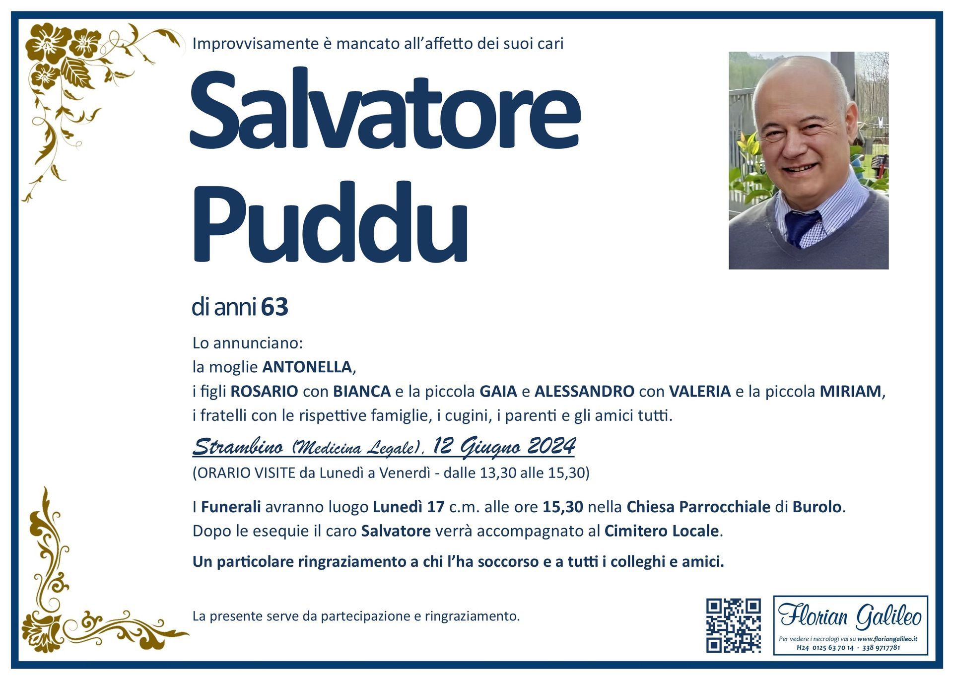 La Florian Galileo, ditta di Onoranze funebri di Strambino, Ivrea e dintorni ha creato questa pagina per rendere visibili anche on line le epigrafi dei cari defunti e per dare,