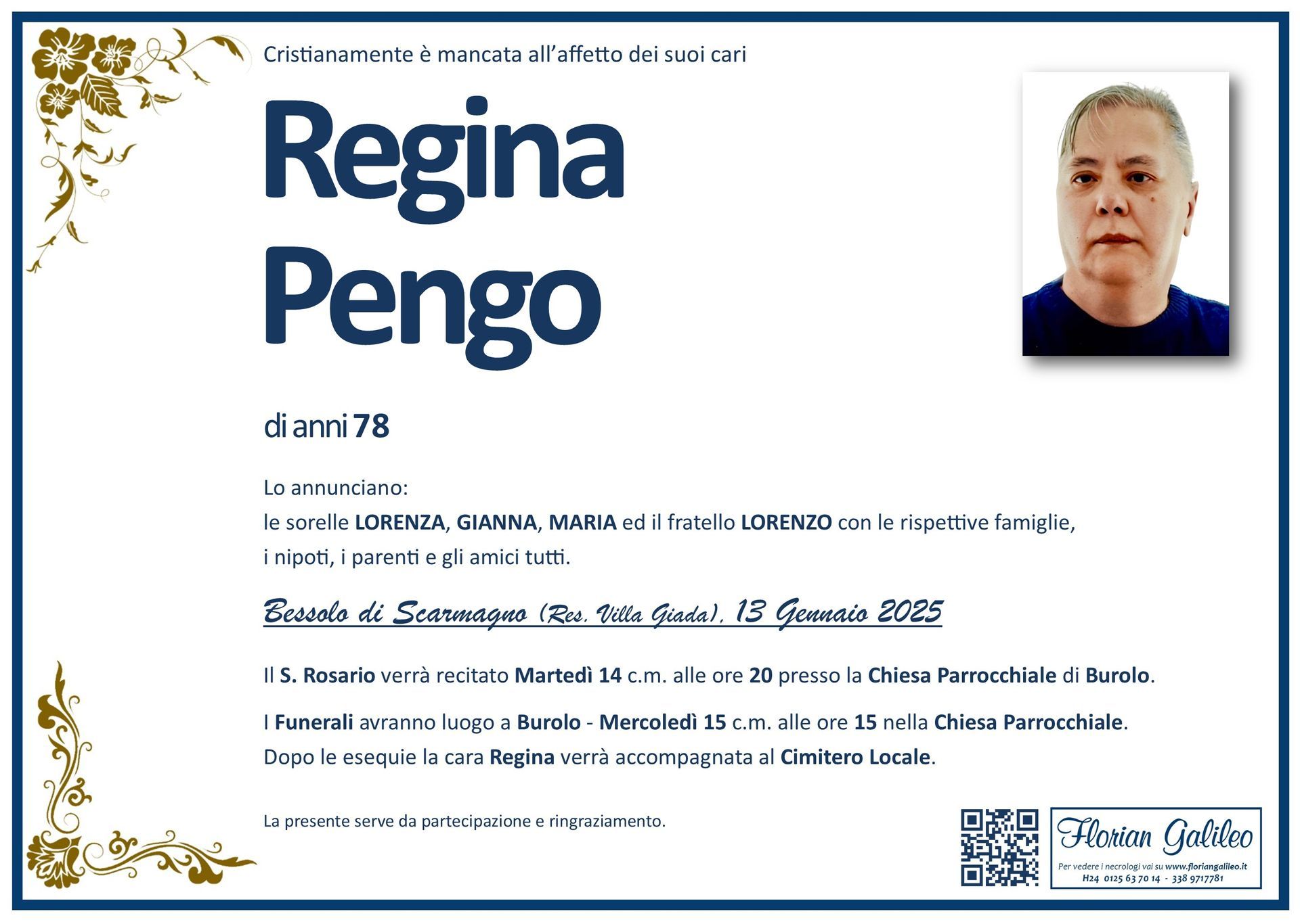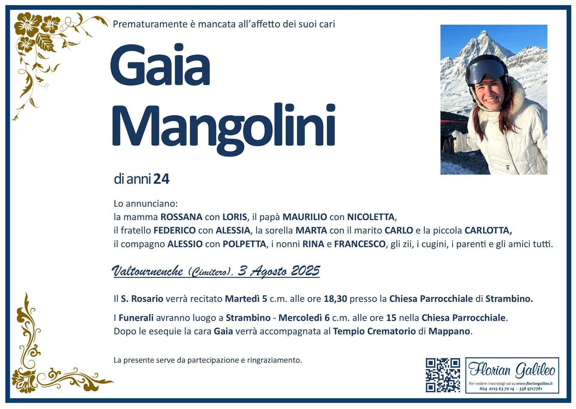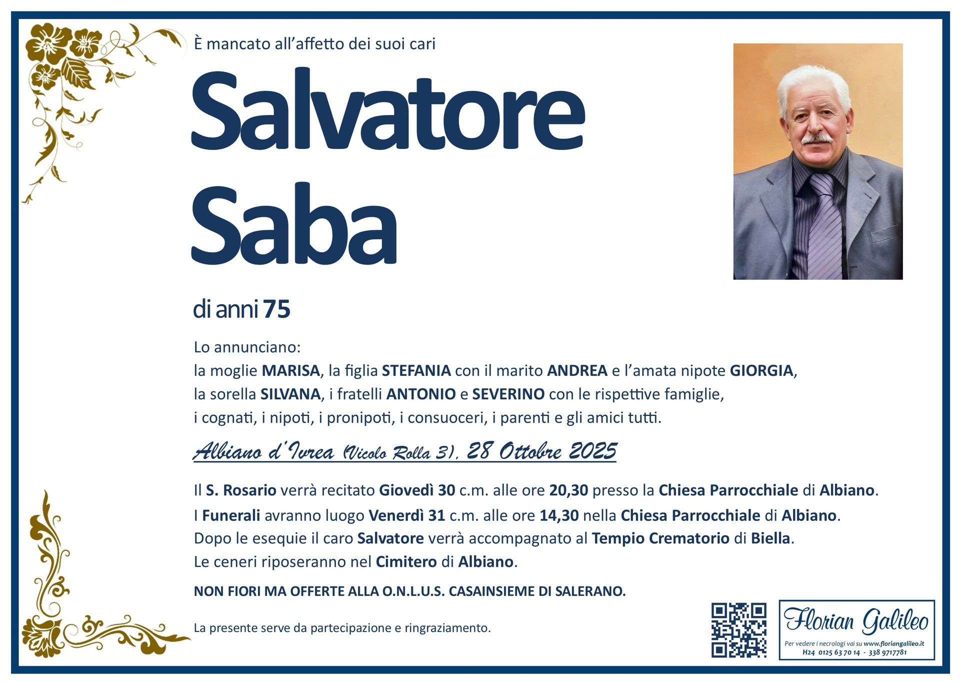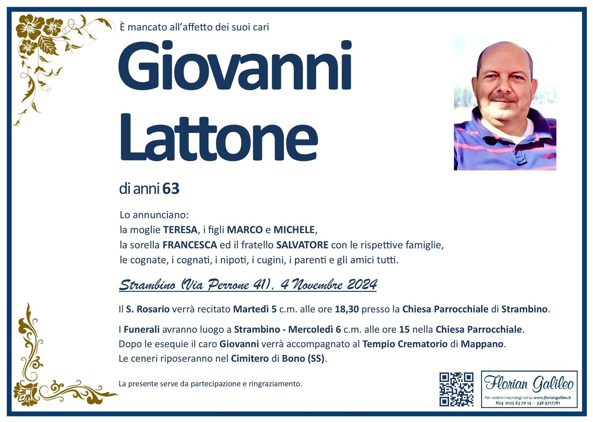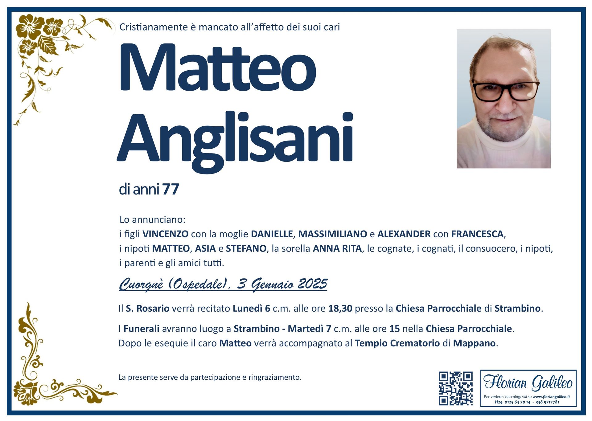 La Florian Galileo, ditta di Onoranze funebri di Strambino, Ivrea e dintorni ha creato questa pagina per rendere visibili anche on line le epigrafi dei cari defunti e per dare,