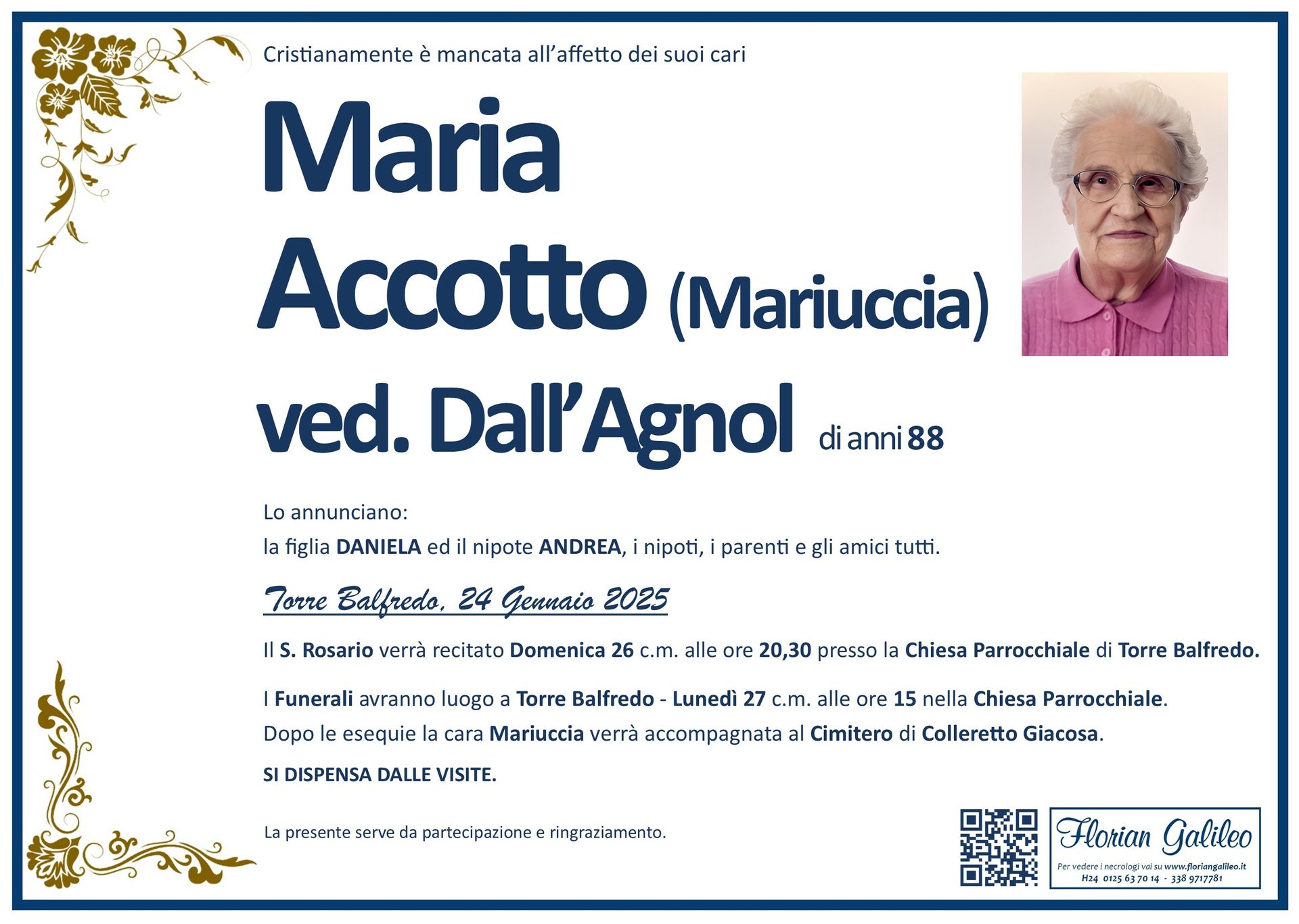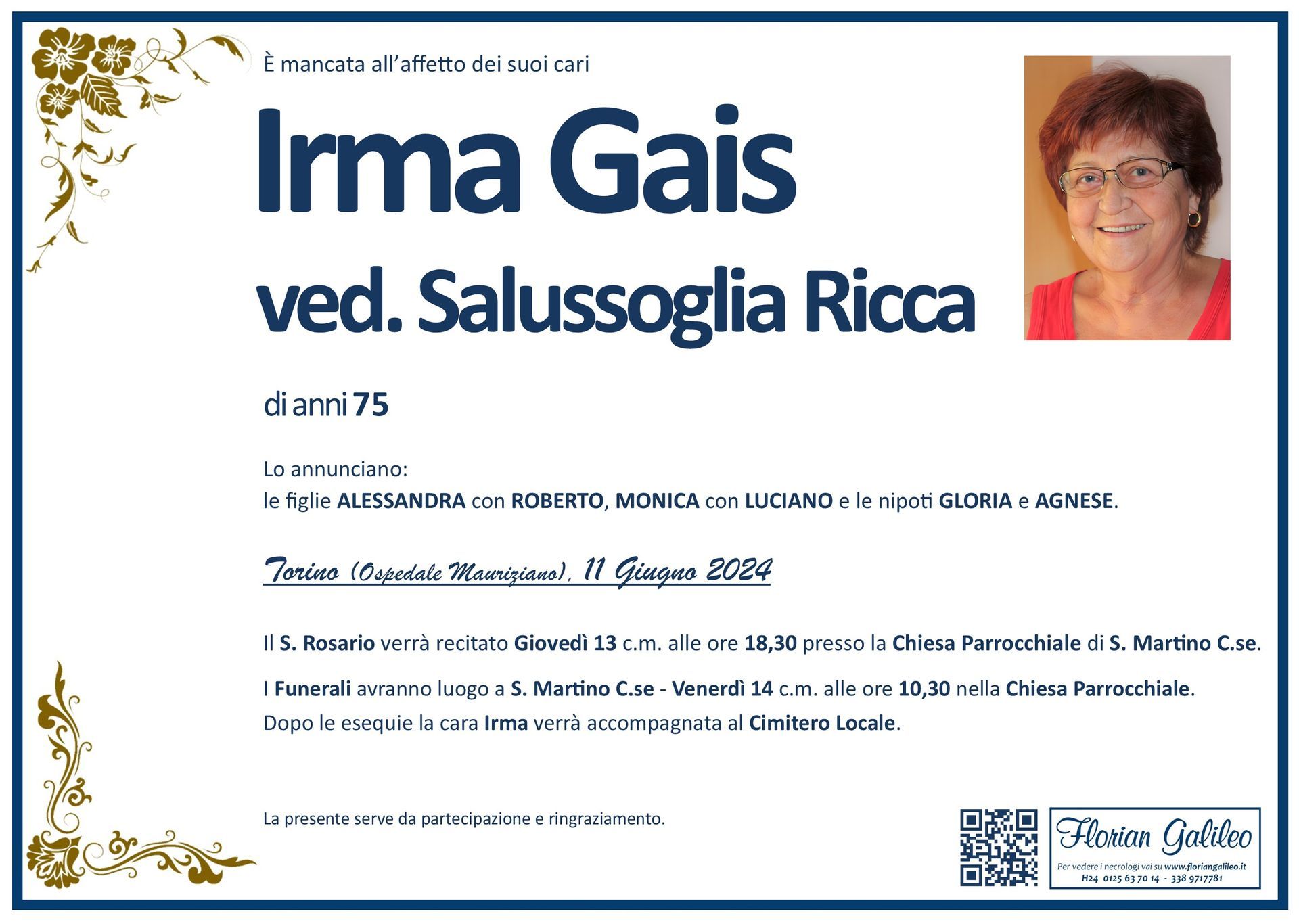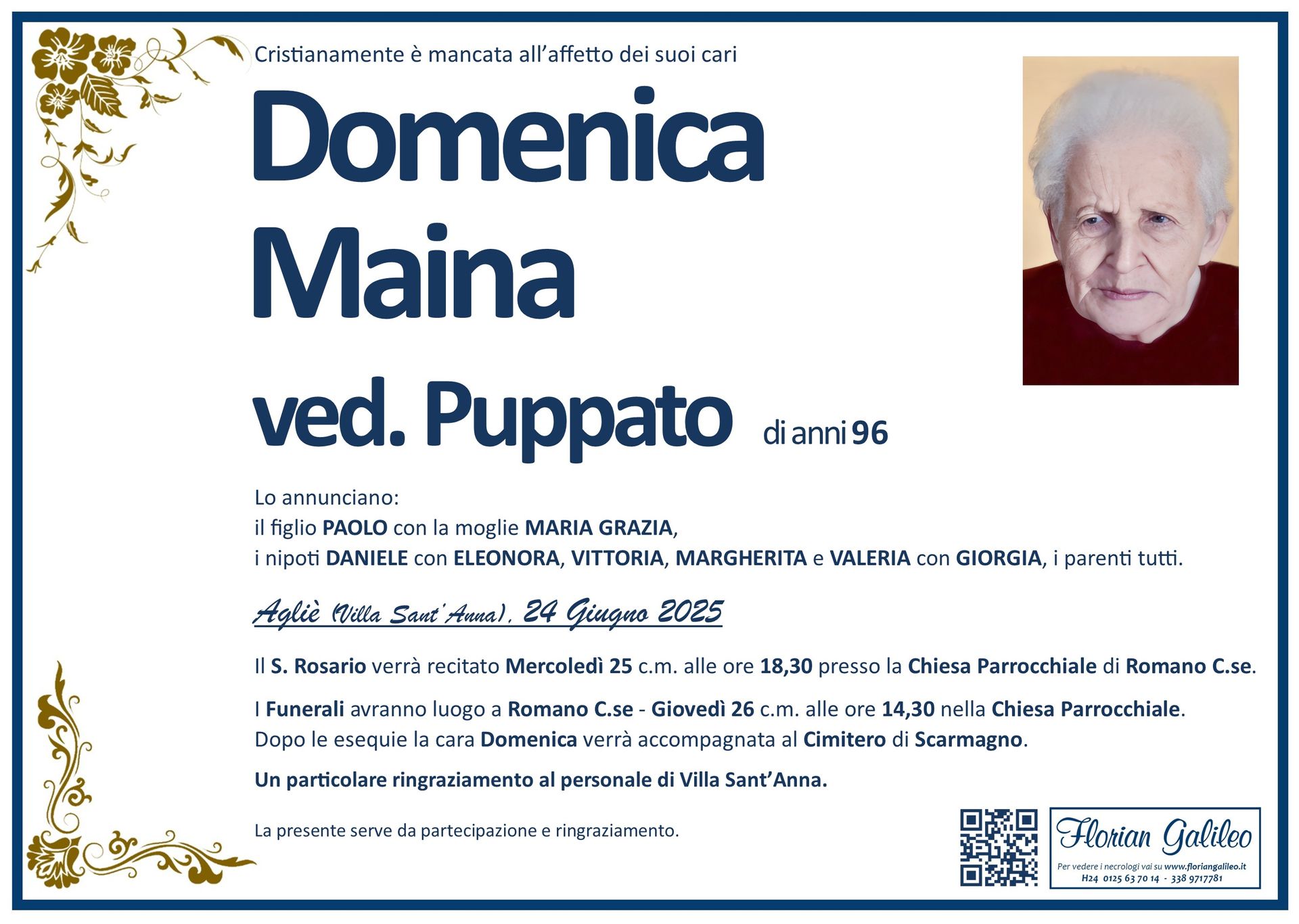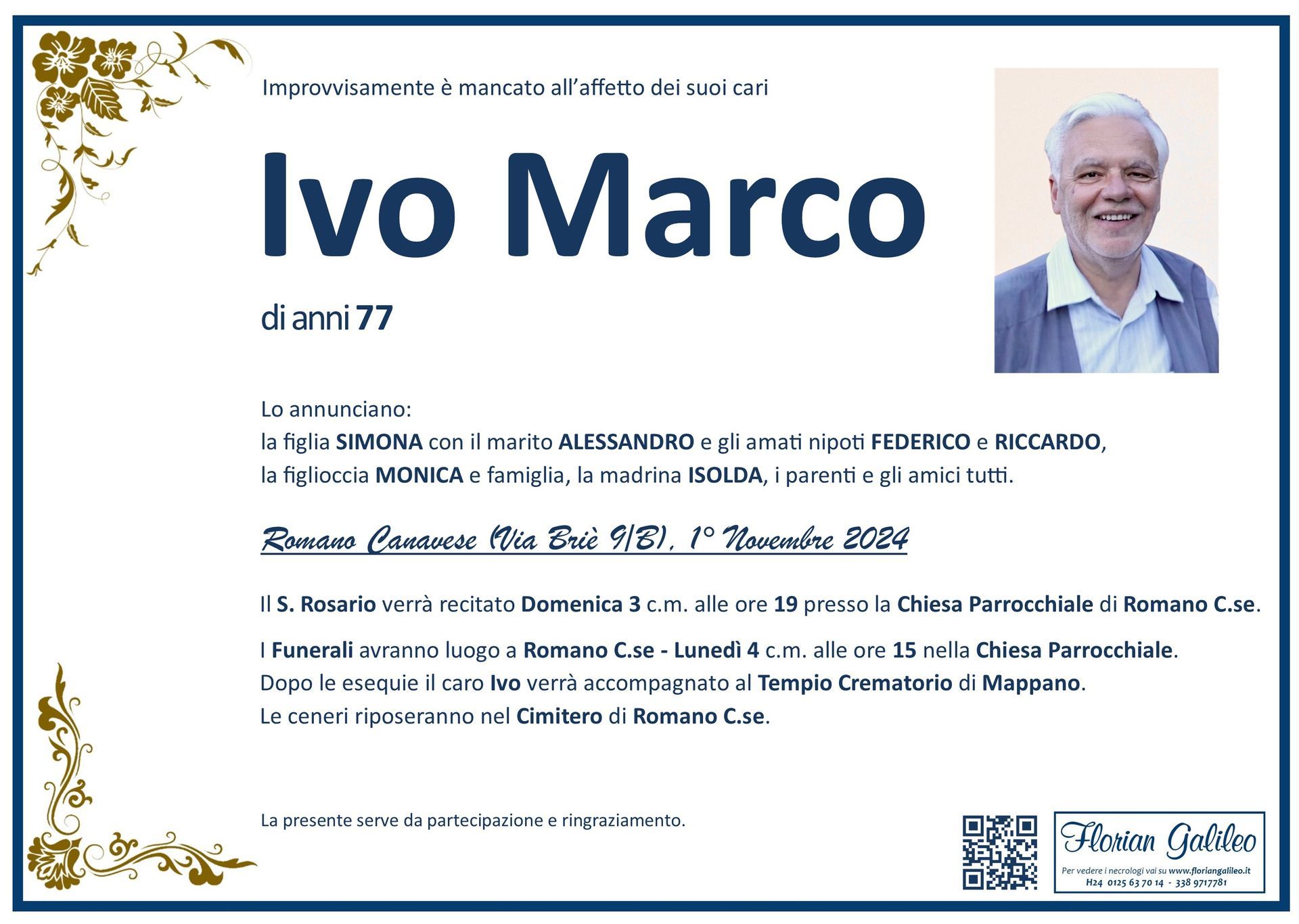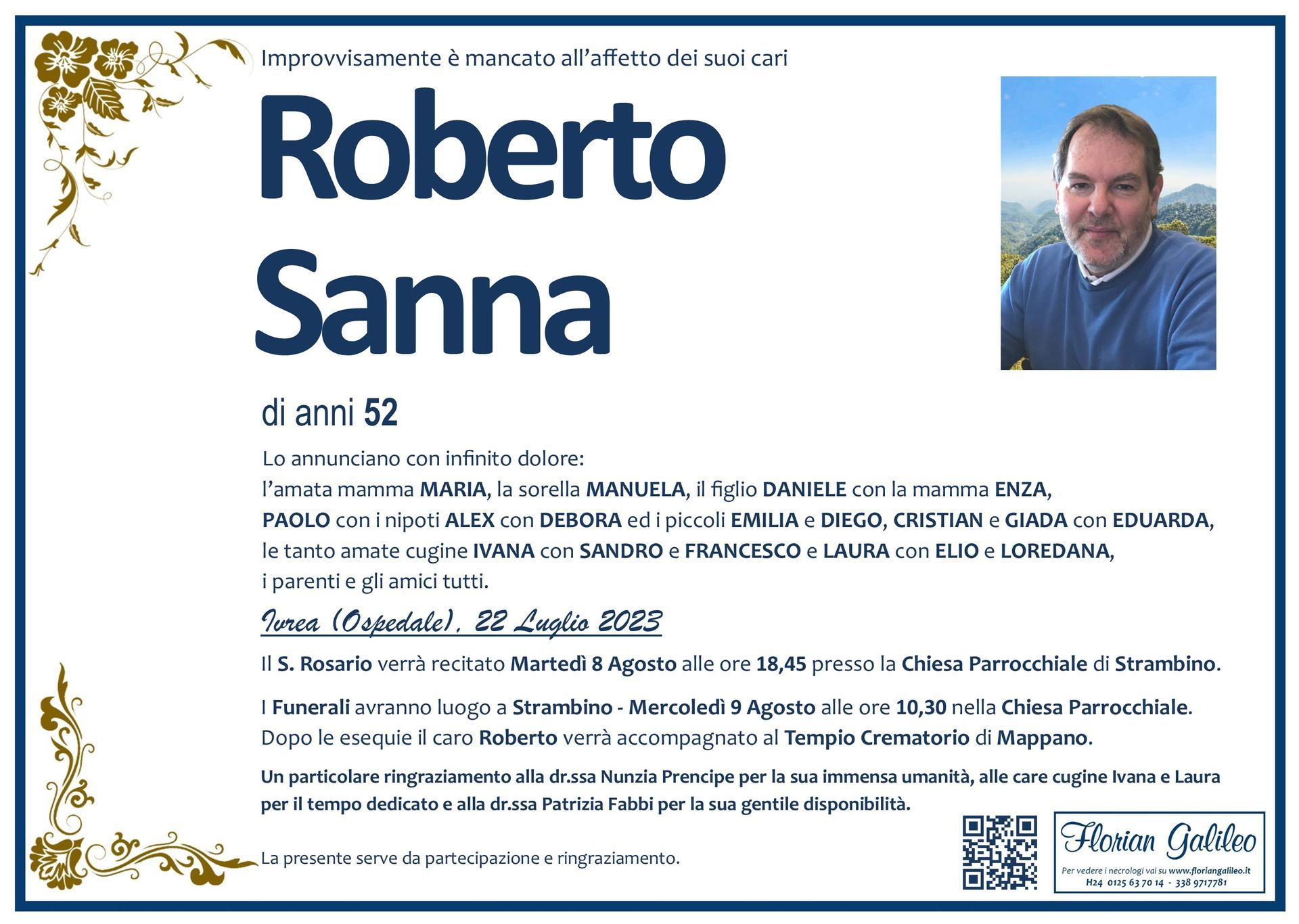 La Florian Galileo, ditta di Onoranze funebri di Strambino, Ivrea e dintorni ha creato questa pagina per rendere visibili anche on line le epigrafi dei cari defunti e per dare,